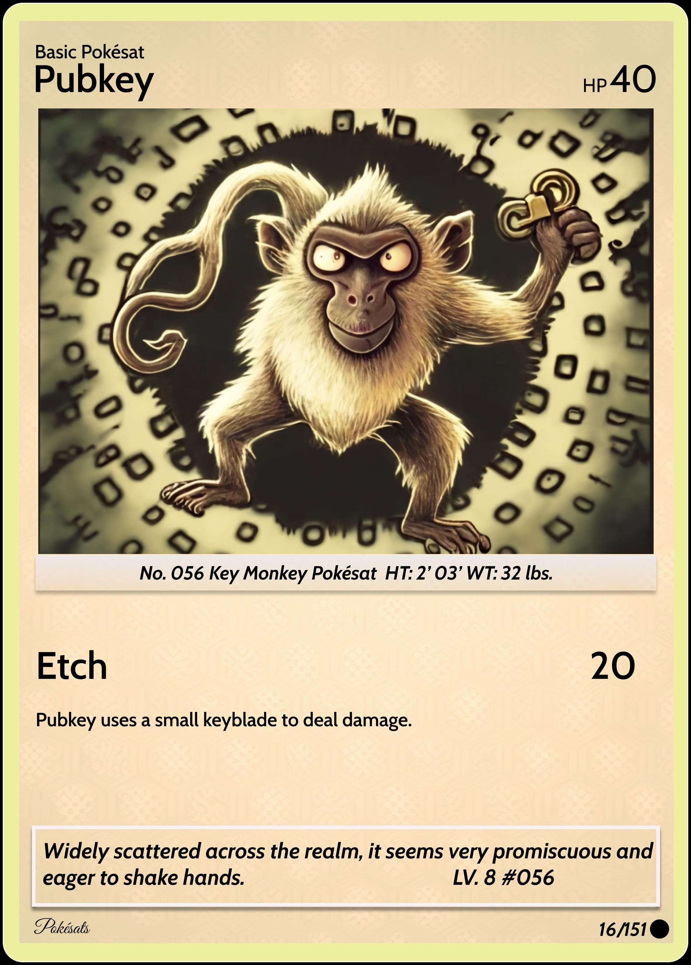On Feb 27 1996, Satoshi Tajiri introduced the world to the Pokémon franchise. 27 years later on Feb 27 2023, Prof. ACK released his discovery of mutated Pokémon using Satoshi Nakamoto's technology. Pokésats Ordinal Collection has been designed as a playable game largely inspired by the original Pokémon trading game mechanics. Once distributed, inscription holders will be able to challenge others in the Battle Arena on Pokésats discord (https://discord.gg/pokesats) and battle records will be inscribed on an official scoreboard. Good luck to all the adventurous trainers out there!