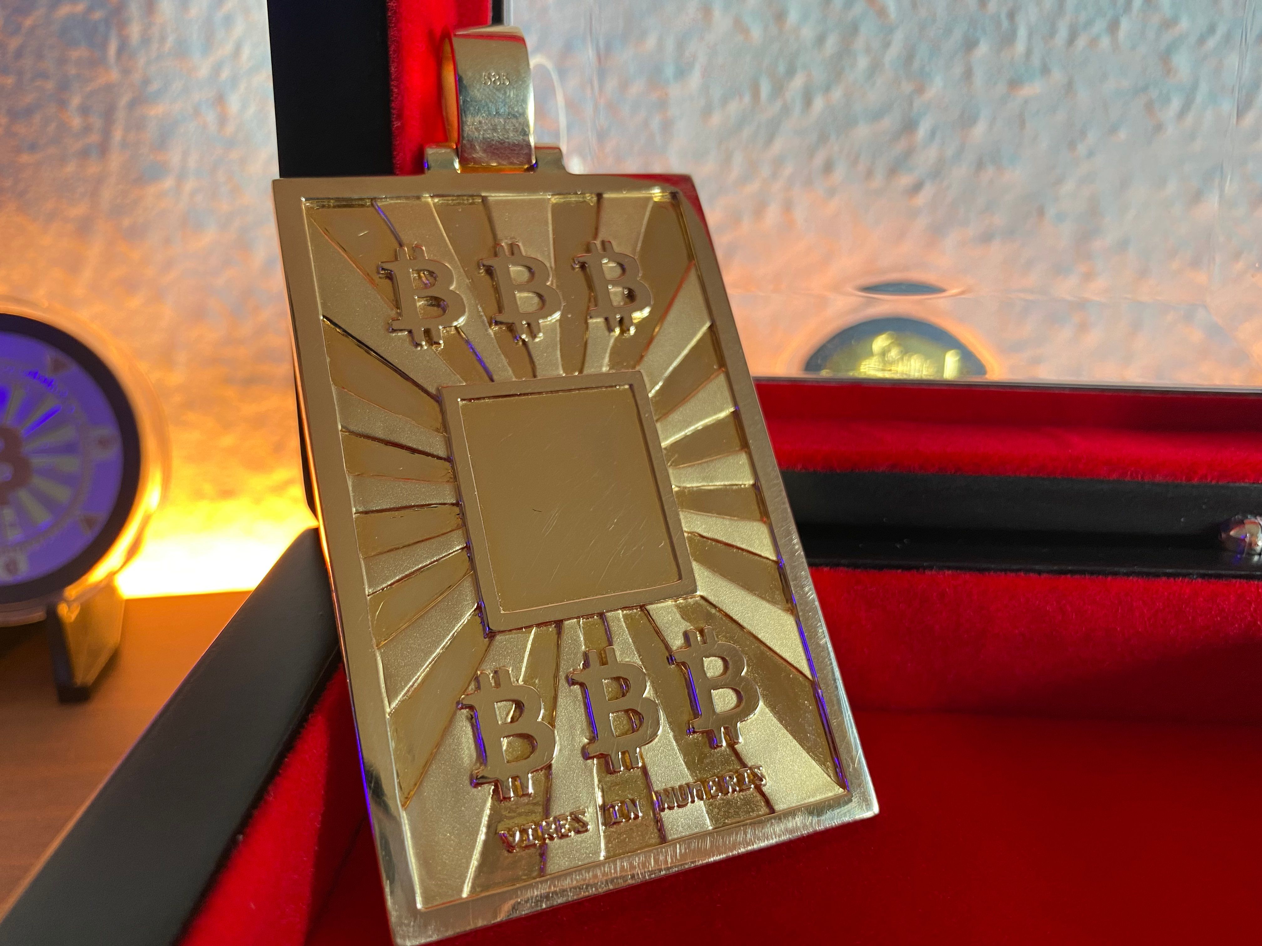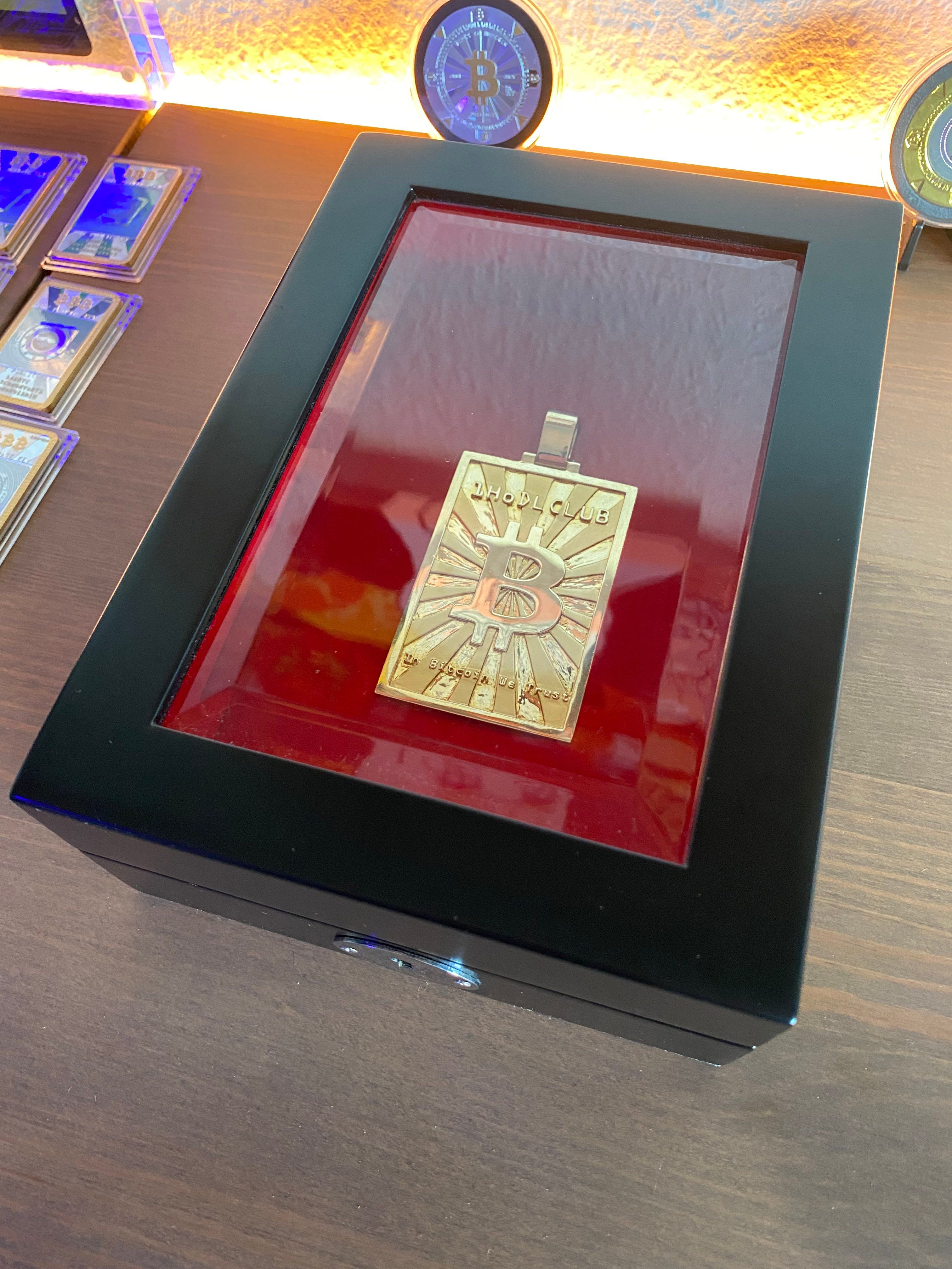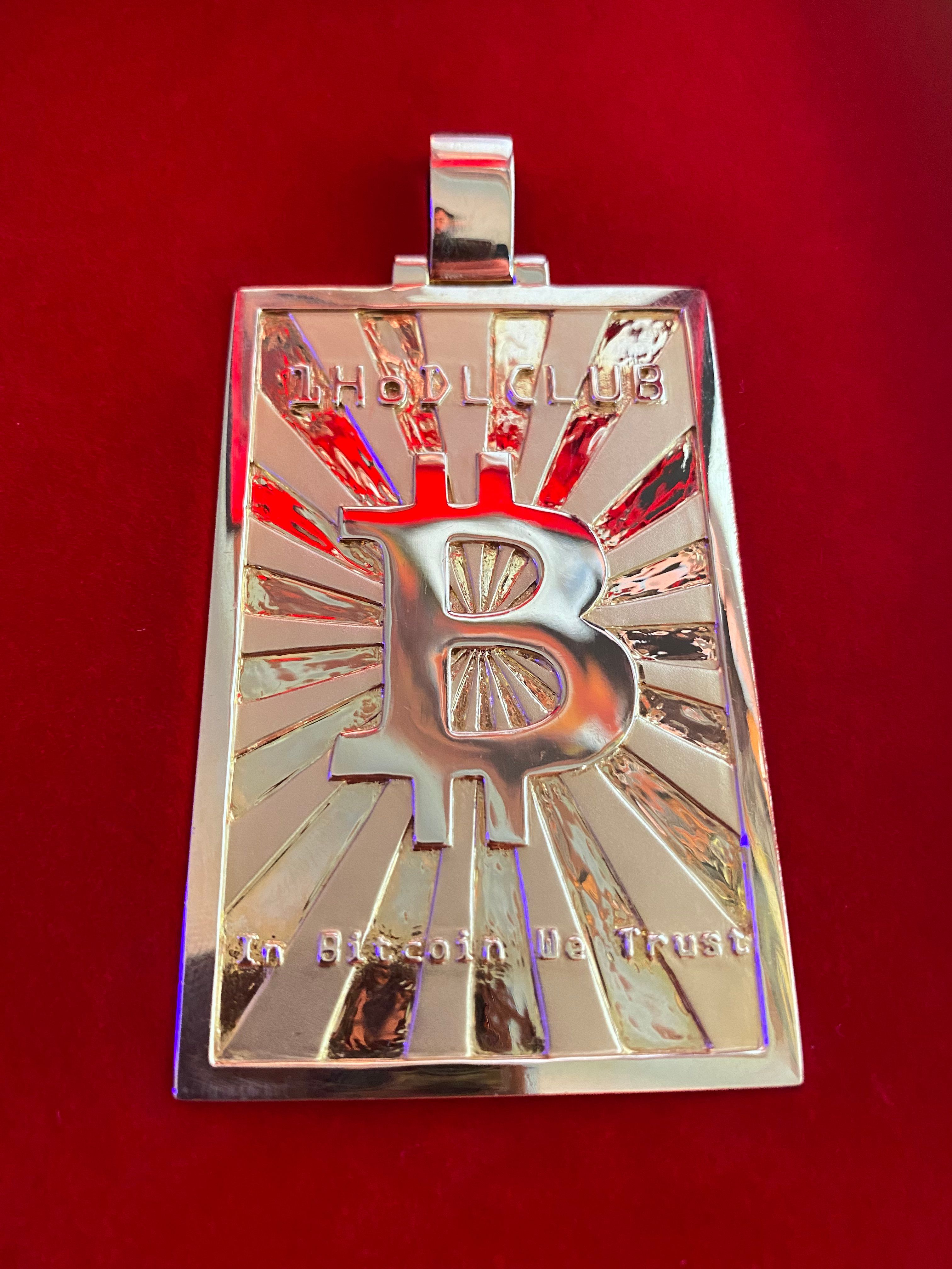 1HODLCLUB presents the unique 1/1 prototype of the Bitcoin Gold pendant. This is the only prototype produced, composed of 66.38gr of 14K gold. It is heavy and imposing with its size of 45x70mm!