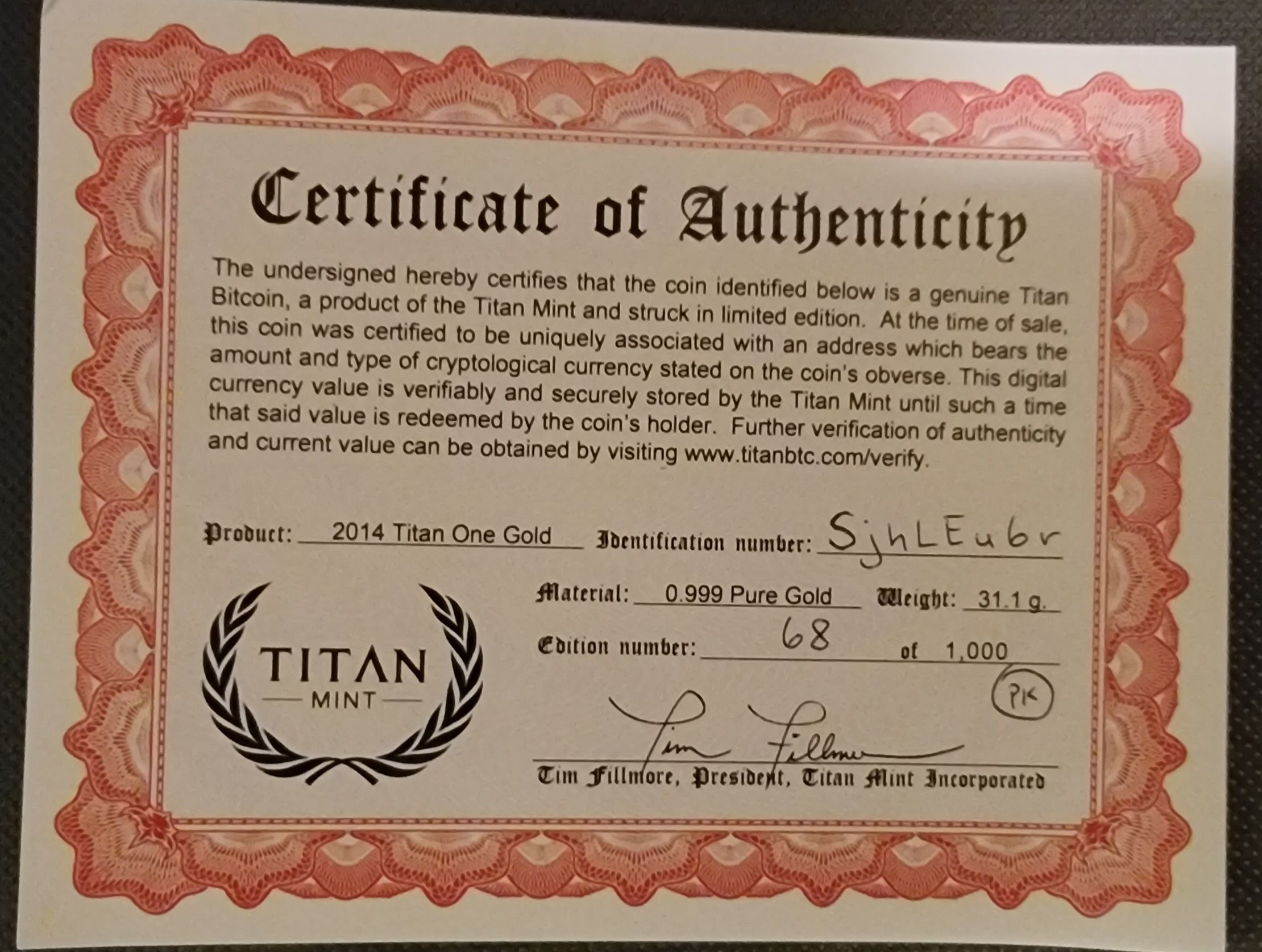 From Titan Bitcoin comes their first 1oz gold coin loaded with 1 BTC, which was produced in 2014. The coin features a QR code on the hologram that takes you to the Titan website which shows the coins public address and load status.
