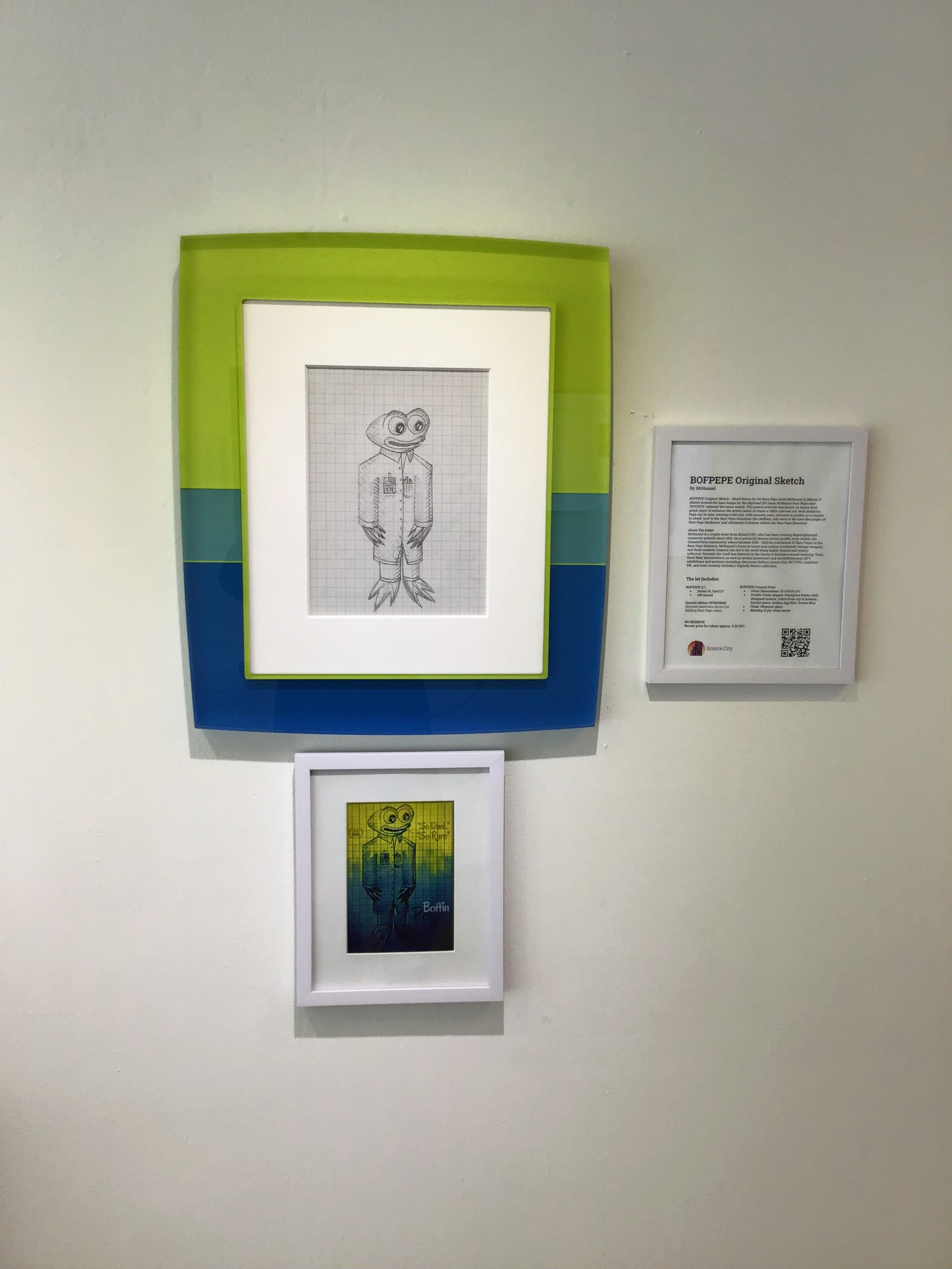 BOFPEPE Original Sketch - Hand Drawn by OG Rare Pepe artist MrHansel in March 17. Sketch formed the base image for the digitised 100 issue MrHansel Rare Pepe card 'BOFPEPE' released the same month. This pencil artwork was drawn on heavy duty graph paper to enhance the artists intent to create a 1950s cold war era 'tech' aesthetic. Pepe can be seen wearing a lab coat, with security pass, and pens in pocket, as a tongue in cheek 'nod' to the Rare Pepe Scientists (the Boffins), who were at the time the judges of Rare Pepe Dankness, and ultimately inclusion within the Rare Pepe Directory.