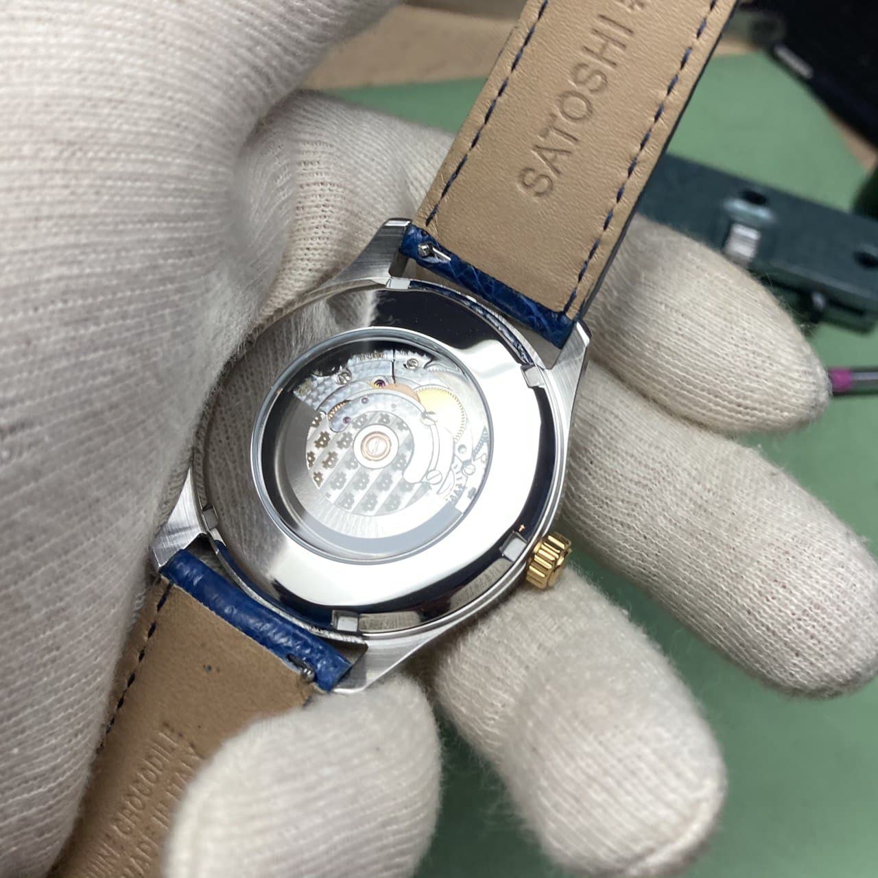 Handmade Swiss 1 of 1 automatic watch. White-silver dial, with gold applied indices and Bitcoin pattern designed and painted by Chris Alexander of The Dial Artist.