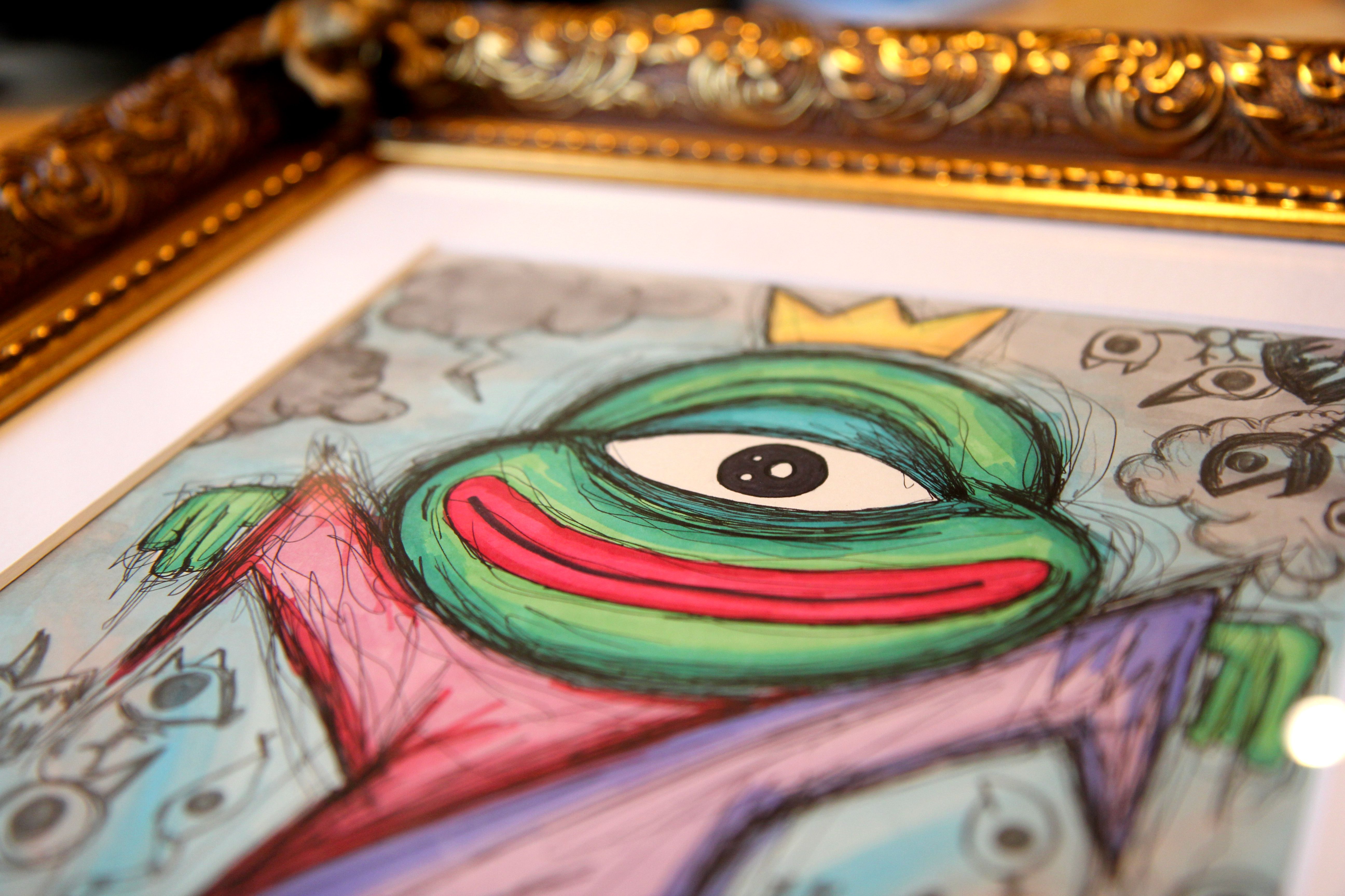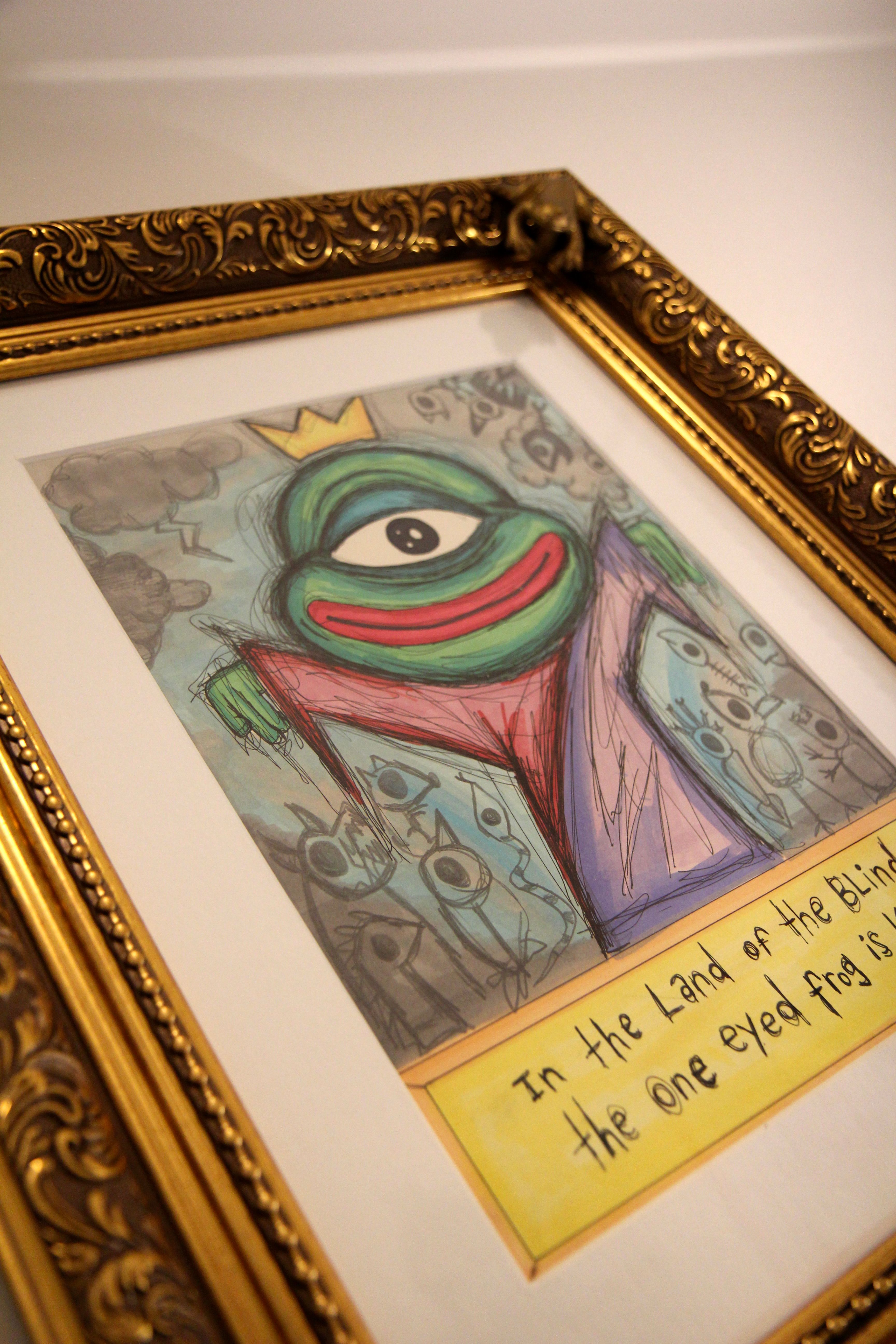 Original hand drawn Dank Rare Pepe with stunning custom built golden frog frame