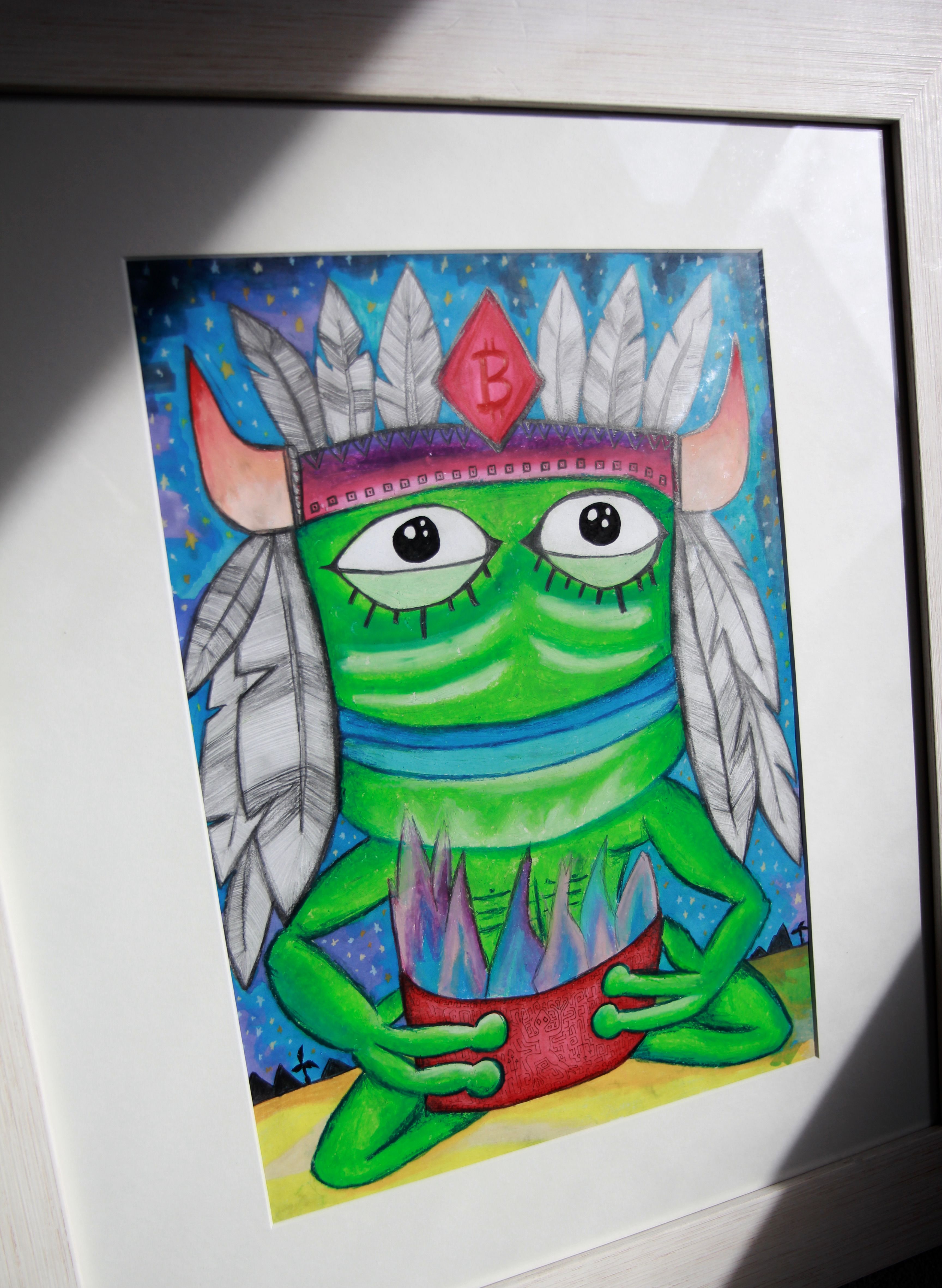 The piece has been professionally framed & mounted in a beautiful white wooden frame. It is signed & dated by Zima Blue on the reverse. The physical artwork comes with a limited 1/21 edition PEPESHAMAN NFT plus a 1/1 locked sub asset which represents the original artwork - PEPESHAMAN.ORIGINAL