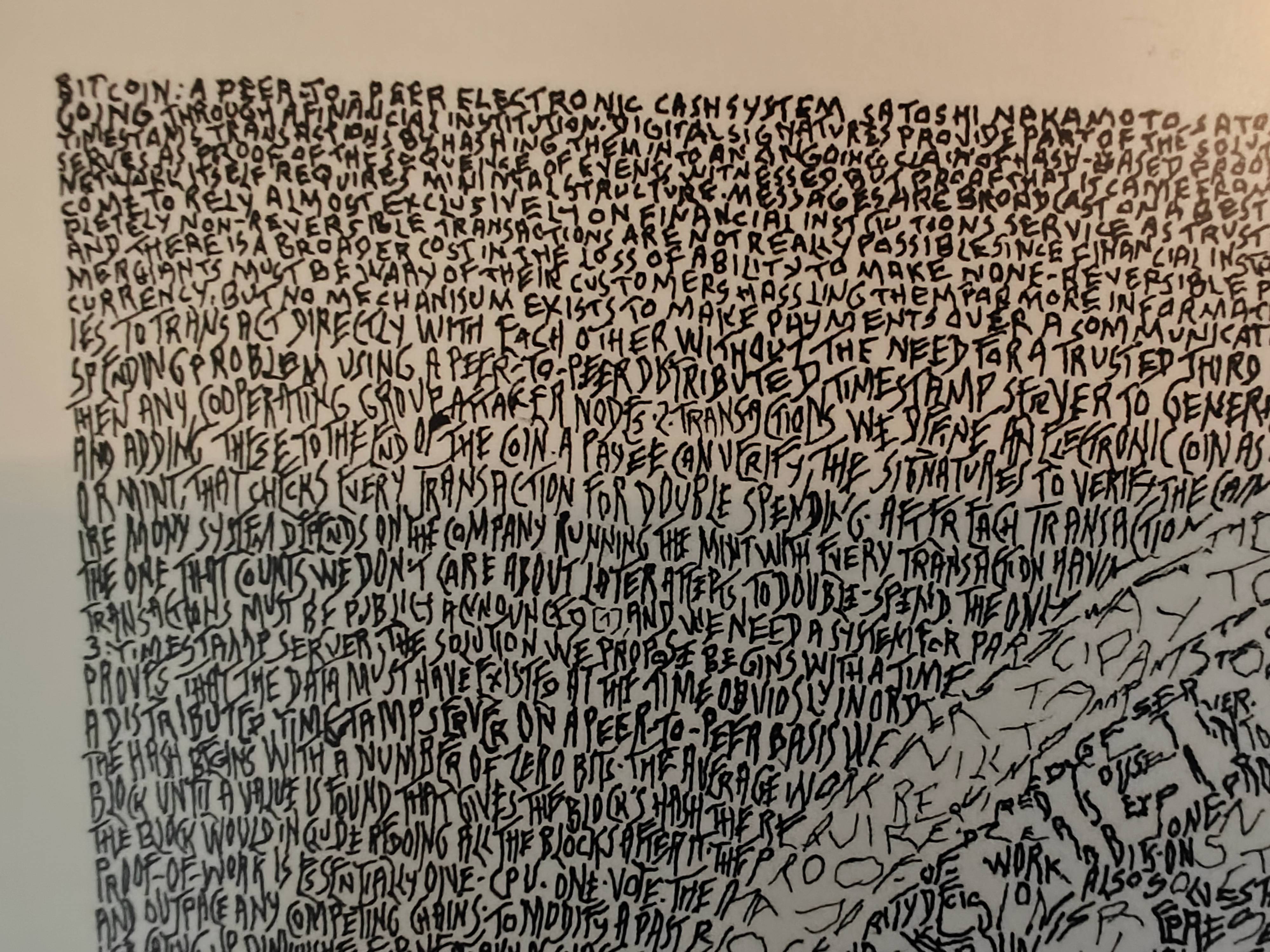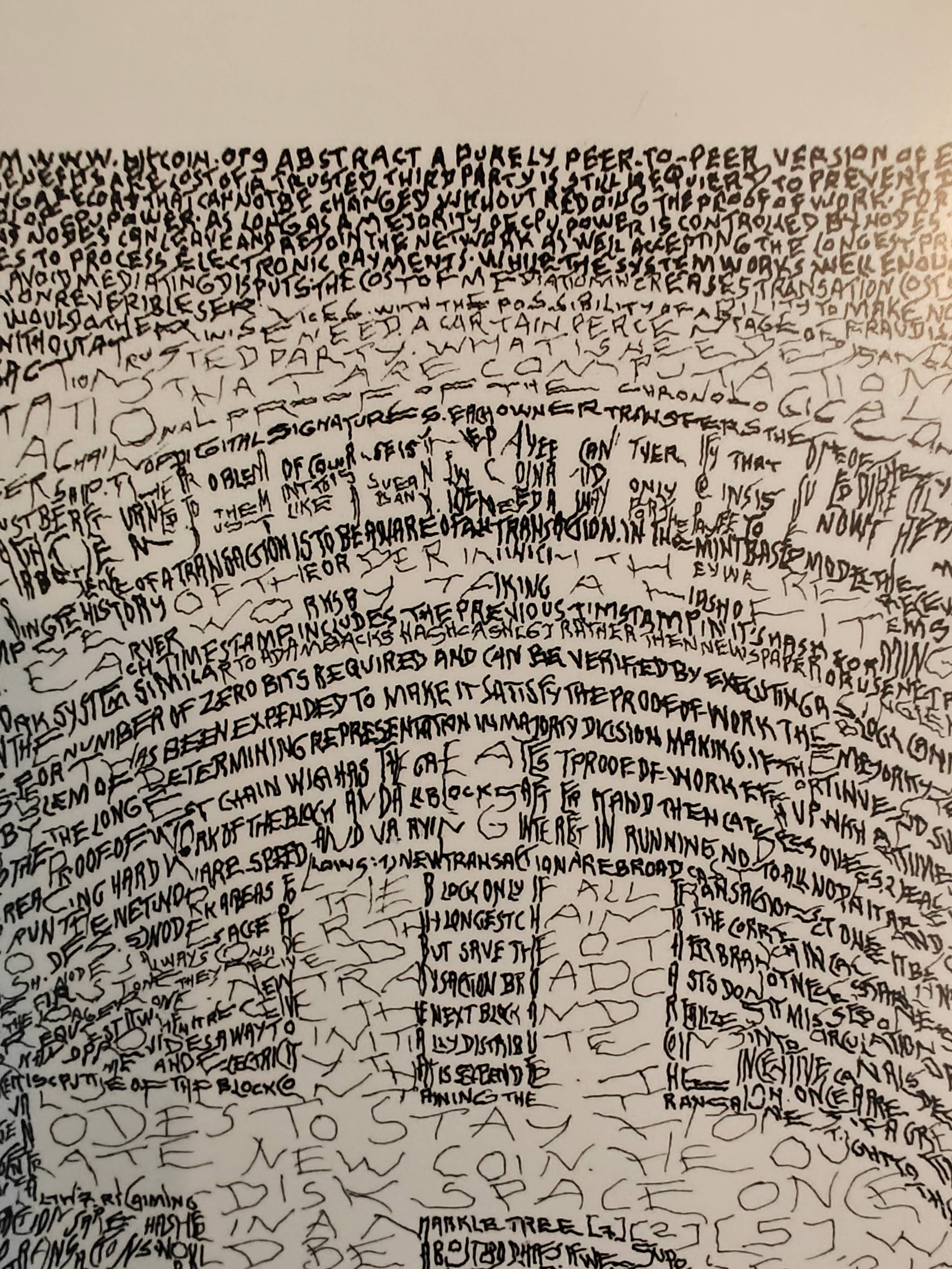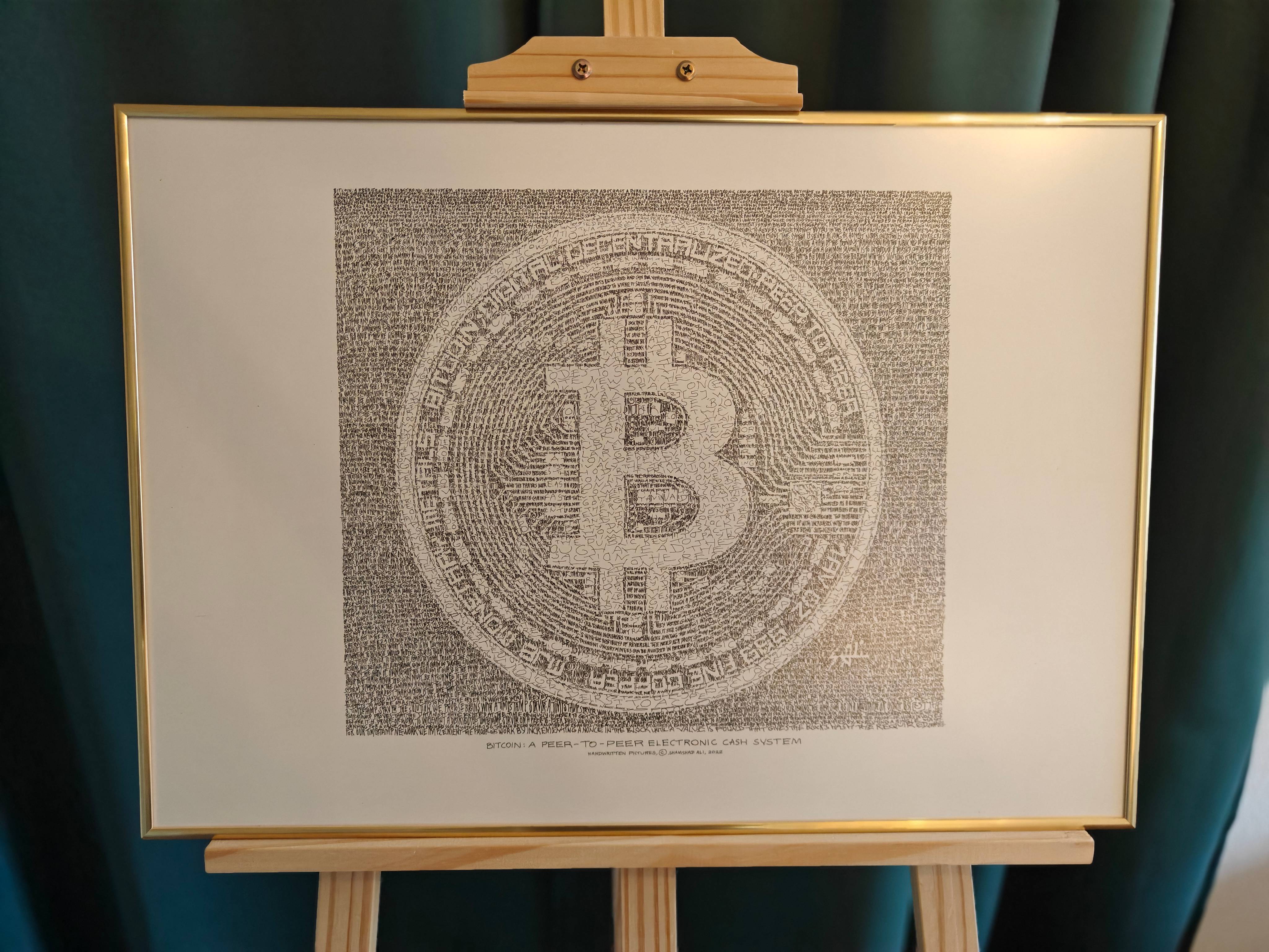 This artwork is based entirely on the Bitcoin Whitepaper, written out by hand, word for word, using a 0.15 mm pen. From close range, the viewer can read the text like a book. From a distance, the dense micro-calligraphy resolves into the instantly recognizable portrait of the famous Bitcoin logo.
