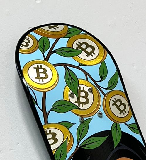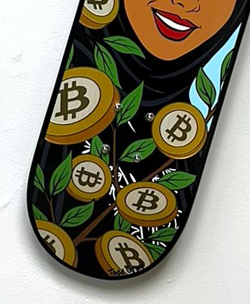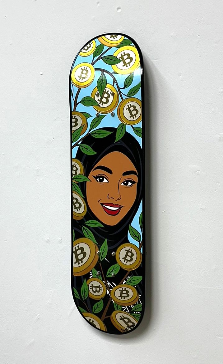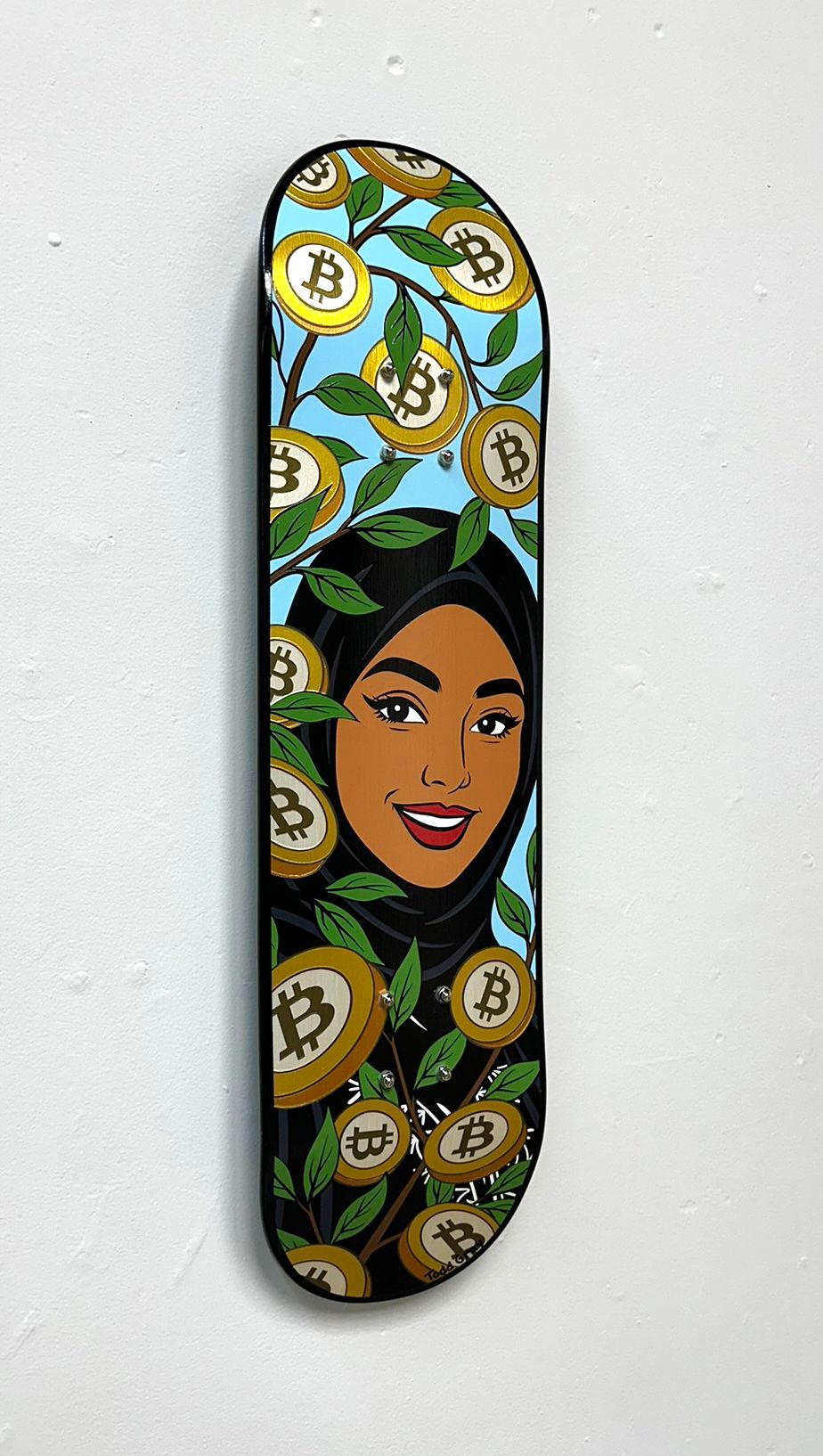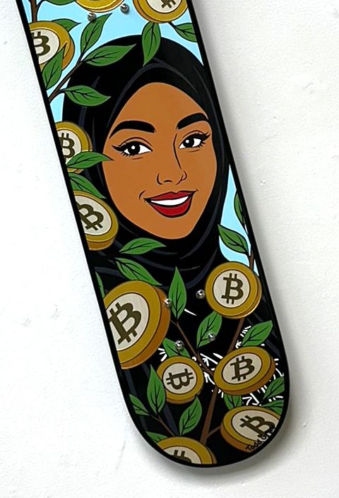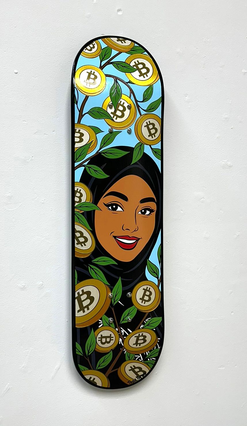 Aisha. I wanted to paint a beautiful muslim woman in a hijab inside a tree full of oranges. The end result was even better….I decided to exchange the oranges for golden Bitcoins. The Bitcoins are painted in four different shades of pearlescent gold. In different light, they actually glow like real gold coins and surround her pretty face in perfect fashion. This piece was painted special for Mena.