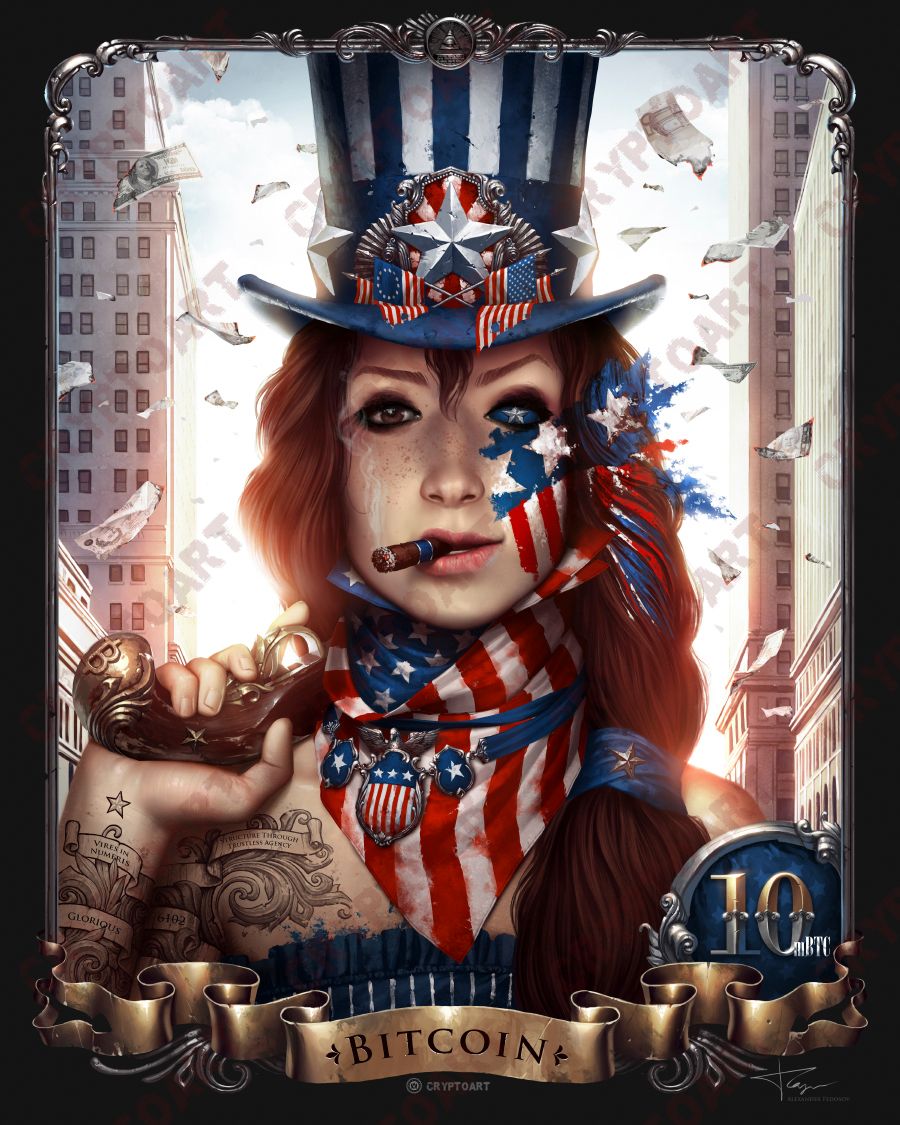 The Patriot, Chinese Girl, and The Nun were created by artist Alexander Fedosov. Alexander was a Ukrainian illustrator that excelled in hyper detailed dark fantasy art. He was one for the first artists to contribute to the cryptocurrency movement, and he created the cover for Bitcoin Magazine issue #21. His current whereabouts are unknown.