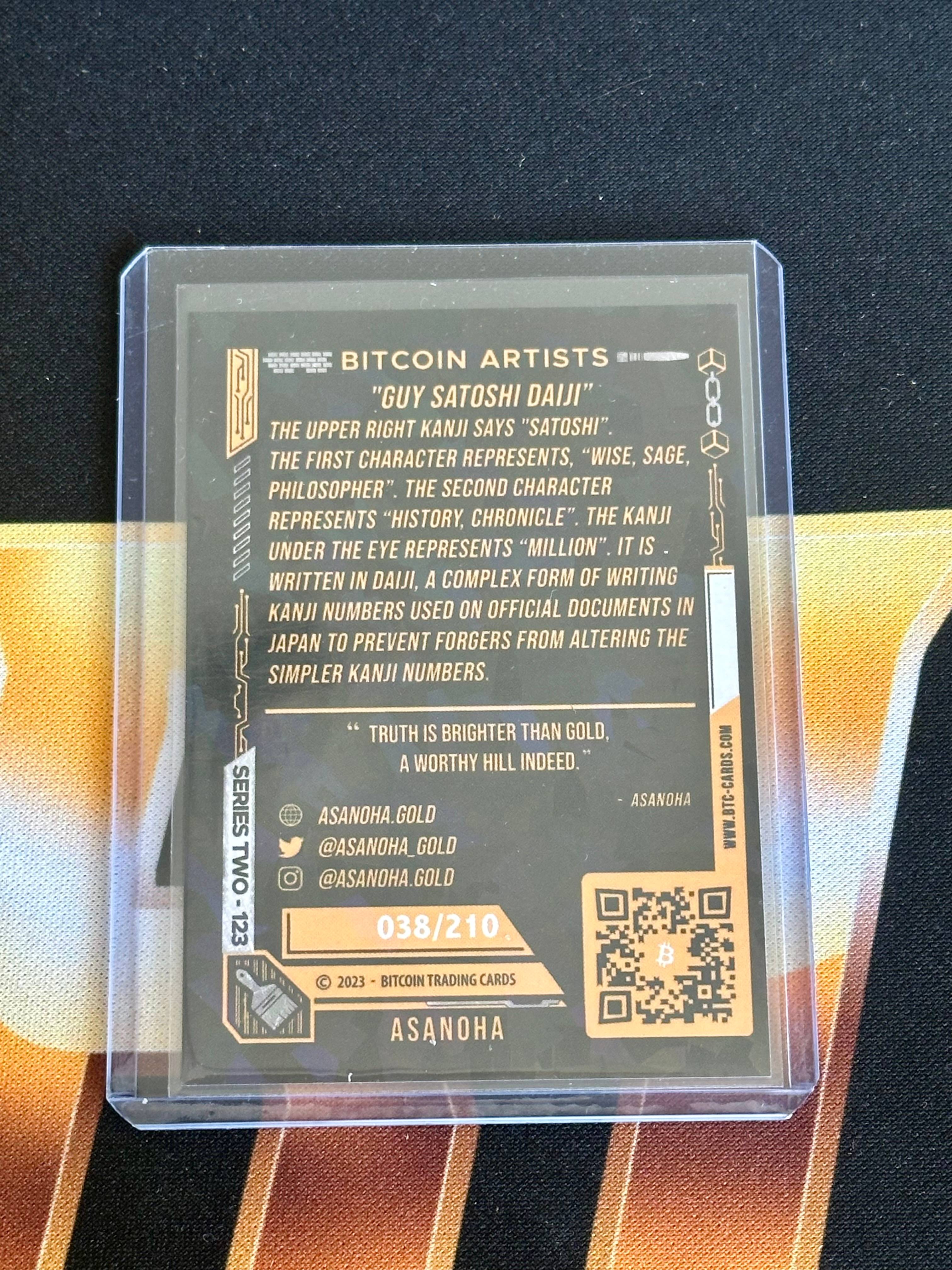 This Asanoha #38/210 Bitcoin Artist card from S2 OPP is an exceptional card created by a renowned Bitcoin artist, showcasing the fusion of traditional design and modern Bitcoin culture. With only 210 editions, this card is a rare work of art that appeals to collectors who value the artistry within Bitcoin’s community. As #38, this piece holds both aesthetic and collectible appeal, perfect for those who want to own a tangible piece of Bitcoin’s artistic movement.
