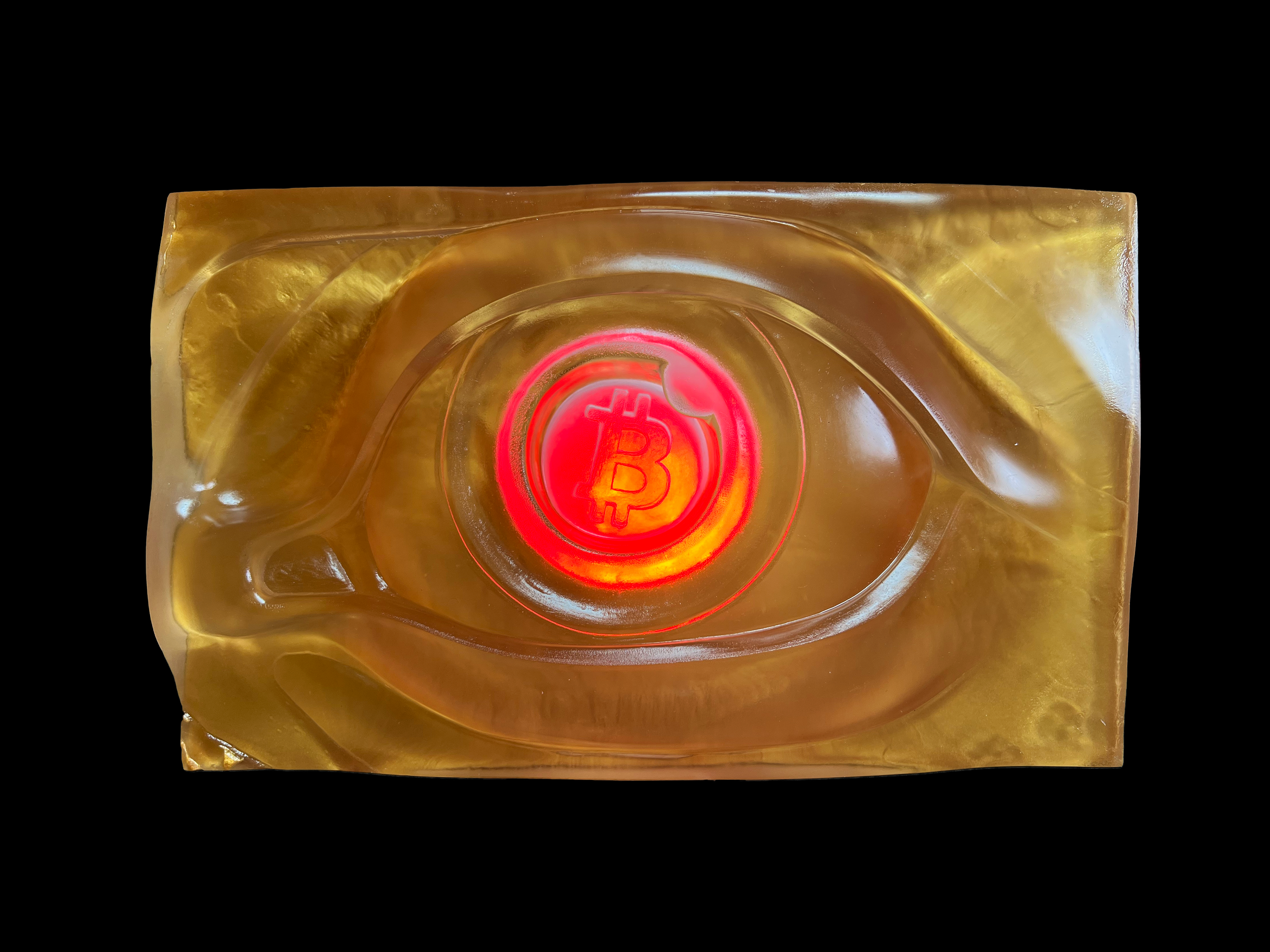A clear and gold resin cast of Brekkie von Bitcoin's marble sculpture, "Awakening." This version is a multilayer resin pour and features a clear window in the center behind which LED lights can be placed to create a laser eye effect.