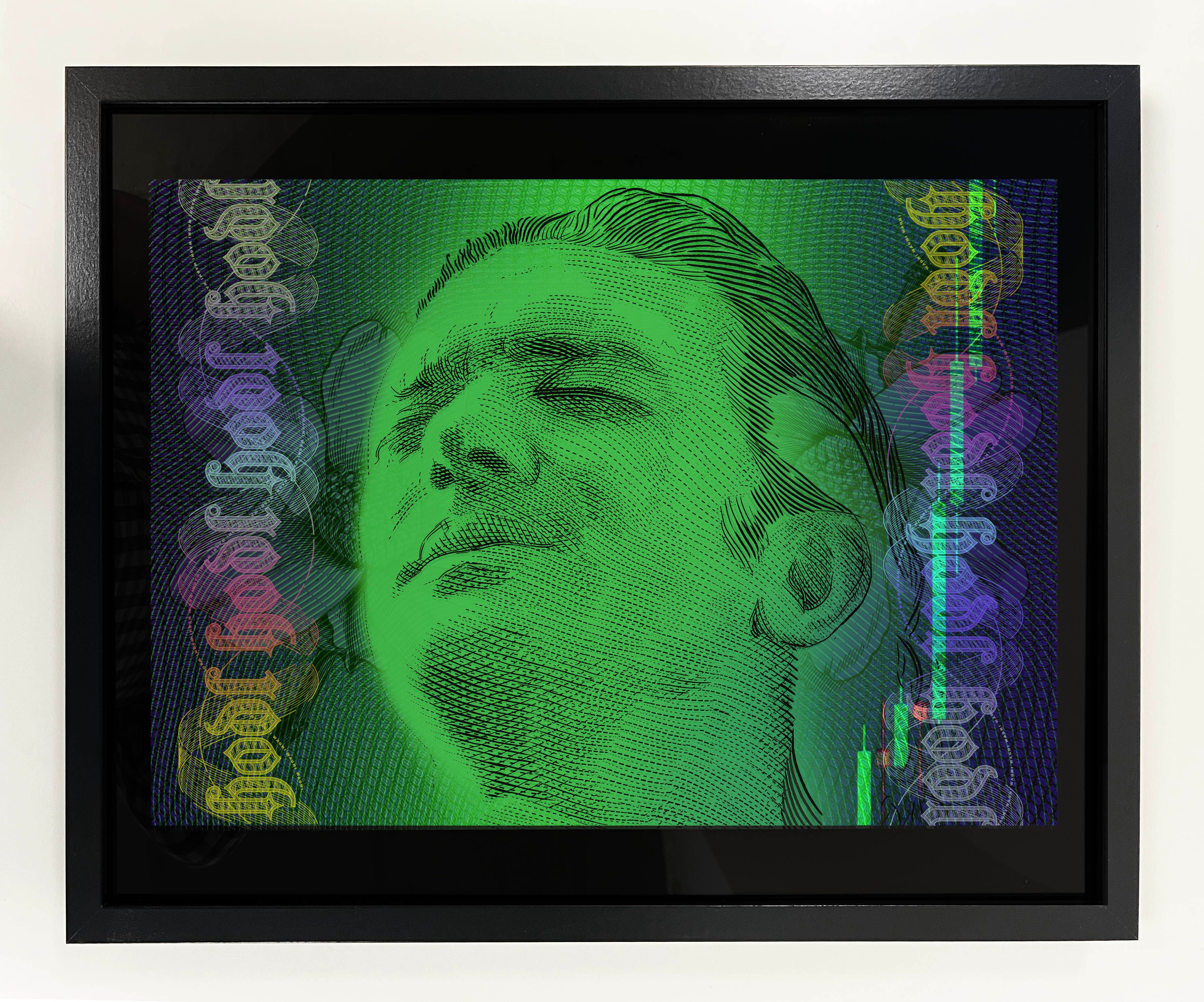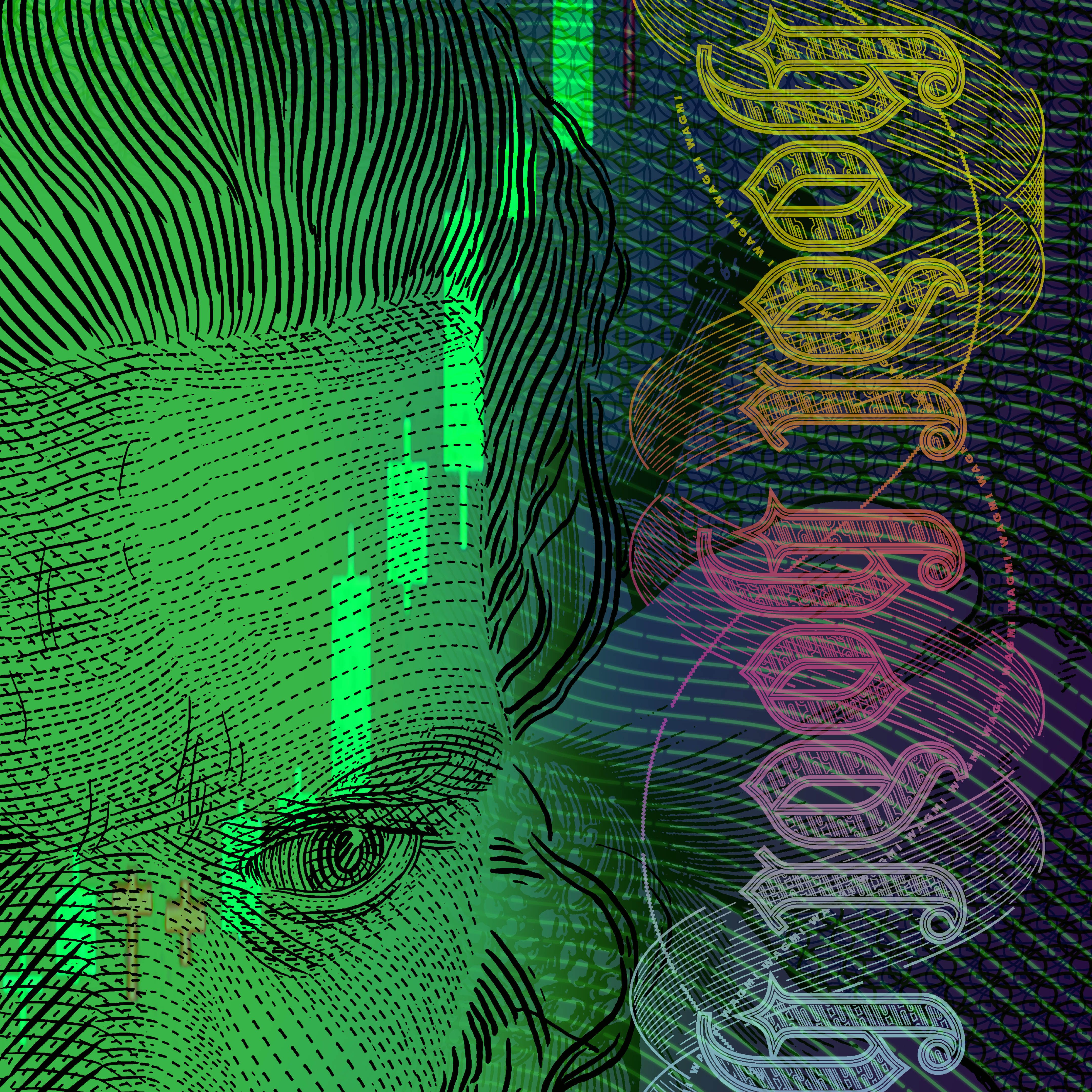 Originally a sketch for a banknote design portrait, this collection of three prints are portraits of the often used gif of Antonio Banderas. The clip is sometimes used in reference to crypto price action. Across the three prints, a bitcoin bull run is presented as candlesticks, peaking in the top right corner. Other elements reference authentic banknote design patterns. The three prints are sold as one work.
