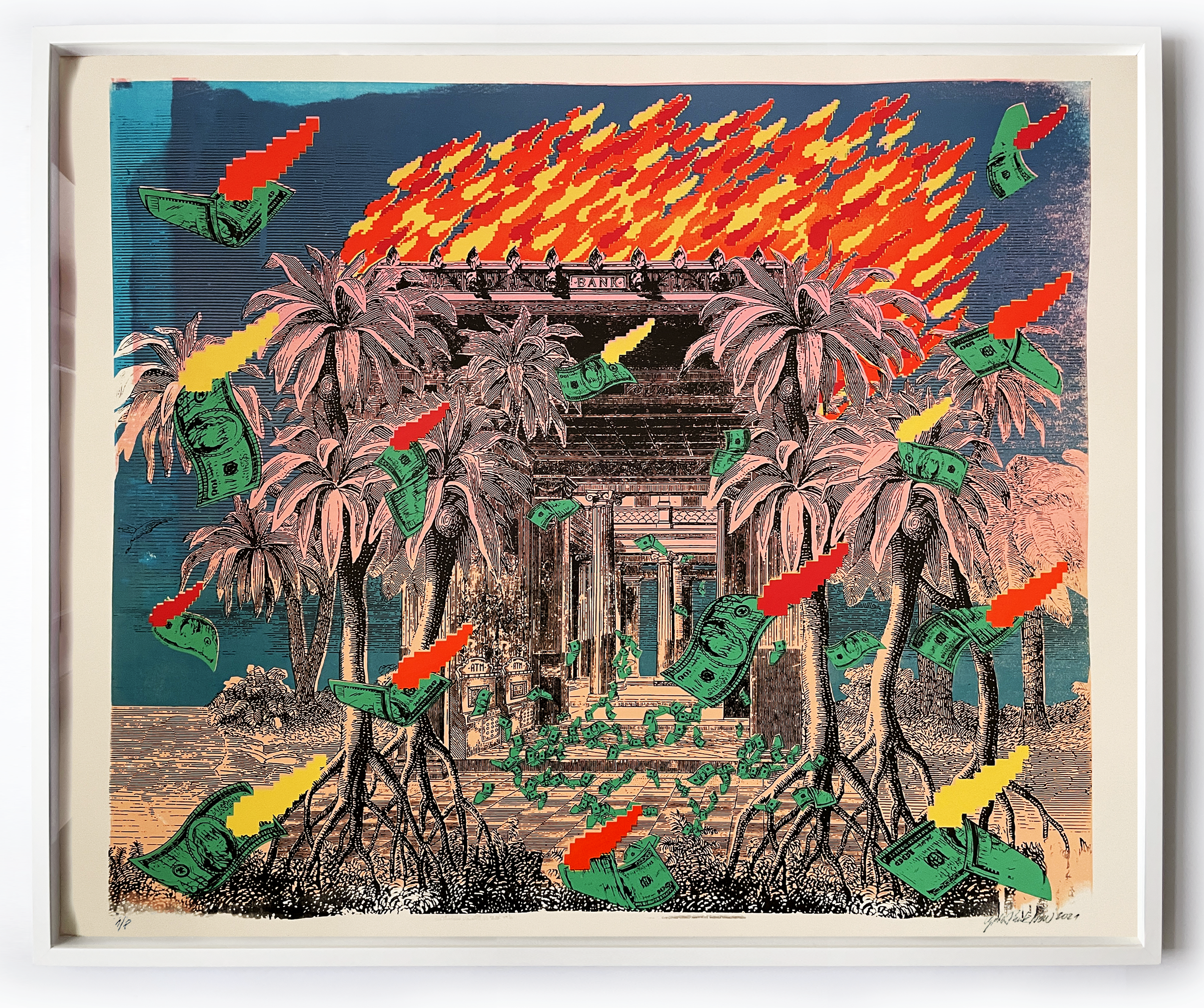 BANK ON FIRE 1/8 My latest screen-print from 2021 follows the Bitcoin White Paper series, capturing the minutes after the Bitcoin meteorite hit, the bankster dinosaurs have gone and the bank is on fire... Printed in an edition of only 8 copies and stored in my vault for such a special moment as the Bitcoin 2022 art auction where I am releasing print number 1/8.