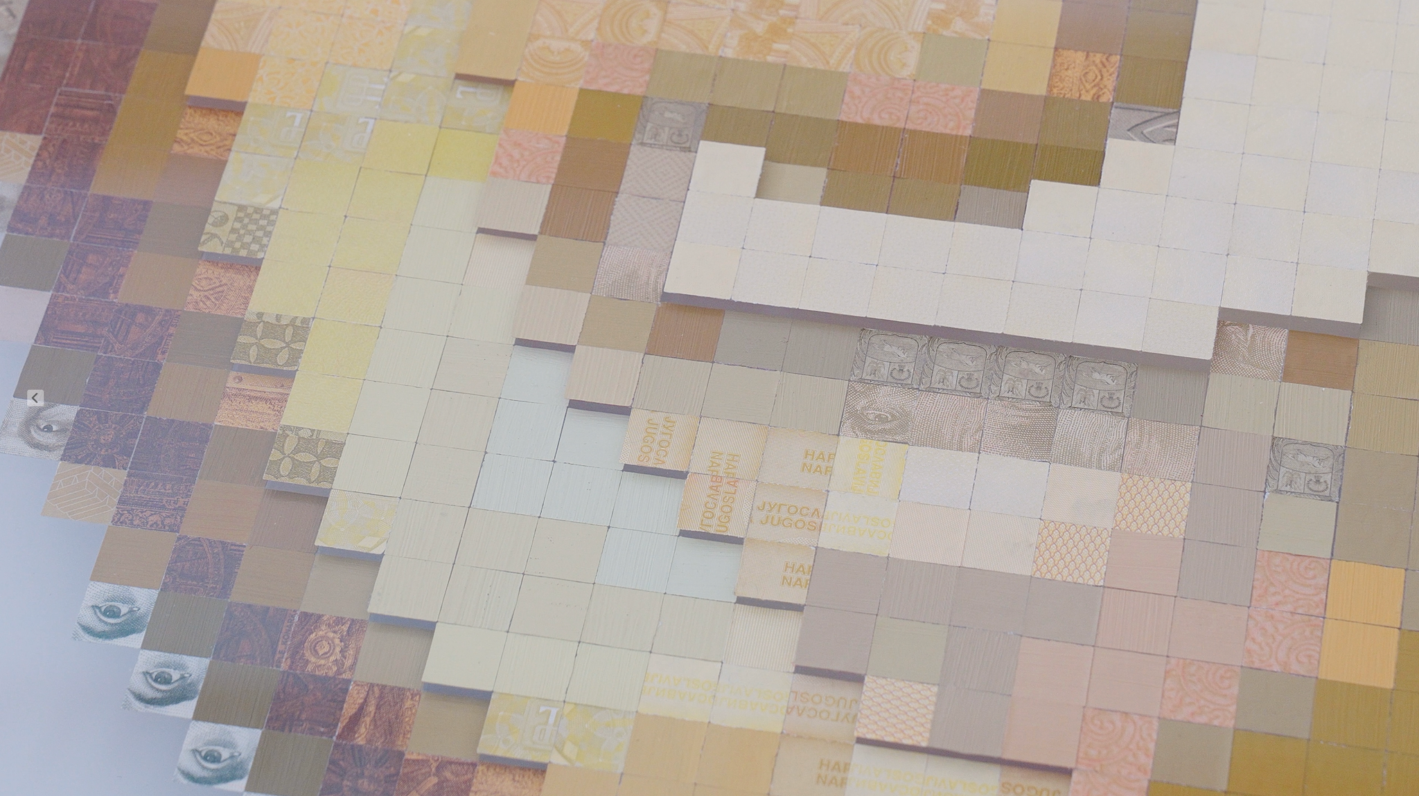 To create BC 3D, I enlarged the most detailed of the six icons and color-matched each digital pixel with a fiat counterpart. BC 3D is composed of 1844 pieces of currency - some of which are painted with acrylic of varying opacities. All told, 20 different notes were used in the artwork: