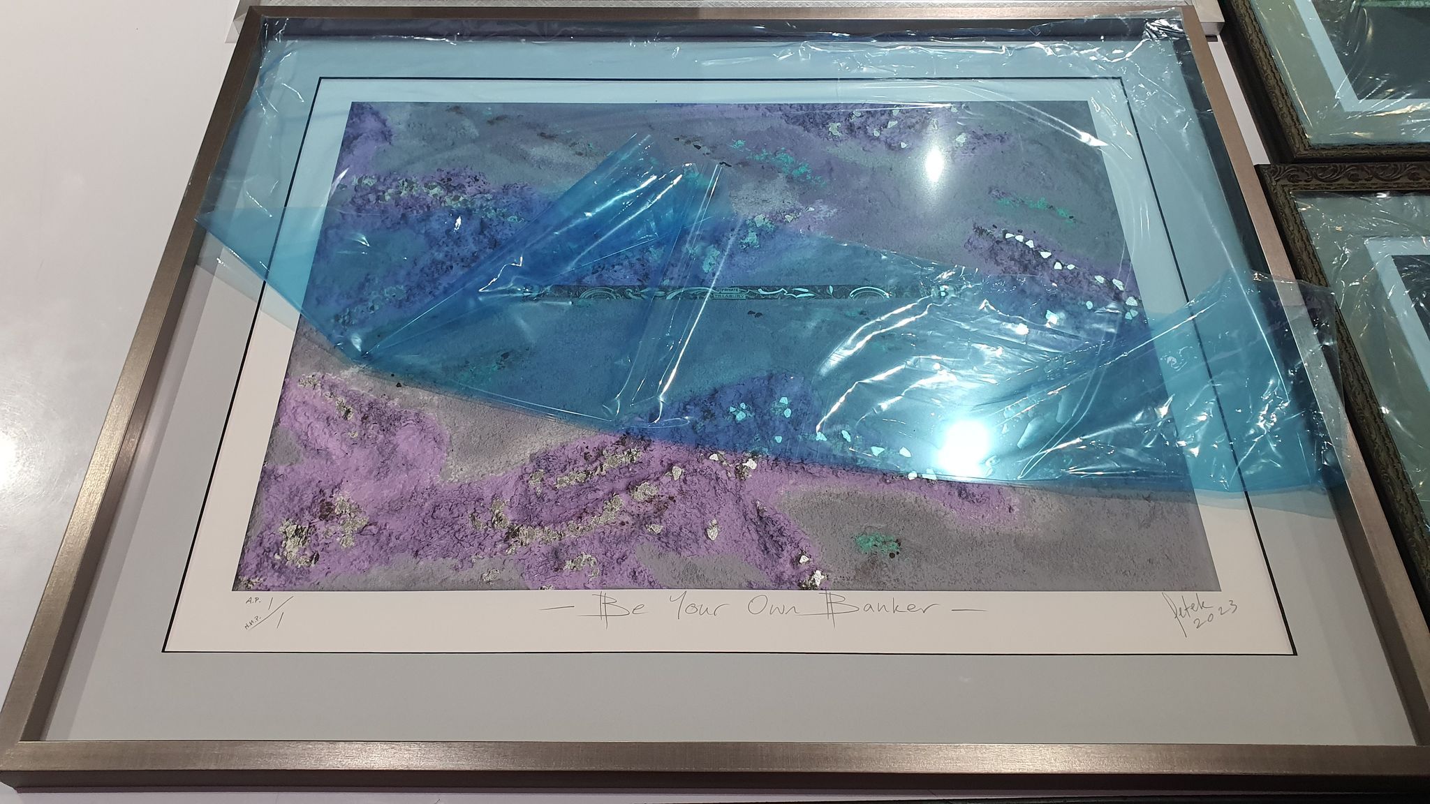 This freshly released, unique # 1/1 A.P. of “₿e Your Own ₿anker” has extra fine Platinum detailing along the centre line of fiat, which is what sets it apart of the regular edition of 24. It looks super 3 dimensional and you will want to run your fingers over it, that is how amazing the print quality is on this Artist Proof. The framing was also commissioned by Petek and is included in the auction price.