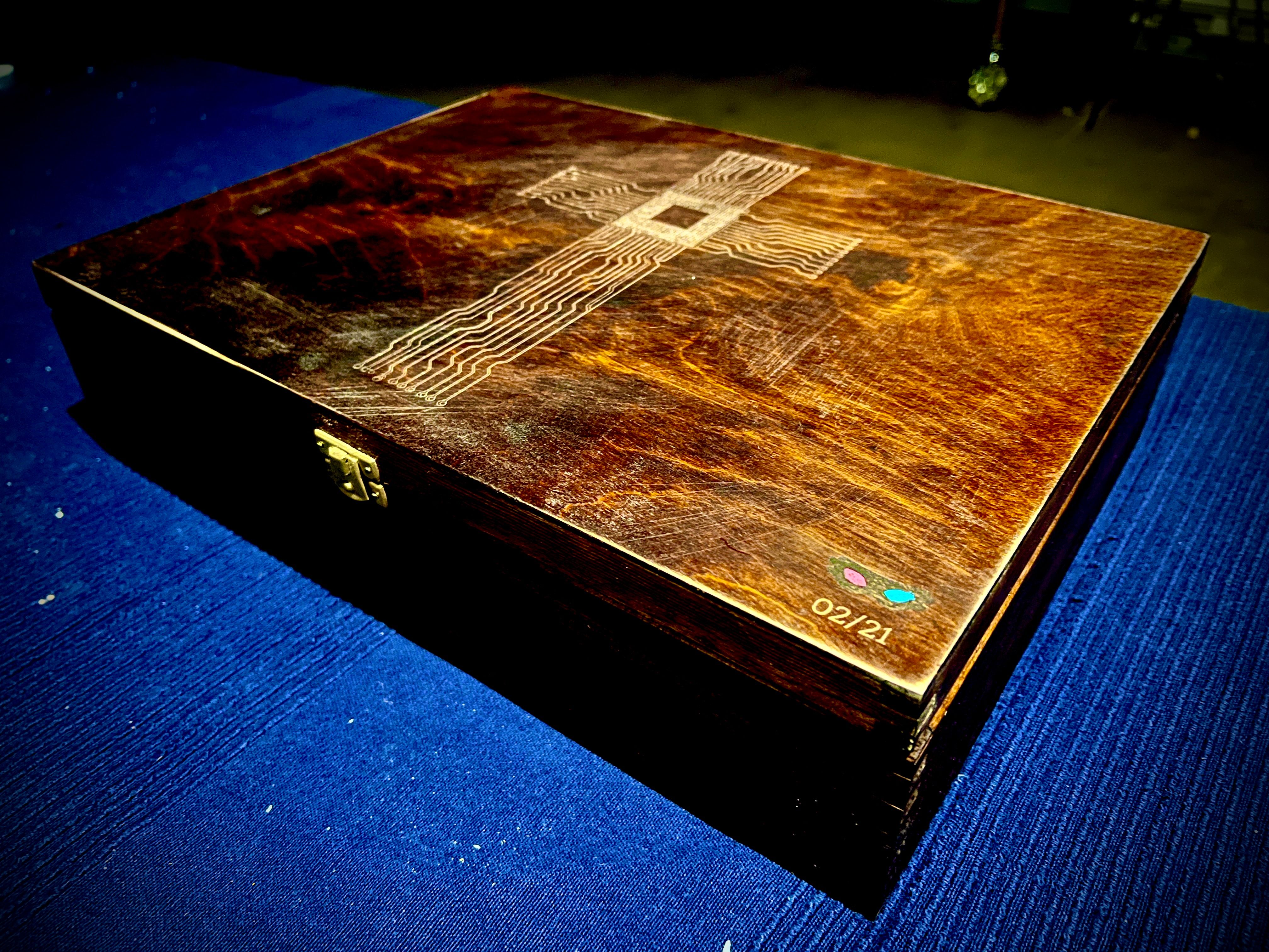 The artwork looks stunning with or without external light. The handmade LED array has a remote which can adjust brightness and constant/pulsing light. The piece is protected in an etched and varnished wooden box, surrounded by a bed of shredded fiat paper.