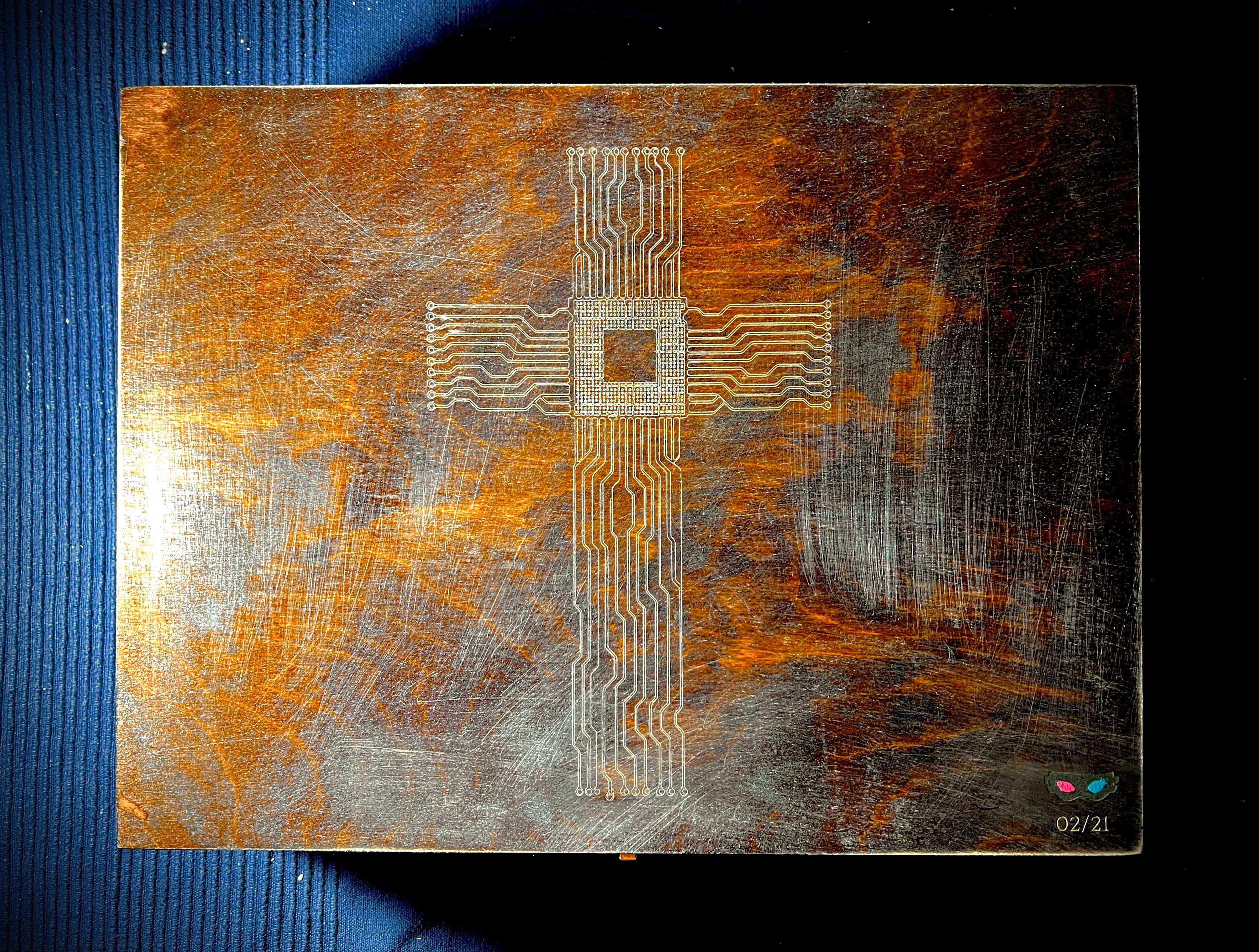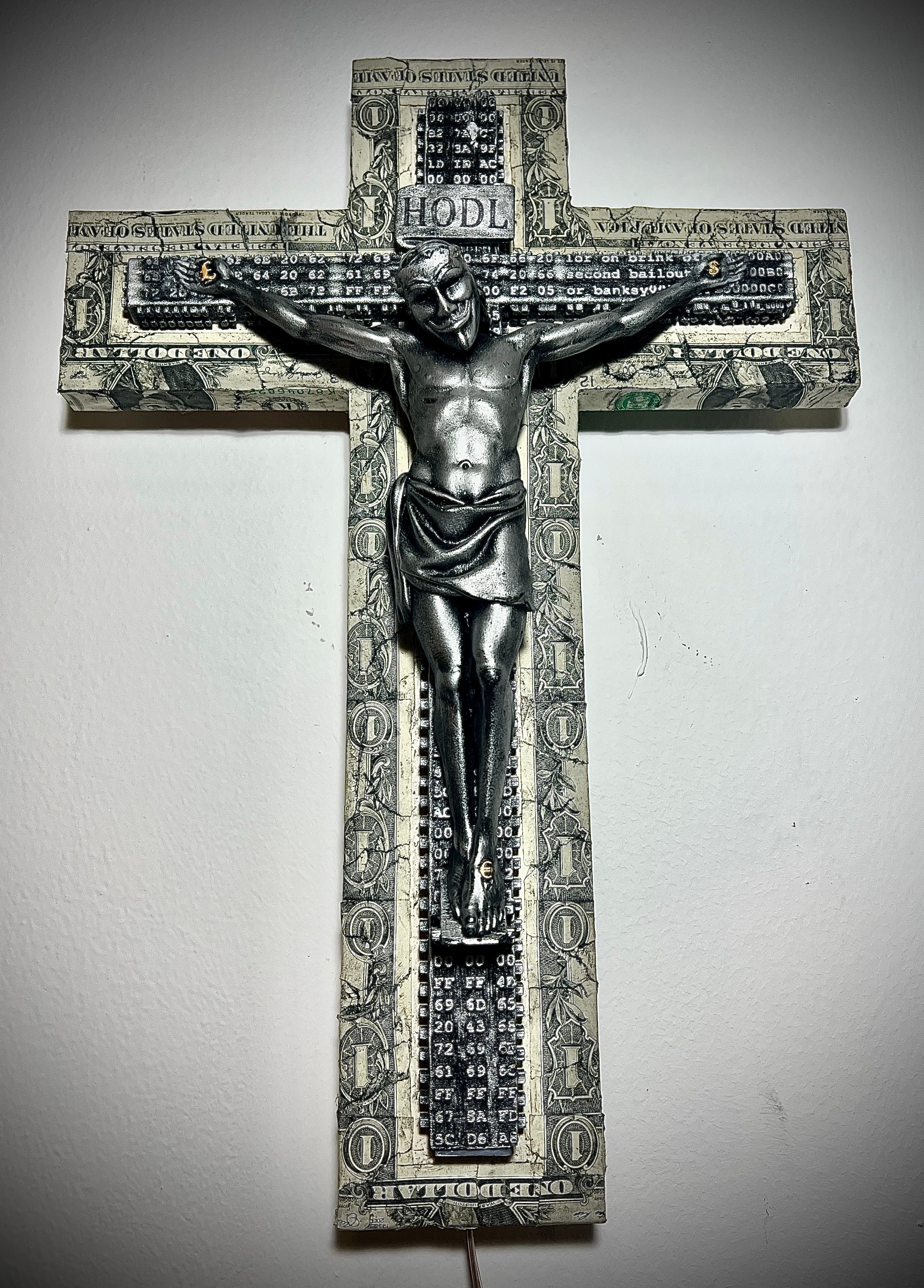 Satoshi Nakamoto is pictured hanging on the cross. The raw hex data of the Genesis Block of Bitcoin is embossed on the wooden beams - his burden to bear. The nails impaling Satoshi are fiat currencies, restricting freedom and dooming him to departure. The cross is is set on inverted, cracked and dirty dollar notes, (a recurring theme in Rebel Money’s work) symbolising the broken economic system we reside in.
