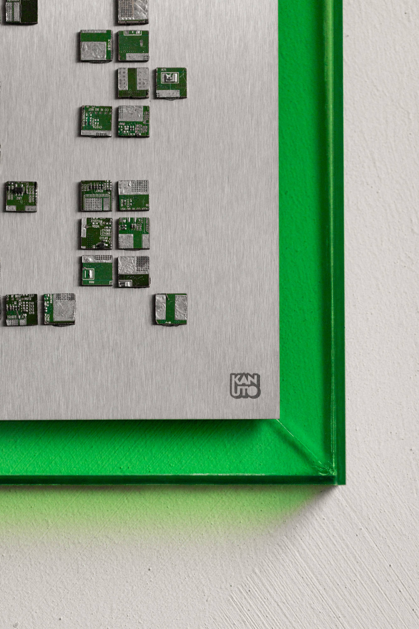 The artwork is framed with a green acrylic shadow gap frame, also crafted by the artist. The frame gives the piece a sense of lightness and a floating quality, balancing its technical character.