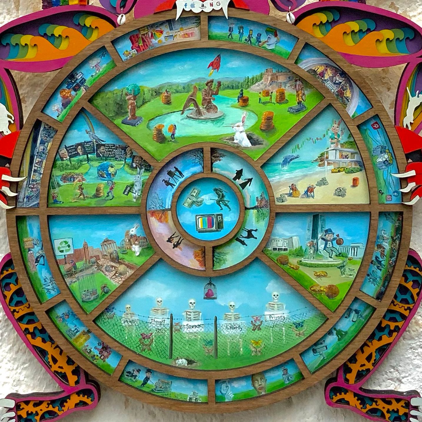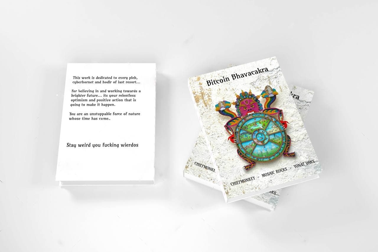The Bhavacakra comes from the Buddhist religion but since Bitcoin is all inclusive and this piece intends to incorporate all its qualities on several different levels, we have included symbols from other religions, cultures and times in history, both classical and modern.