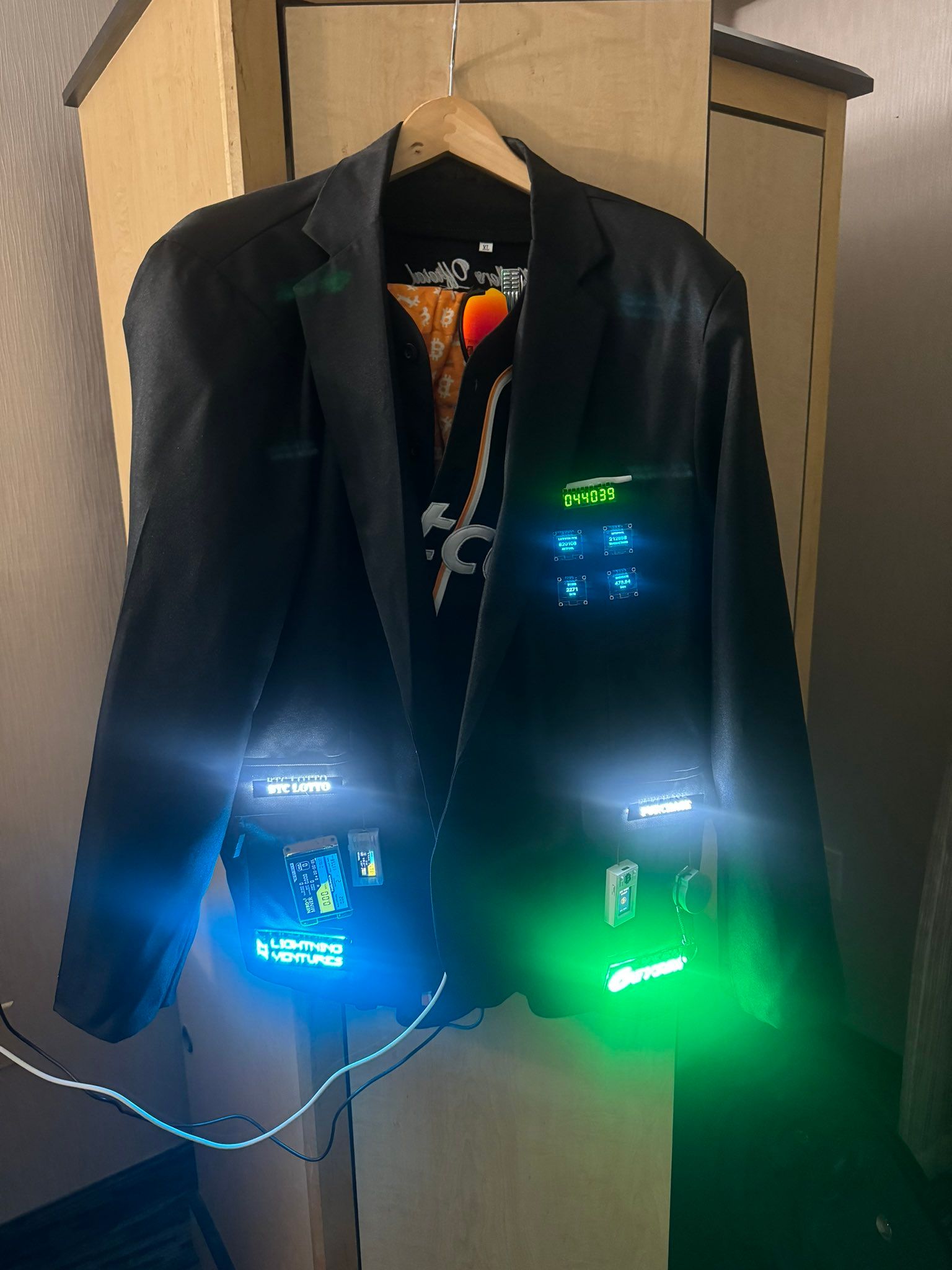A handmade digital suit (size: 2XL) I created for wearing at Unconfiscatable 2023. The suit has several amazing features. This suit will make you feel like Iron Man when going to Bitcoin Meetups and Conferences.