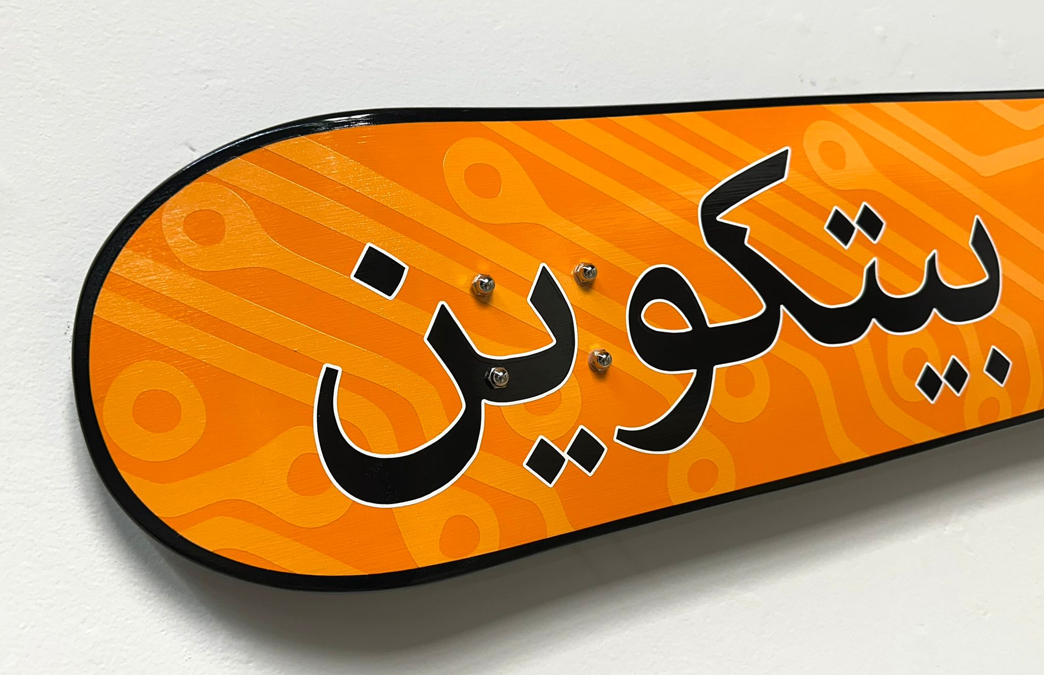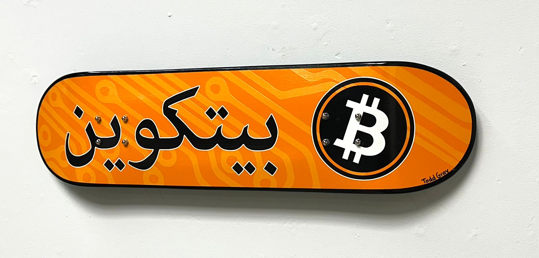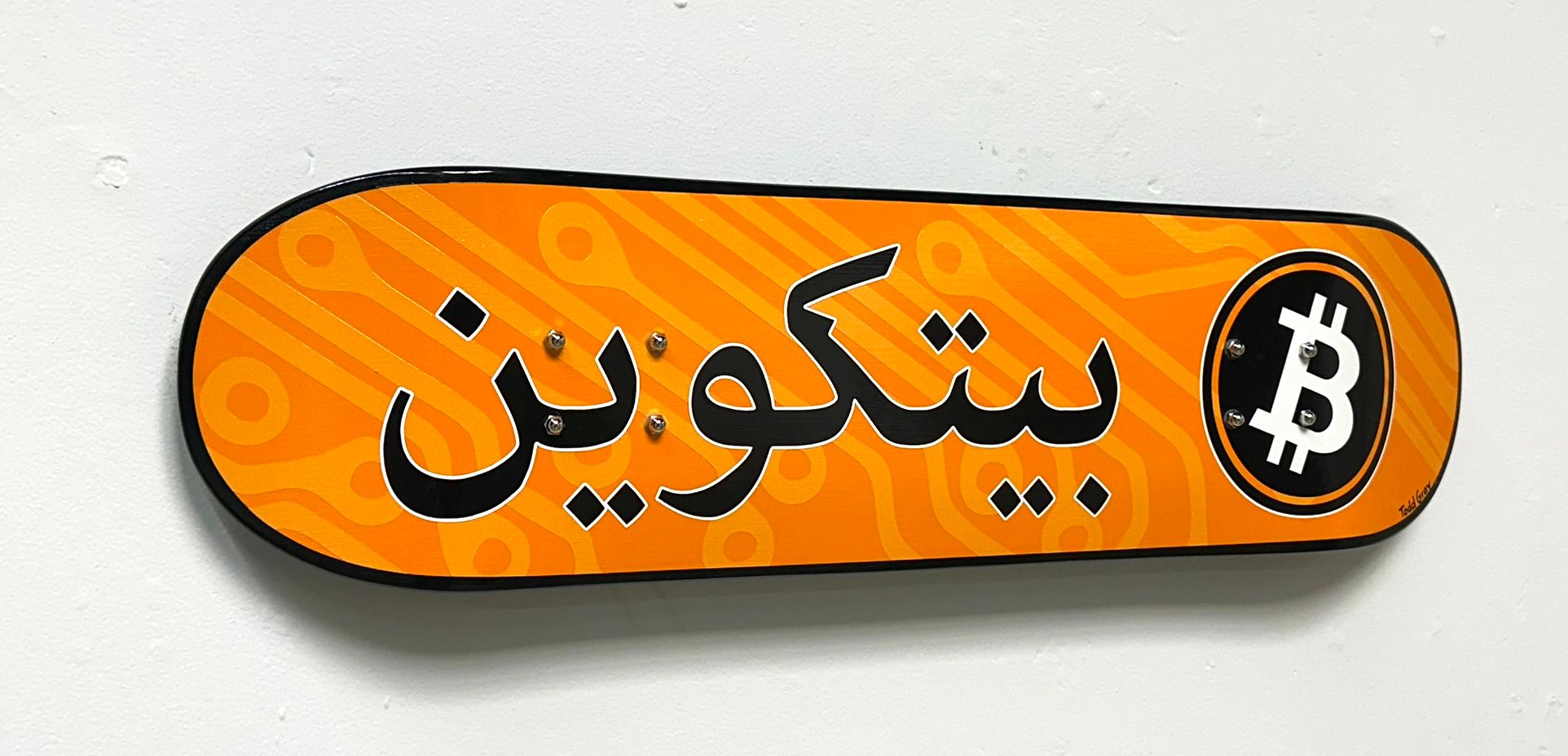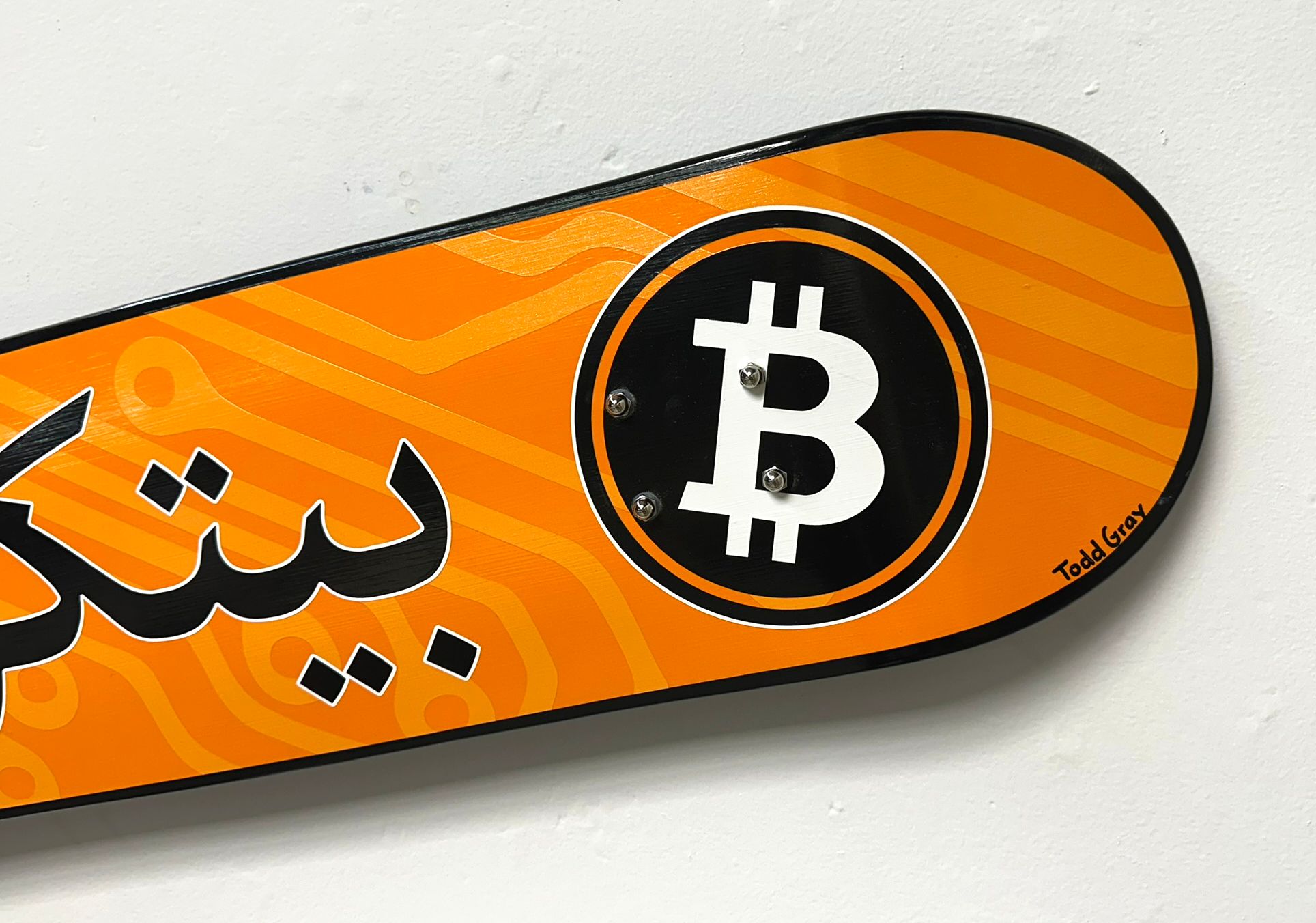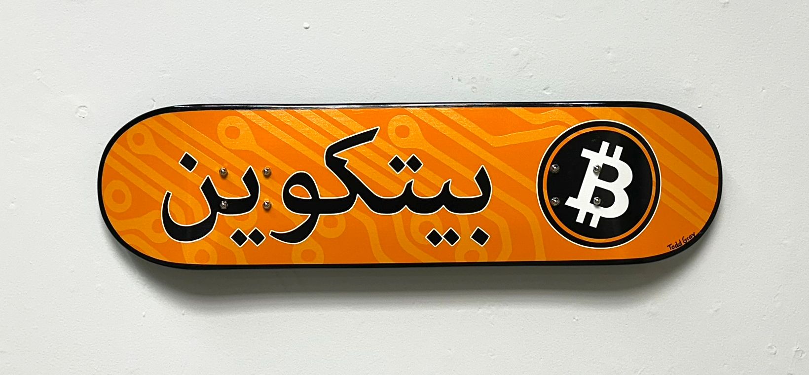 Bitcoin Islam (orange). This is another piece I painted exclusively for the Mena show in Abu Dhabi. Simple. Direct. Beautiful. It pretty much says everything it should say in Bitcoin orange with a subtle circuit board pattern ( in background) painted with a glaze that glows in different light.