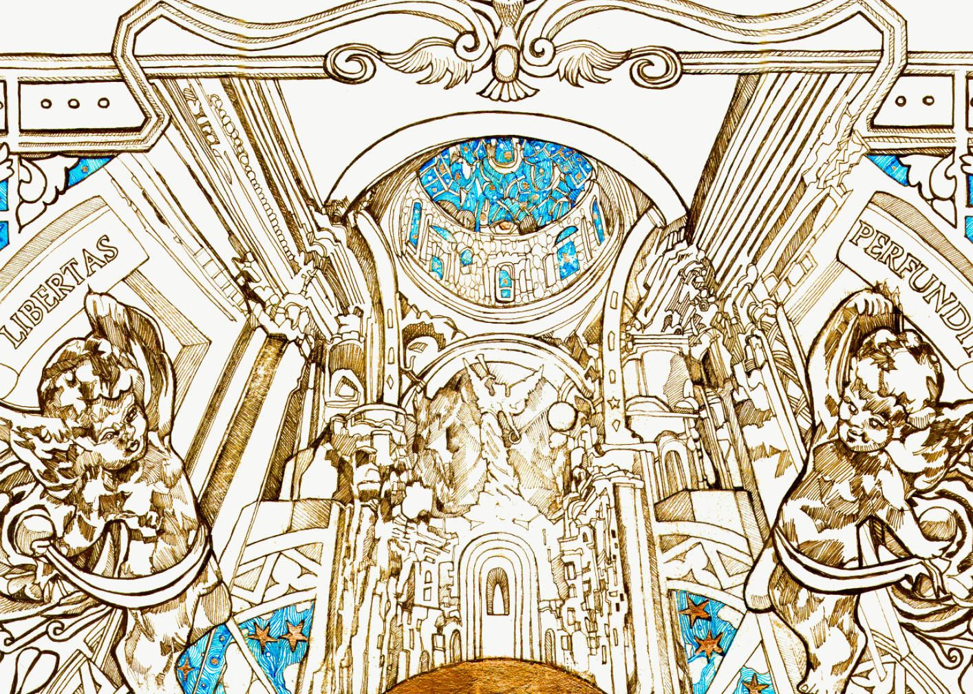 Jesus appears in traditional 'Sacred Heart' fashion, with a Golden Orb of Light behind him. Details include a high ceiling akin to the awe inspiring churches of the European Renaissance. Jesus is flanked above by Cherubs and Below by Medieval Lions. The Banner reads "Libertas Perfundit Omnia Luce" : Latin meaning "FREEDOM SPREADS THROUGH ALL THE LIGHT"