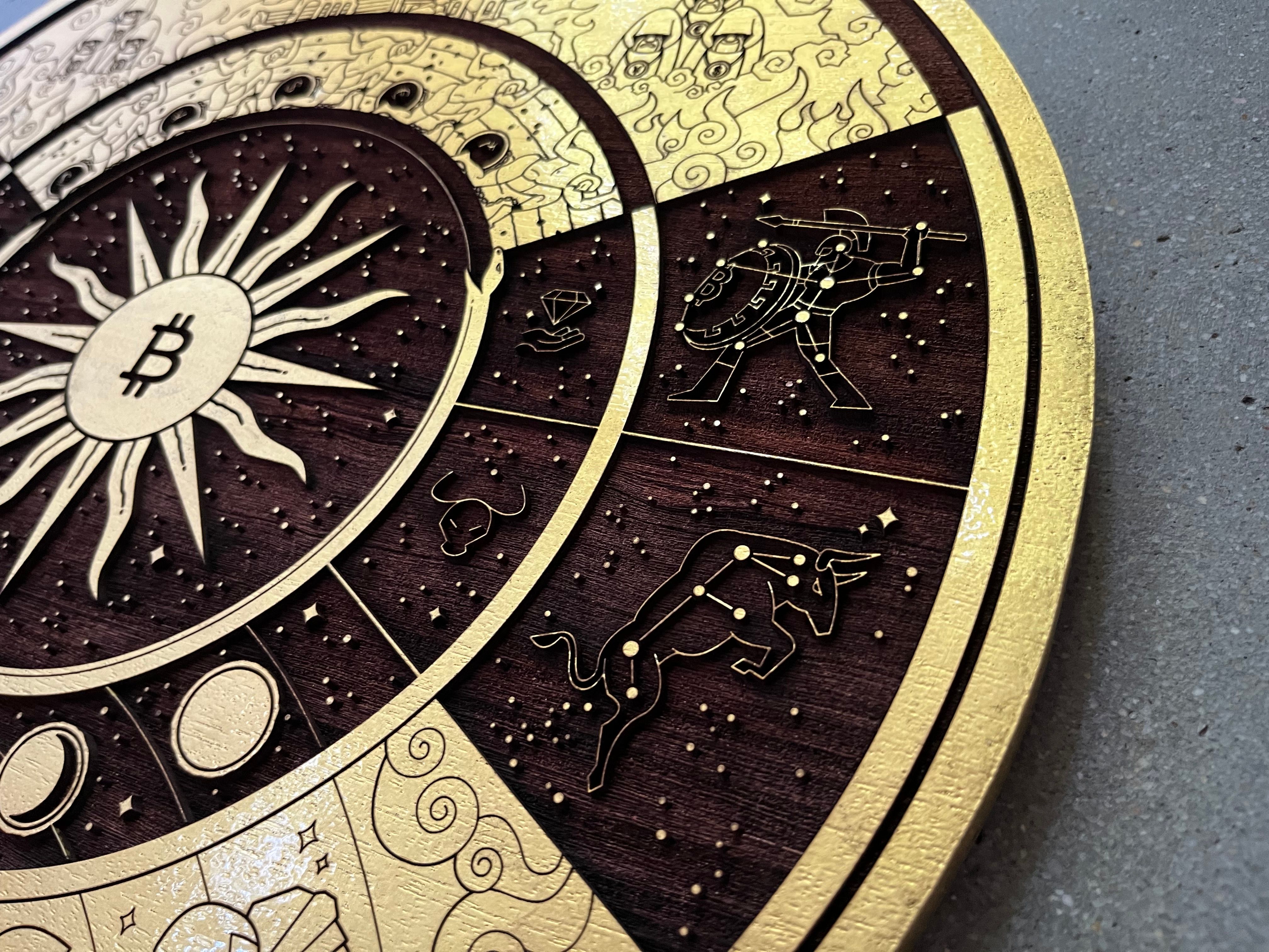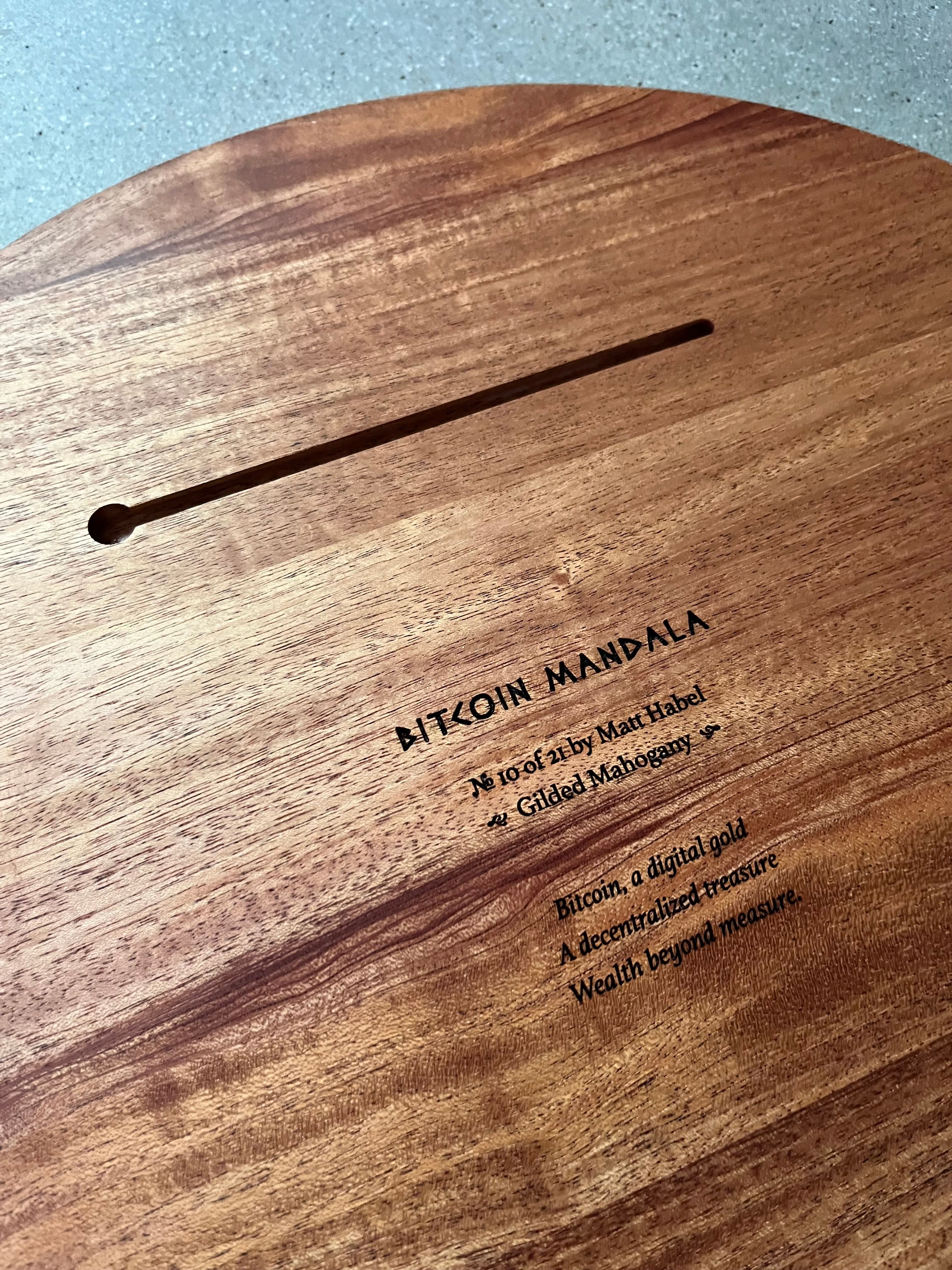Introducing Bitcoin Mandala #10 of 21, the first in the series to be adorned with gold. The rich, warm tones of the mahogany base provide a striking contrast to the intricate 23-karat gilded design that shimmers as it catches the light. This unique edition in the series is an homage to bitcoin's reputation as "digital gold".