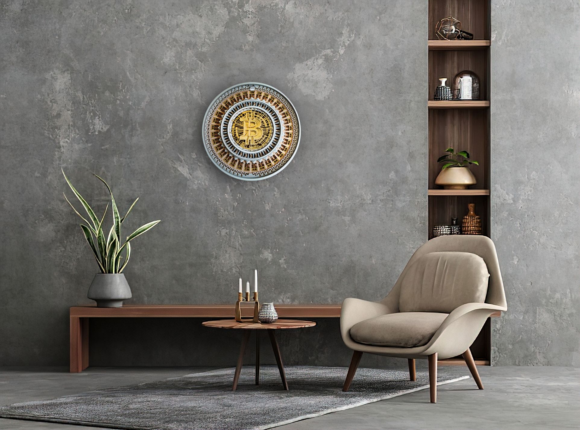 The Bitcoin Mandala embodies a cyberpunk sound built on top of a classical design, reminiscent of ornamentation established from earliest antiquity, and created for the future. The color theme for every of the panels are unique, but this is the first with an actual change in the design. In the center part are engraved all the halving years, and corresponding block rewards for that years. A total of 33 rays are spreading from the center .