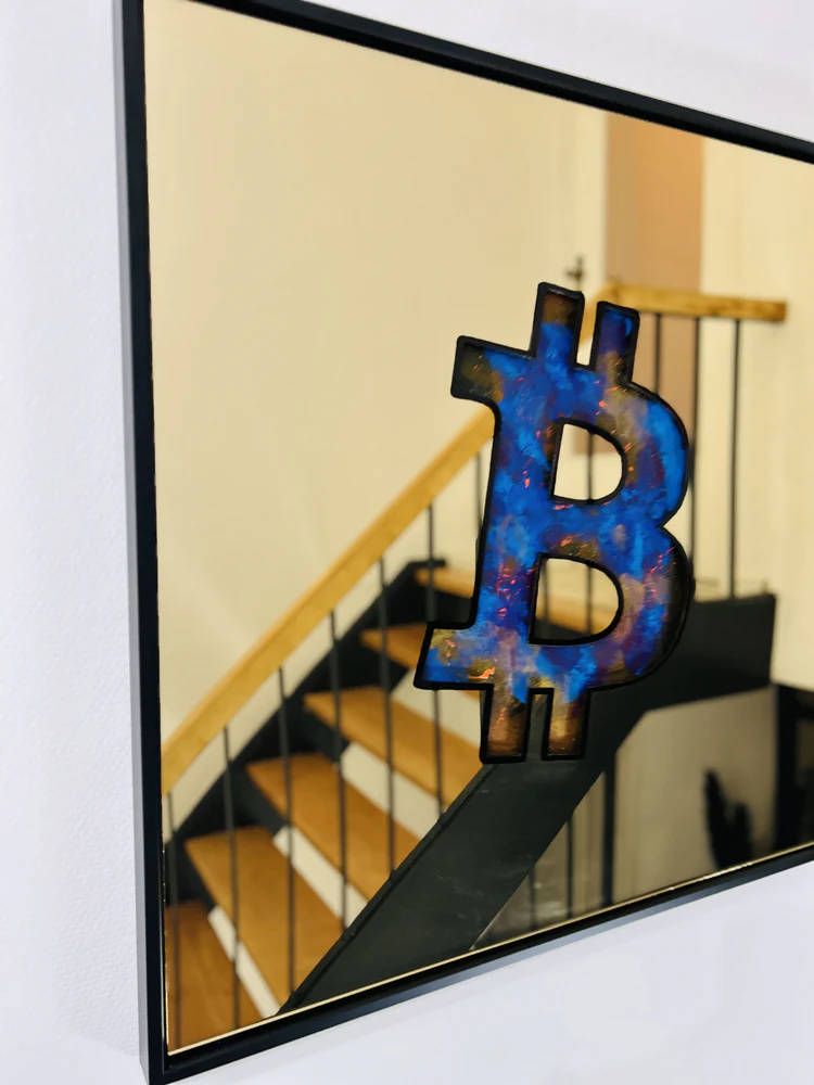 The artwork "Bitcoin Mirror" embodies a captivating blend of art and Bitcoin. The mirror, artistically designed, features a stylish Bitcoin 'B' at its center, serving not only as a graphical element but carrying a deeper meaning. This central symbol not only represents the power of bitcoin itself but also suggests that anyone looking into the mirror becomes, in a sense, a part of Bitcoin.