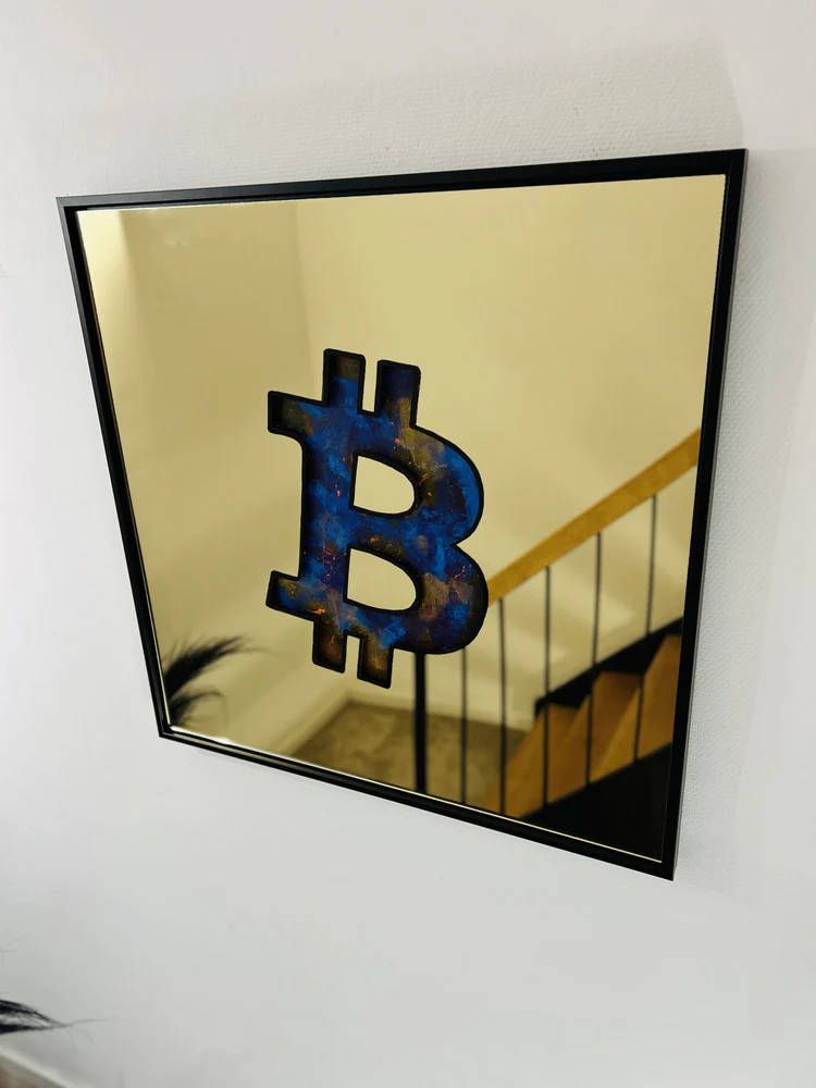 The aesthetics of "Bitcoin Mirror" go beyond mere functionality, serving as a consciously crafted design element. Choosing a mirror as the medium enhances the metaphorical dimension of the artwork, inviting viewers to see not only their own reflection but also the role they play in the context of the decentralized world of Bitcoin.