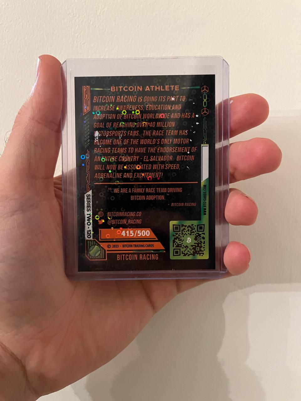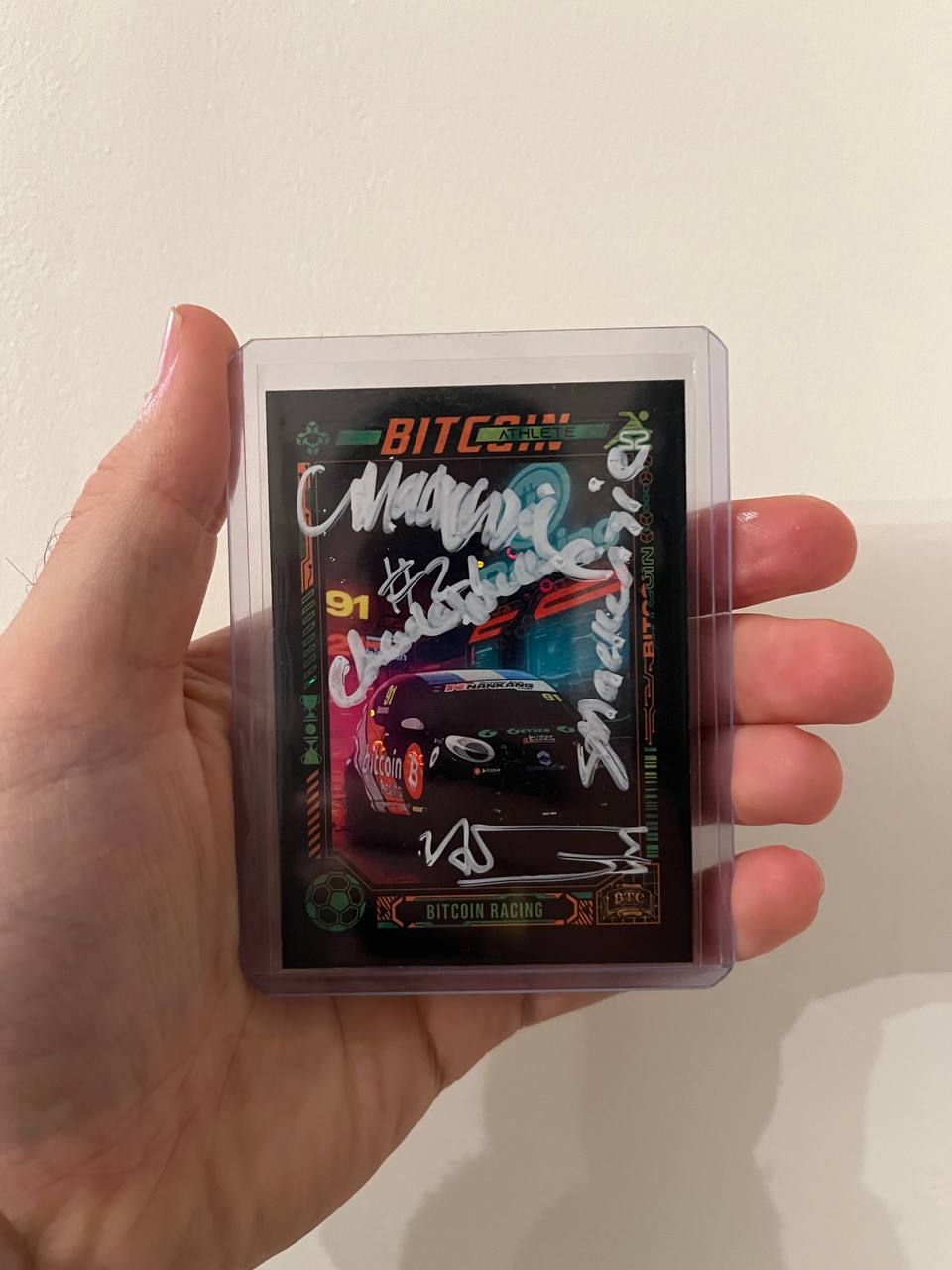 A 1/500 Bitcoin Racing Bitcoin Trading Card signed by the team principals (The Mackenzie family) and driver of car #21 Chris Mackenzie.