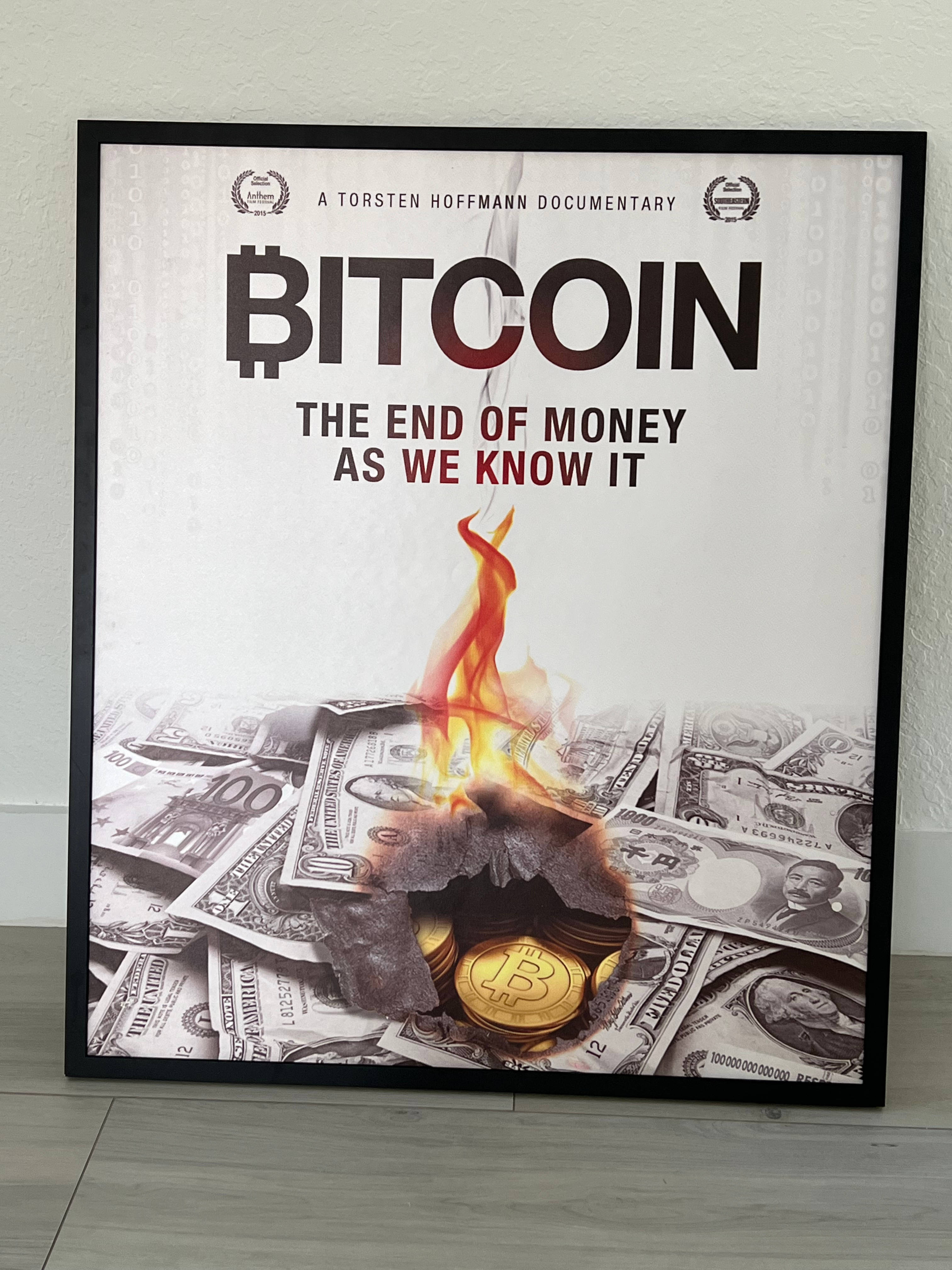 RARE "Bitcoin, The End of Money As We Know It" movie Poster from 2018 framed. Collector's item BTC poster measuring 30" x 36" x 2" ready to hang. there is a tiny spot with imperfection the size of a penny at the very bottom almost invisible.