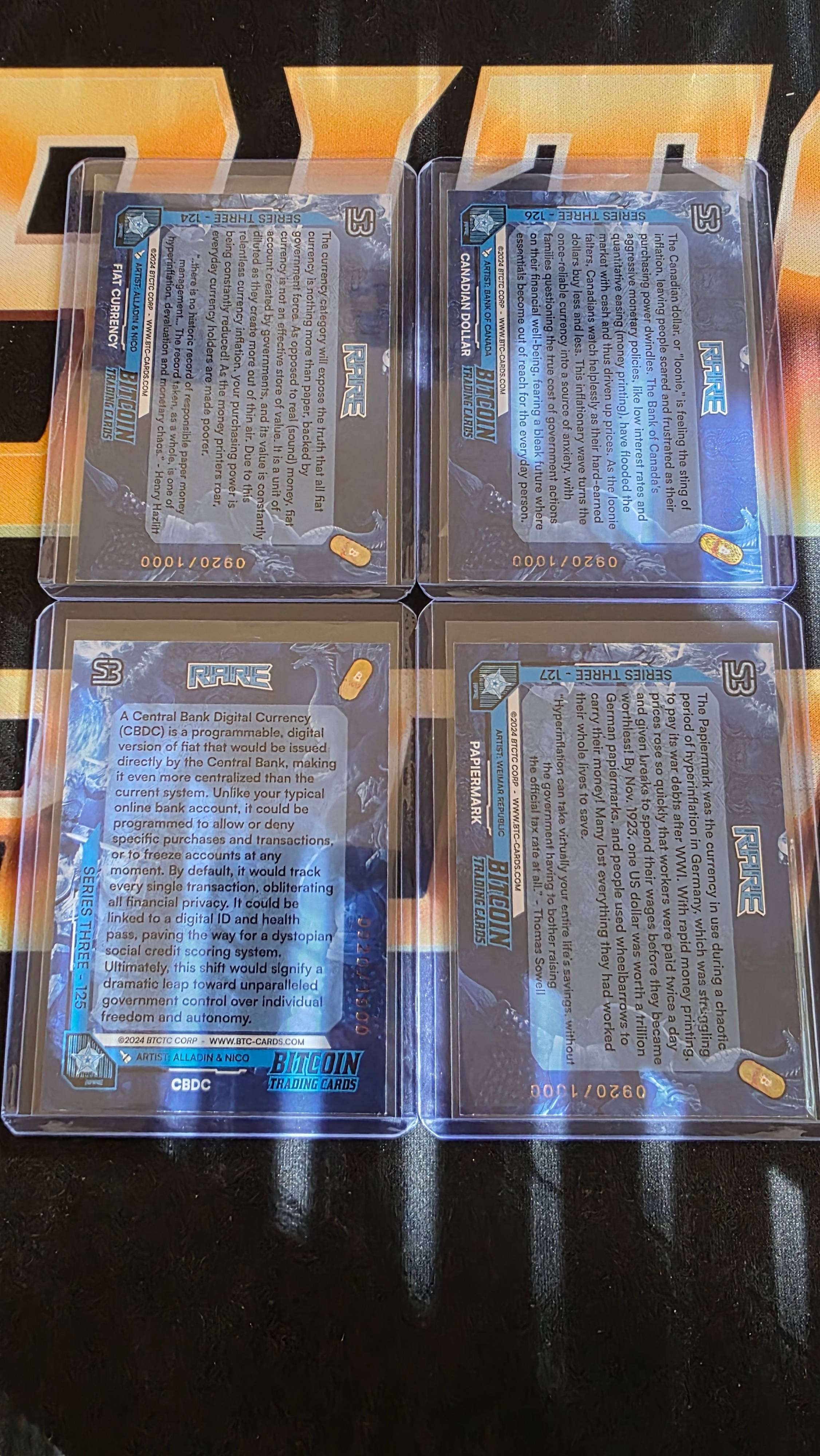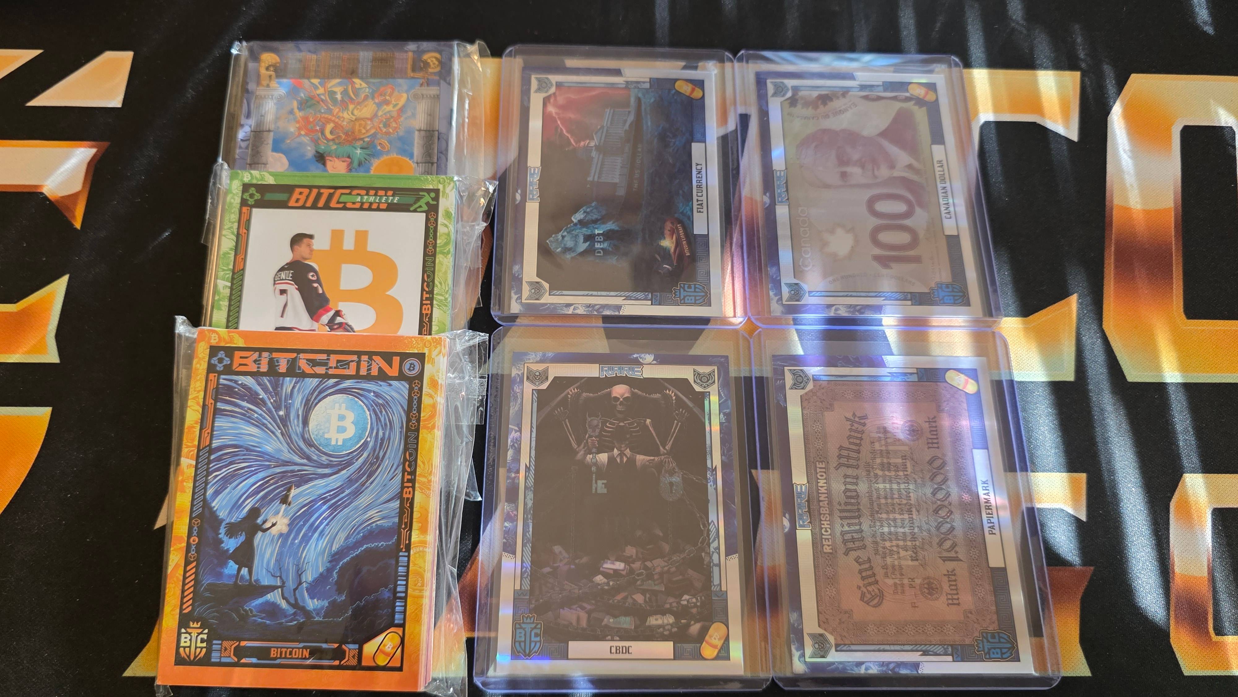 Full set of 63 base series 3 bitcoin trading cards. 4 rares with matching 920/1000 serialized set. Newsweek figpin. Limited fudbusters sticker pack.