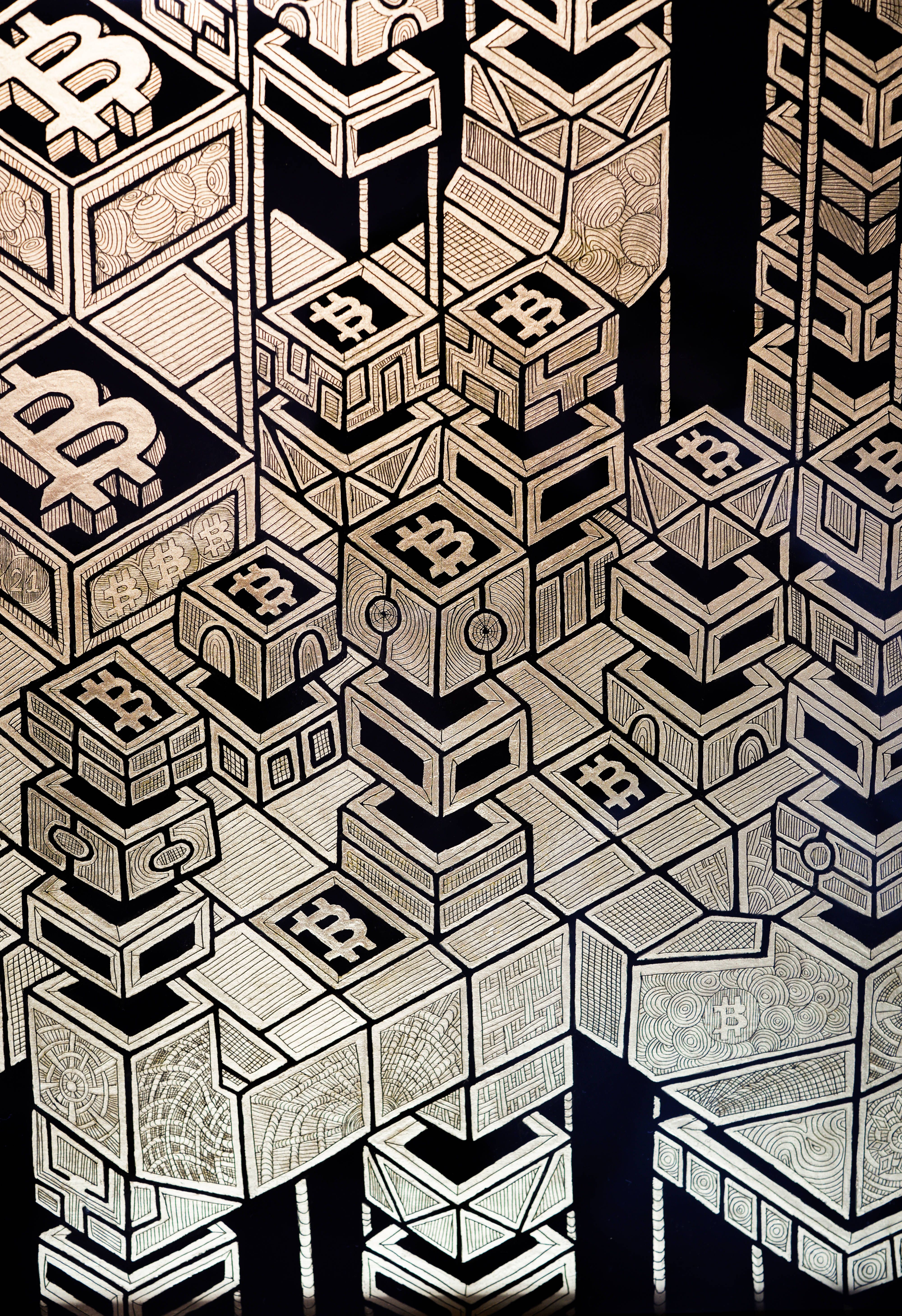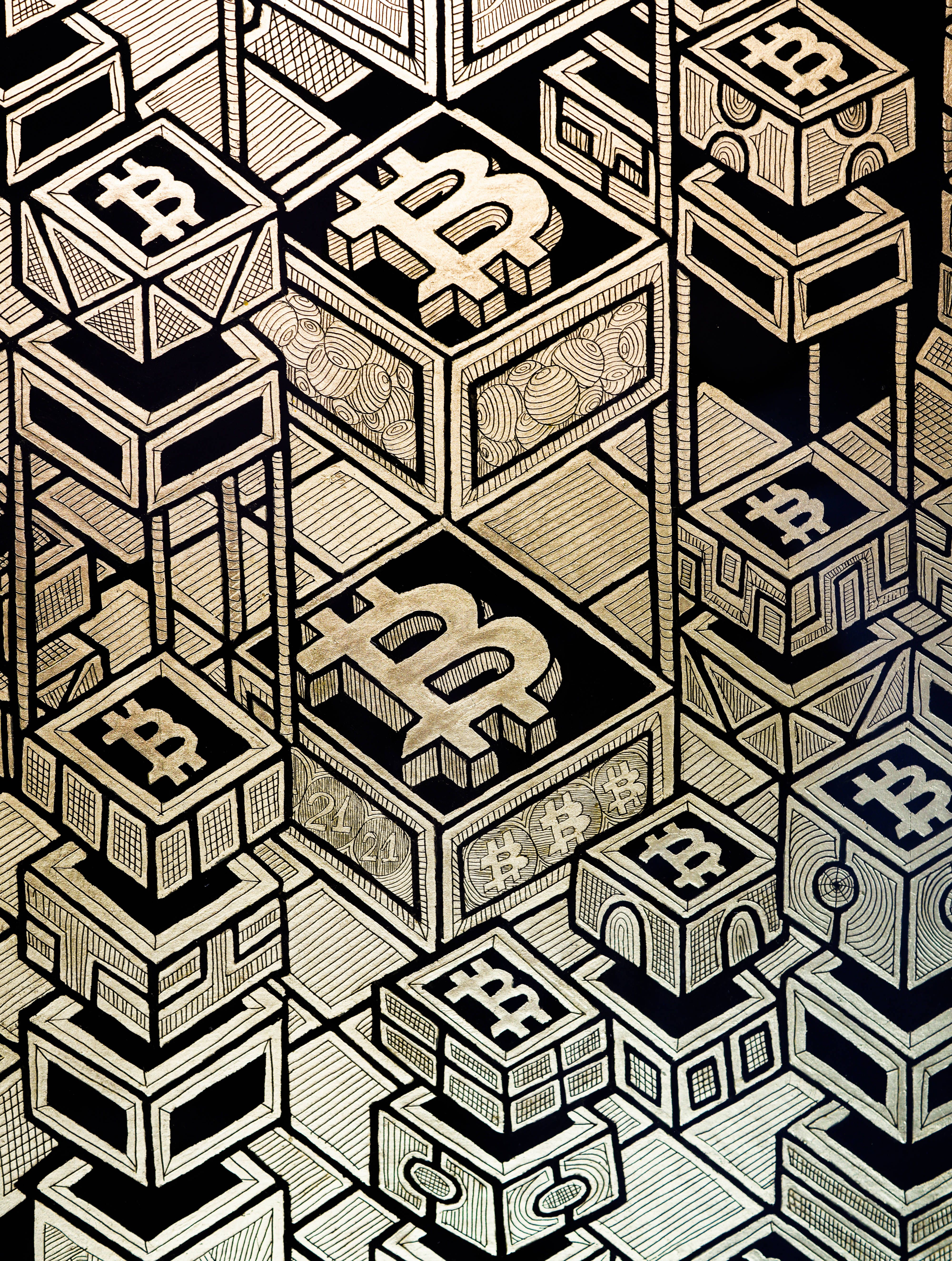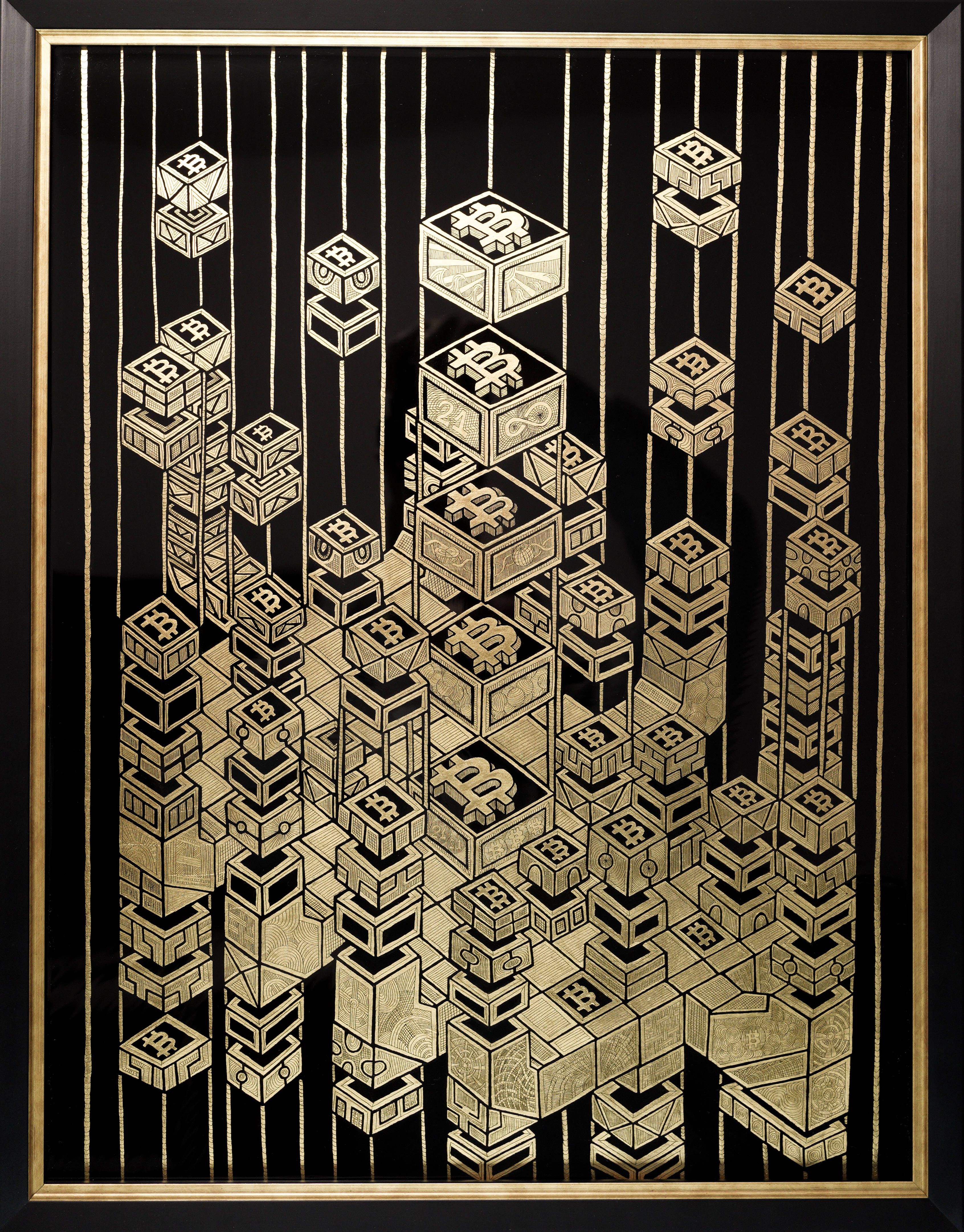 This unique artwork merges together multicultural art techniques to depict the Blockchain world. Built through multiple layers of deep black charcoal lacquer, the composition forms a dark spatial field from which the Blockchain structure emerges. Gilded with 22-carat gold leaf and engraved with more then a thousand thin lines. The geometric golden blocks symbolize value, permanence, and the transformative strength of decentralized technology we call Blockchain.