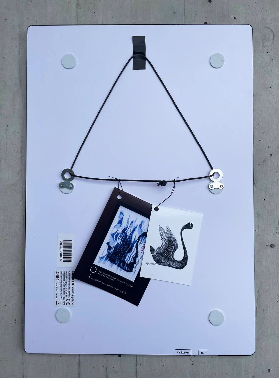 The physical development sparked with an illustration of a pepefied block swan which was drawn with a black pen. That image was then scanned in movement to make it appear shaken. A typography layer was scanned in the same way, consolidated digitally and the result manually scanned and shaken again. The red candle dropping from the swans mouth added. The final image was then printed twice on transparent foil. The foil laminated to a slim lightbox to make the entire work appear like a fake screen. The work can be dimmed and either run on its internal battery or powered via USB A plug.