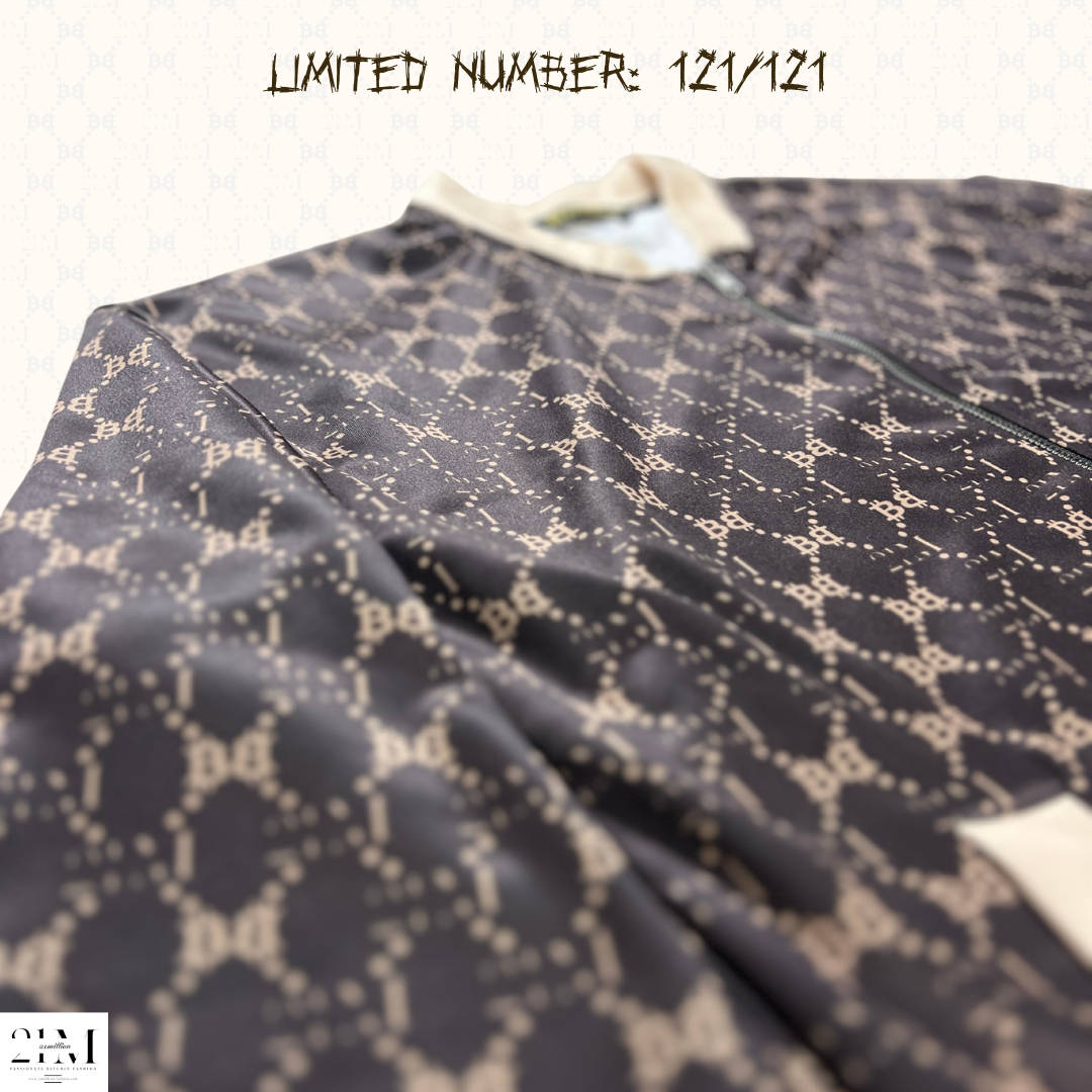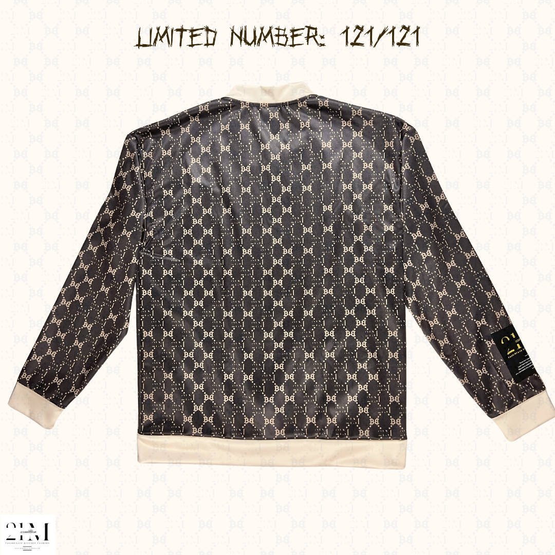 Adorned with the 21million monogram, a testament to bold design and creativity, this jacket features a distinctive pattern that commands attention. The jacket is signed and numbered on the inside lining, blockheight and scarcecity auction mentioned, elevating it to a one-of-a-kind masterpiece.
