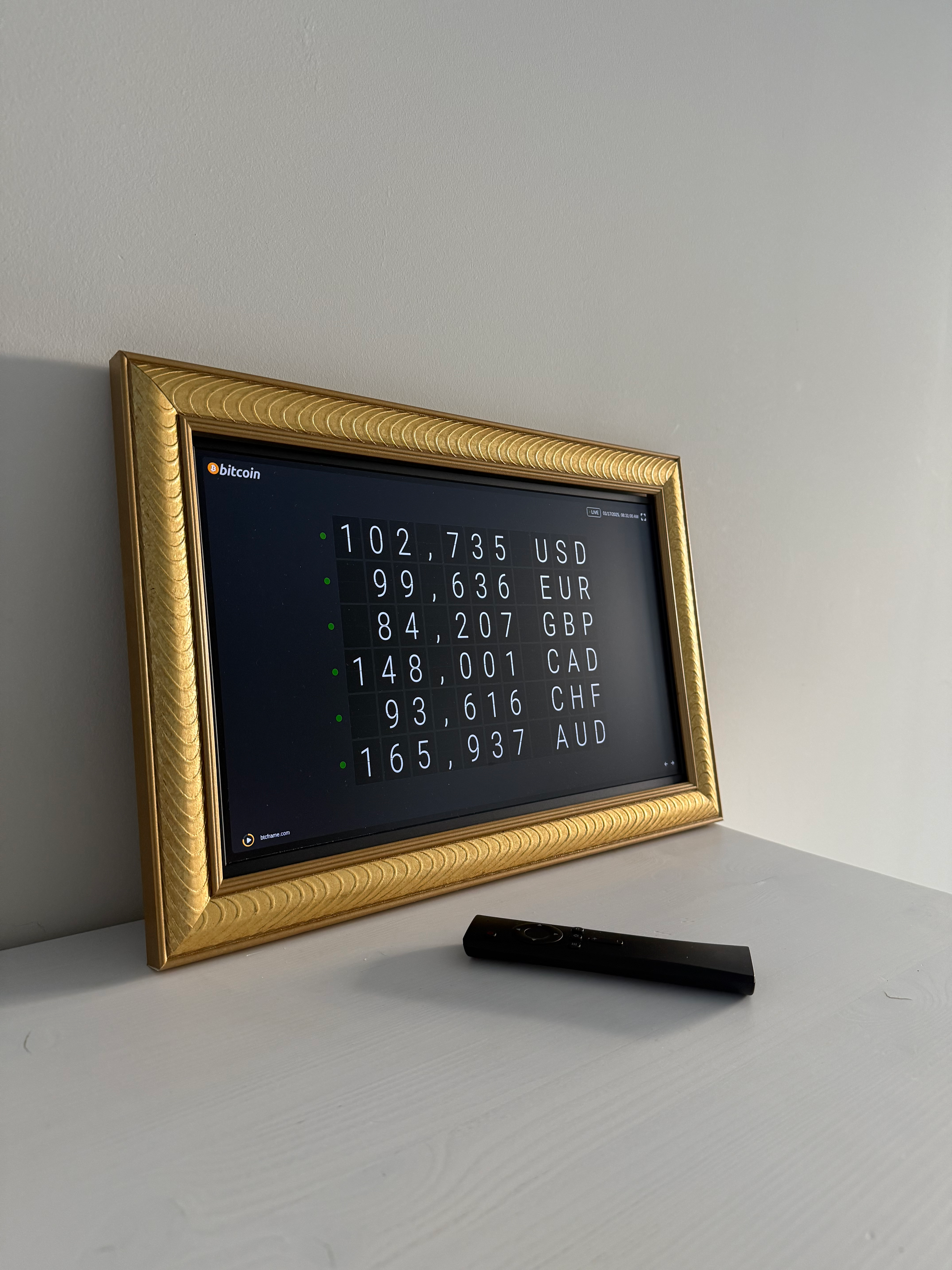 Every frame rotates every 60 seconds, and on the 21st dashboard—appearing once every 21 minutes—a beautifully animated message in 21 languages displays: “Thank You, Satoshi.” This thoughtful tribute combines stunning visuals with elegant animation, creating a moment of reflection and gratitude for the visionary who started it all. This unique detail underscores the BTC Frame’s craftsmanship and ethos, blending innovation with reverence for the roots of Bitcoin. It’s more than a dashboard—it’s a celebration of history and legacy.