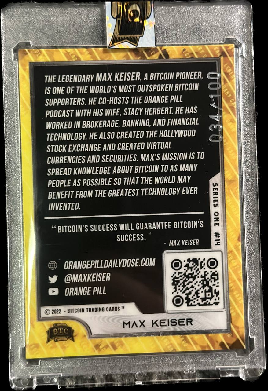 This is an original 1/100 Legendary Max Keiser Card from Series 1 in mint condition & comes in an acrylic magnetic case with a BTC seal on case proving authenticity & that it is coming strait from Bitcoin Trading Cards. Anyone featured in BTC has given their blessing and approval to be featured on a card.