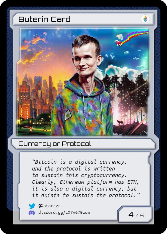 The Buterin Cards is a small collection of 5 exclusive cards inscribed in the 3k range. The cards feature a meticulously crafted AI image of Vitalik and many references to the history of crypto, including NFTs and DeFi. Just like the Nakamoto Card is an iconic early NFT on Bitcoin, the Buterin Cards are the first inscriptions of Vitalik. Each card includes a distinct quote from Vitalik, starting with a controversial statement and concluding with a Bitcoin-friendly comment that turns Vitalik's laser eyes on.