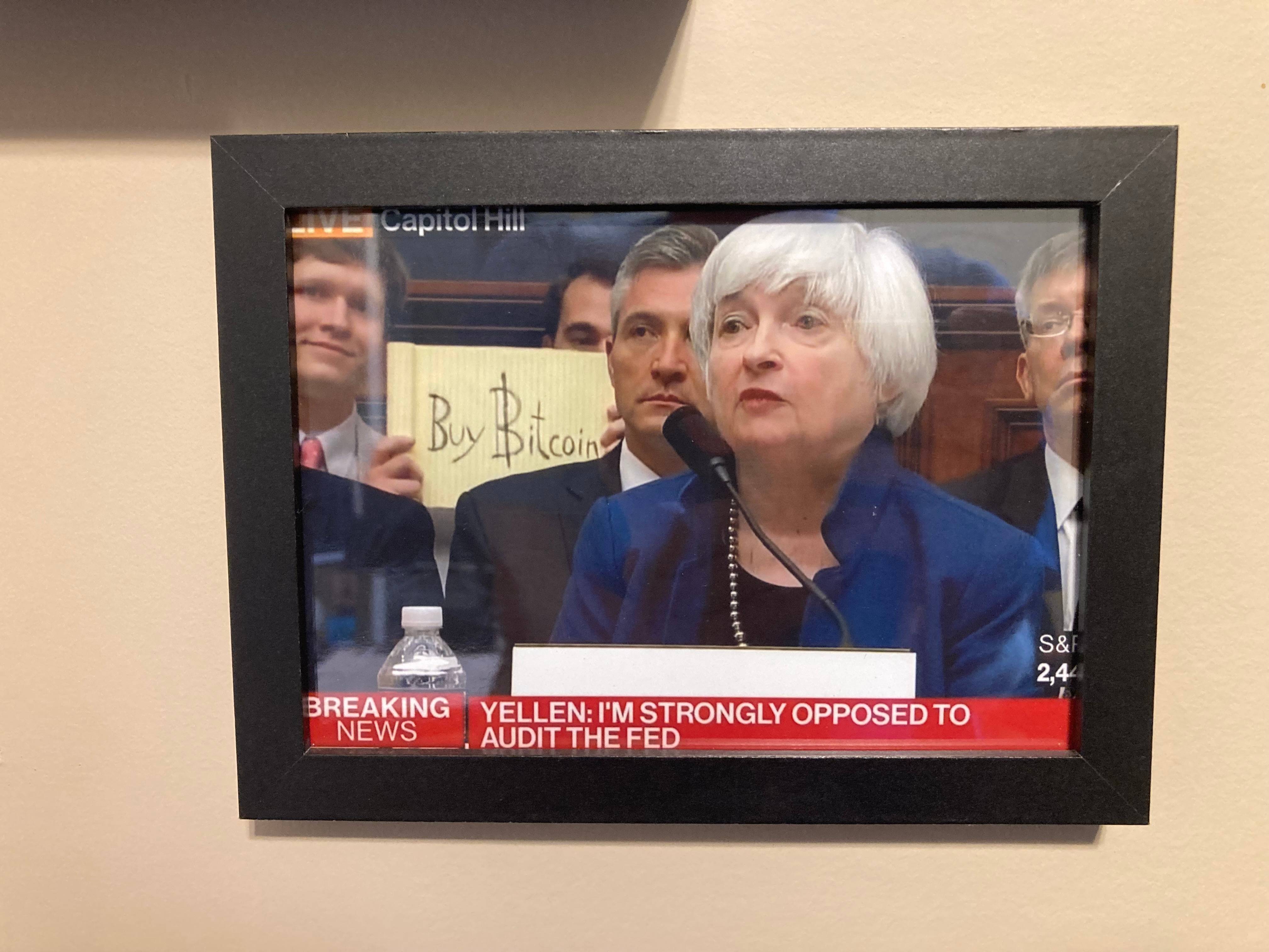 "An unidentified man held up a sign saying “buy bitcoin” during Fed Chair Janet Yellen’s testimony Wednesday before the House Financial Services Committee. Bitcoin subsequently climbed toward session highs and traded 3.7 percent higher, at $2,418.46, as of 2:27 p.m. ET, according to CoinDesk. The unidentified bitcoin proponent, whose stunt was visible on television, was removed from the hearing room. Holding up the sign violates the House committee’s rules. Committee staffers told CNBC they didn’t know the man’s name."- CNBC, Editions strictly limited at 21. Each is time-stamped on Bitcoin to verify authenticity. Buyer will receive a Certificate of Authenticity through Verisart.Also included in this auction is a 1 of 1 original piece by Maxis Club by Redy depicting the historic moment Christian held up the "Buy Bitcoin" during Yellon's congressional testimony.Two other pieces are included in this auction: a descriptive placard and a framed photo of that iconic moment in Bitcoin history.