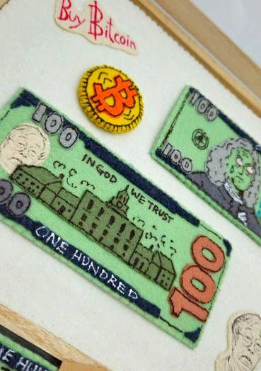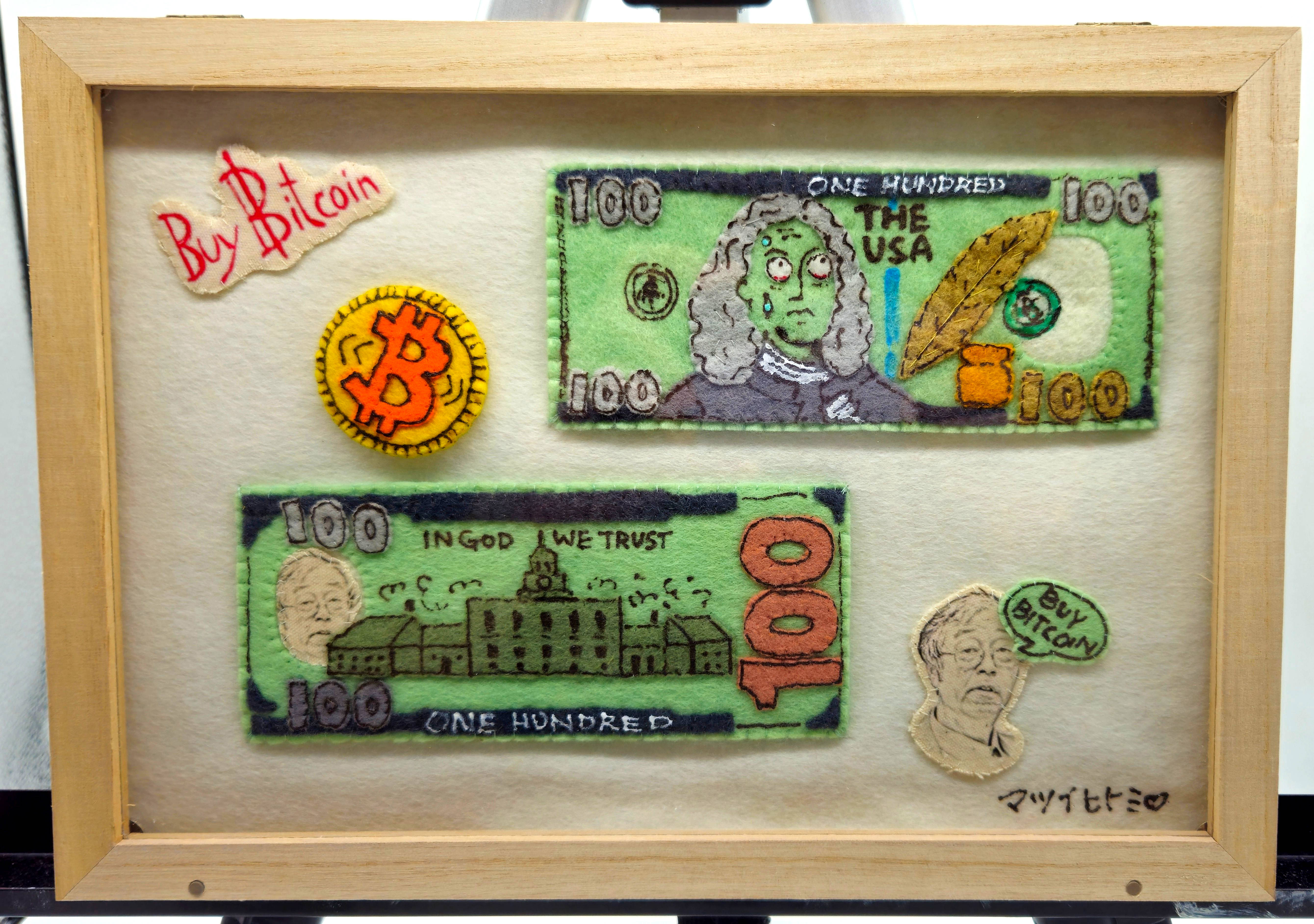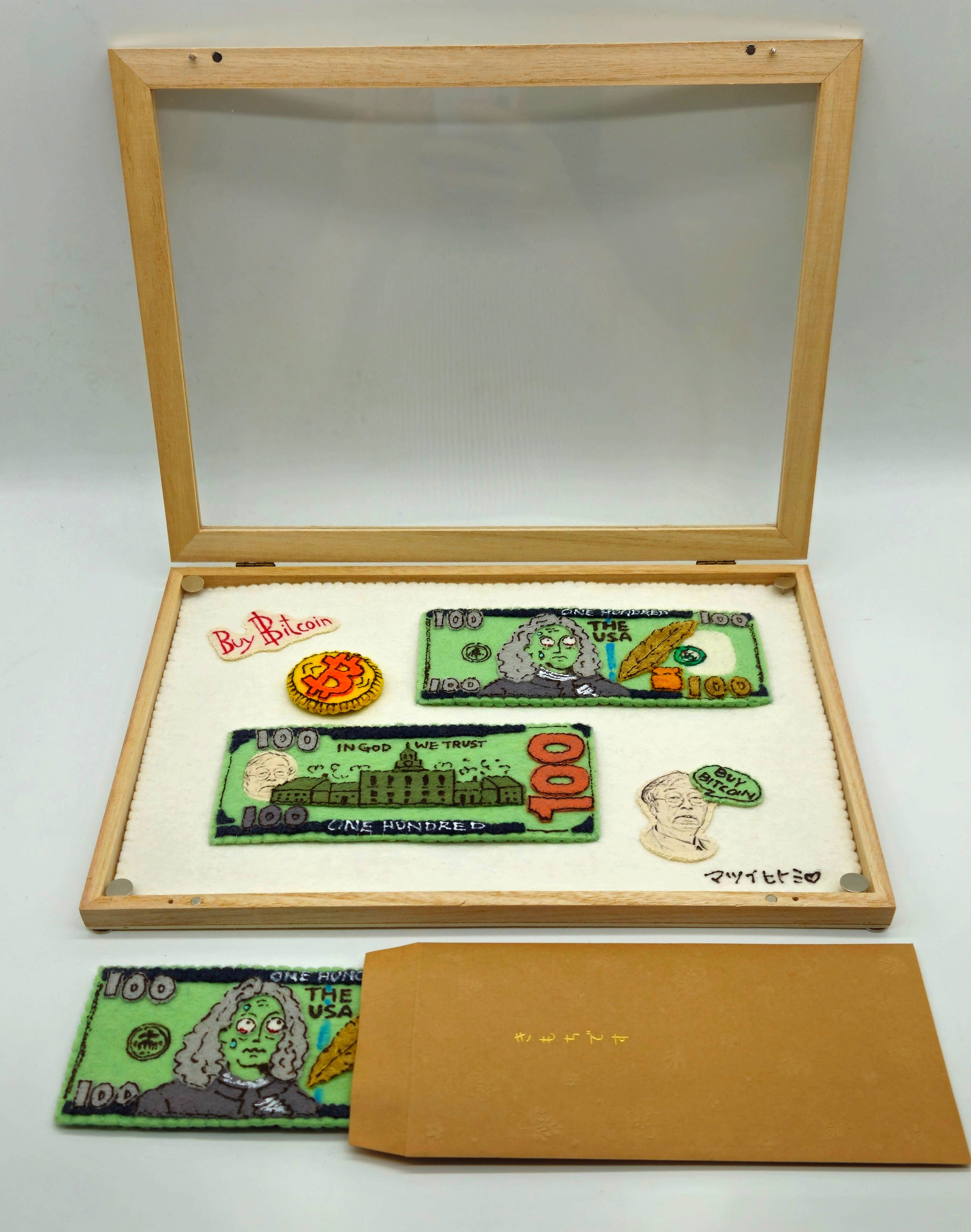 In this satirical textile piece, the familiar imagery of U.S. hundred-dollar bills is reimagined in felt, complete with zombified portraits and hand-embroidered slogans like “Buy Bitcoin.” At the center, a stitched Bitcoin coin radiates as a symbol of alternative value. The piece critiques the illusions of trust and permanence in fiat systems, presenting soft currency as soft fiction. Part of the Never Full series, this work stands alone as both playful parody and stitched provocation. Comes with extra 1 felt 100 USD note in paper bag.