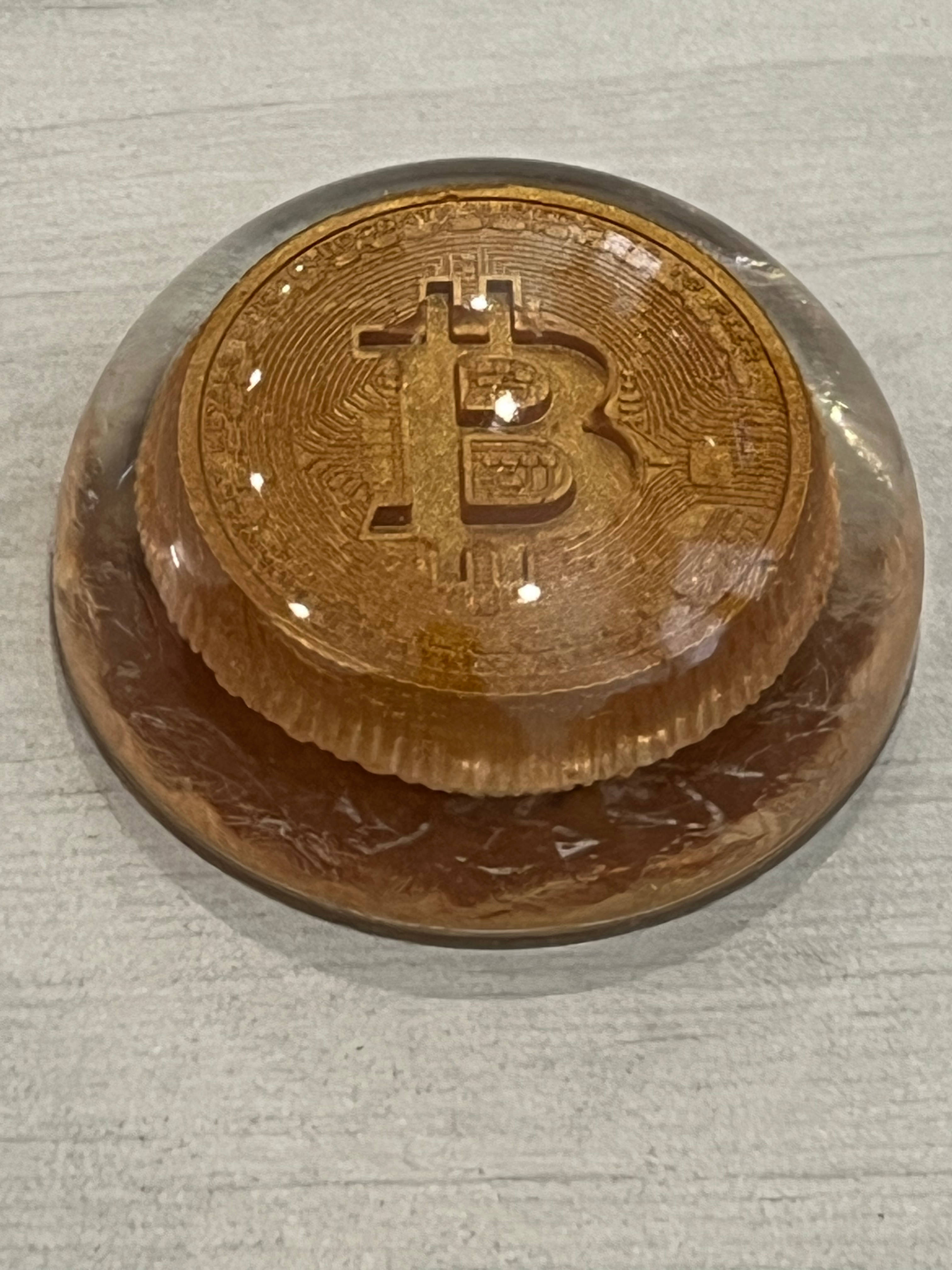 Brekkie Von Bitcoin rare #1/1 handmade small round 3" x 3" x 1" art piece with large plastic gold bitcoin coin inside a clear round of resin. A special piece I bought off him direct at TNABC Miami 2019 which he will vouch for.