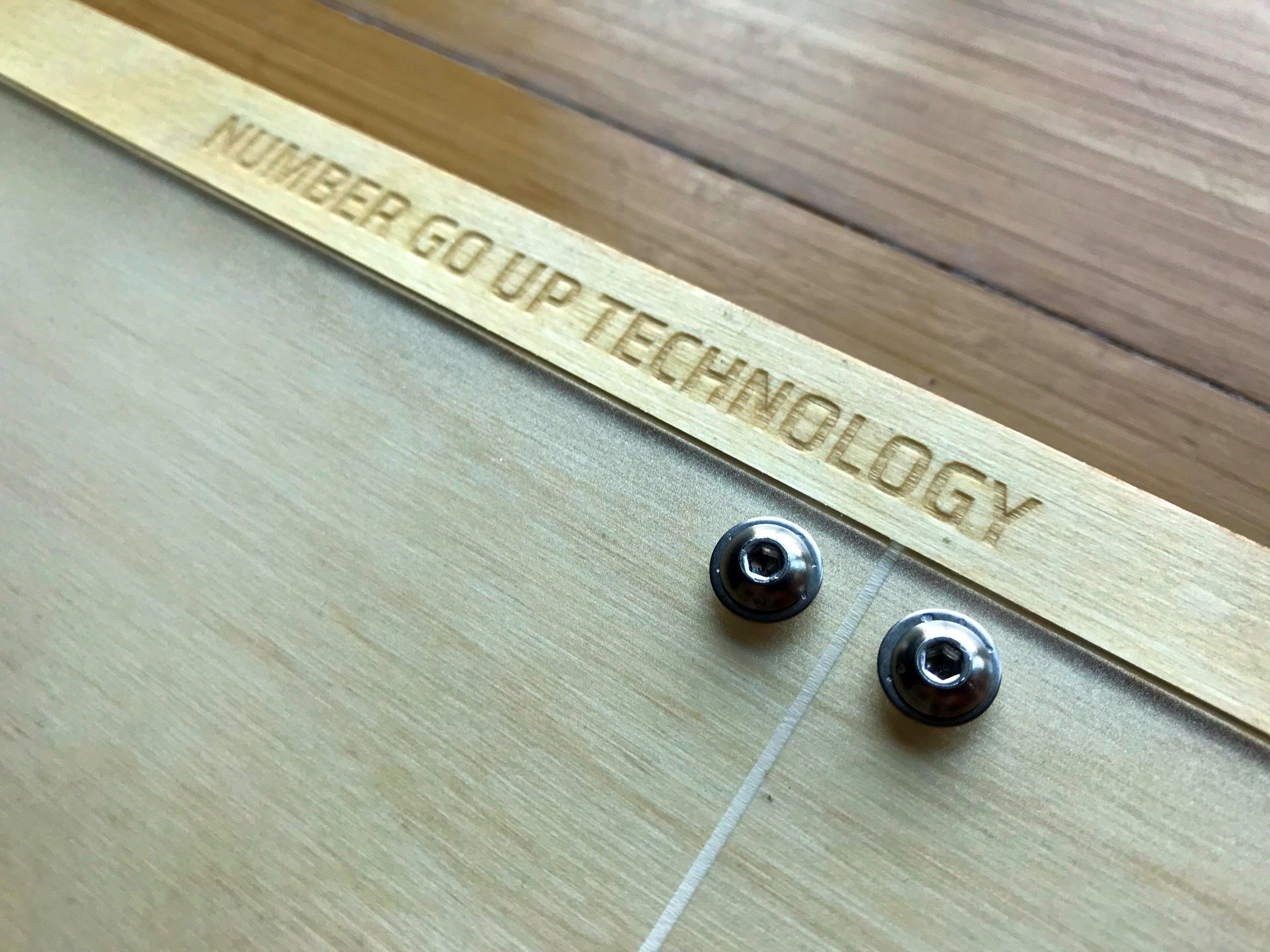 Chart 3 displays a logarithmic BTC USD quarterly average price chart that spans from Q4 2009 to Q4 2021. The X and Y axes are marked with laser engraved units of the price in USD as well as the quarter and year of each vertical bar. A translucent frosted acrylic panel is engraved with markings for the halvenings. The entire piece is held together by stainless steel screws. The wood is finished with an all natural, non-toxic blend of pure linseed oil and beeswax. The back of the piece is outfitted with strong piano wire, rubber bumpers and heavy duty steel hangers making it ready to display.