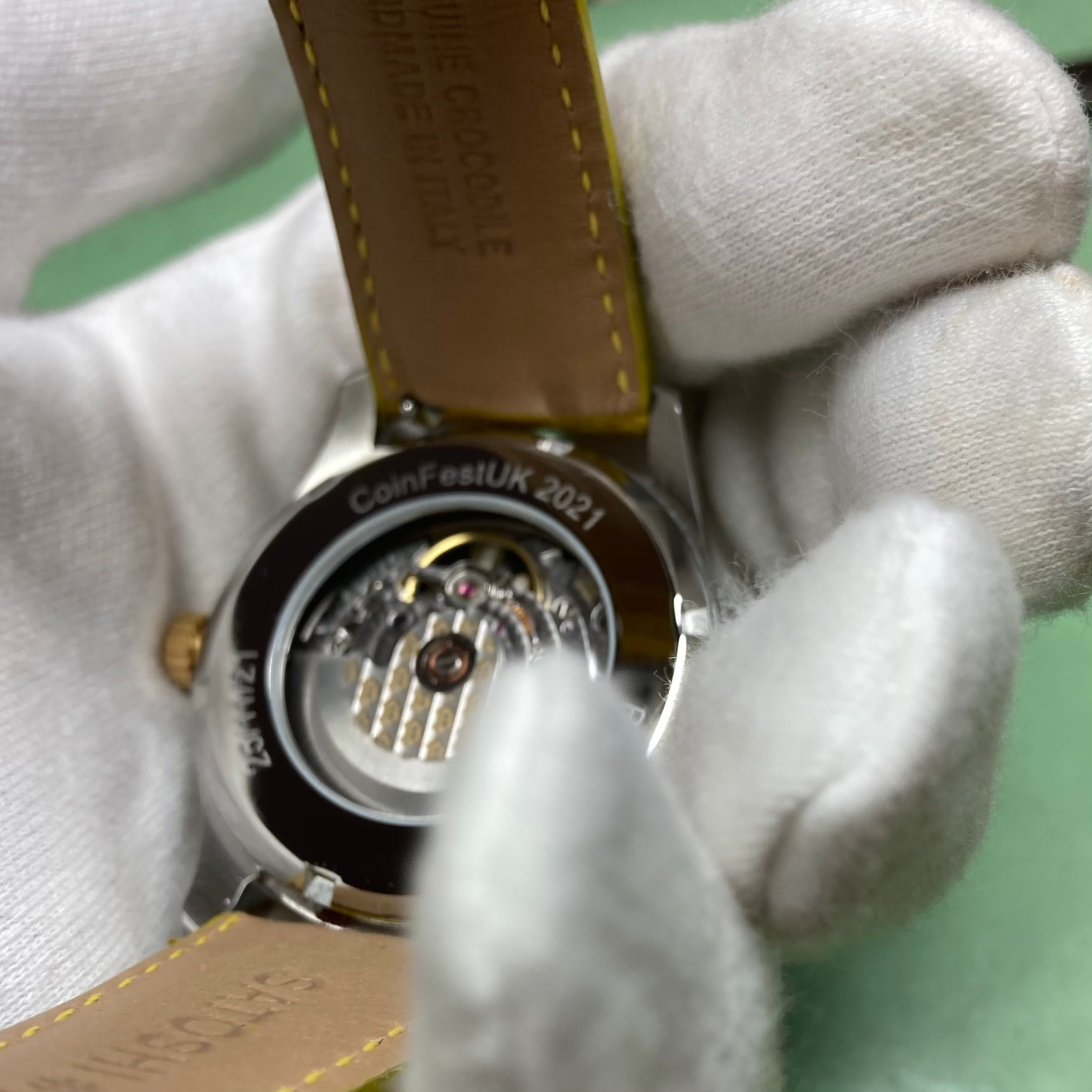 Gold plated bezel, Swiss made automatic movement, self-winding, 'perlage' on the base plate and the bridges, 256 parts, 40 hours power reserve Rotor with 'Geneva' finishing and Bitcoin symbols engraved, Black dial, with applied indices and Bitcoin pattern, 10 ATM water resistance, Genuine yellow crocodile leather strap, with stainless steel folding buckle, piece unique, engraved on the back