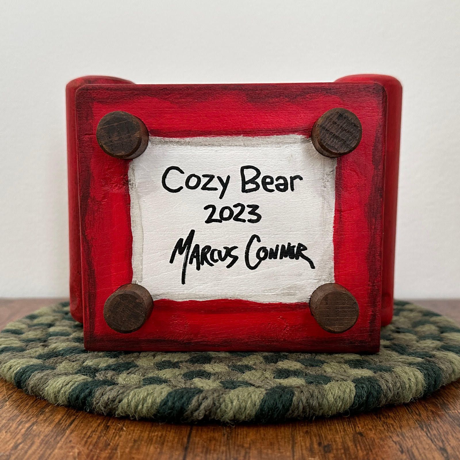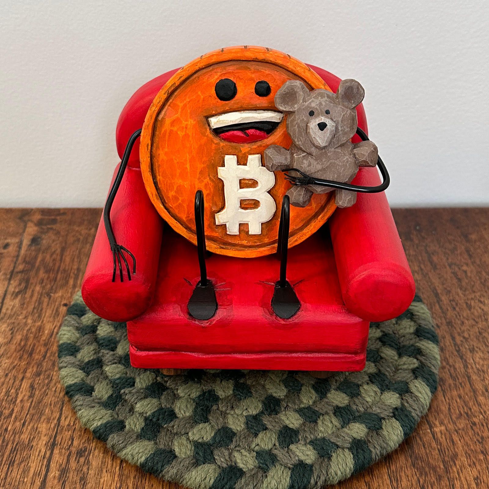 The Bitcoin Guy is cozying up on his comfy chair holding his bear. He's not letting go through the market downturn. He just settles down and holds on tight. This sculpture is mostly cut and carved from wood. The limbs are made from aluminum wire which is coated. Painted with acrylics and coated with a wax and oil mixture.