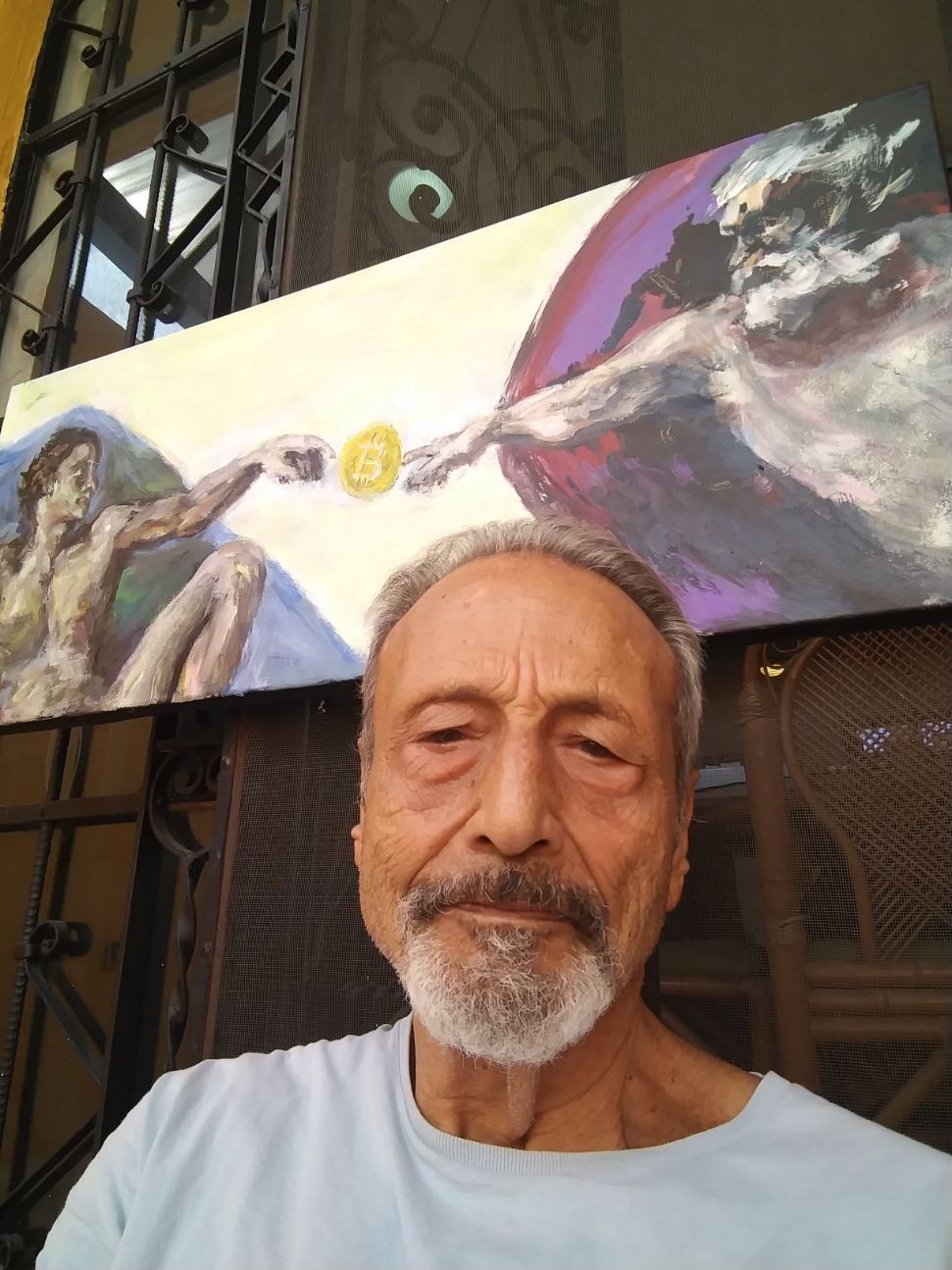 Therefore, his 39" x 21" acrylic on canvas, "The Creation of Bitcoin.”