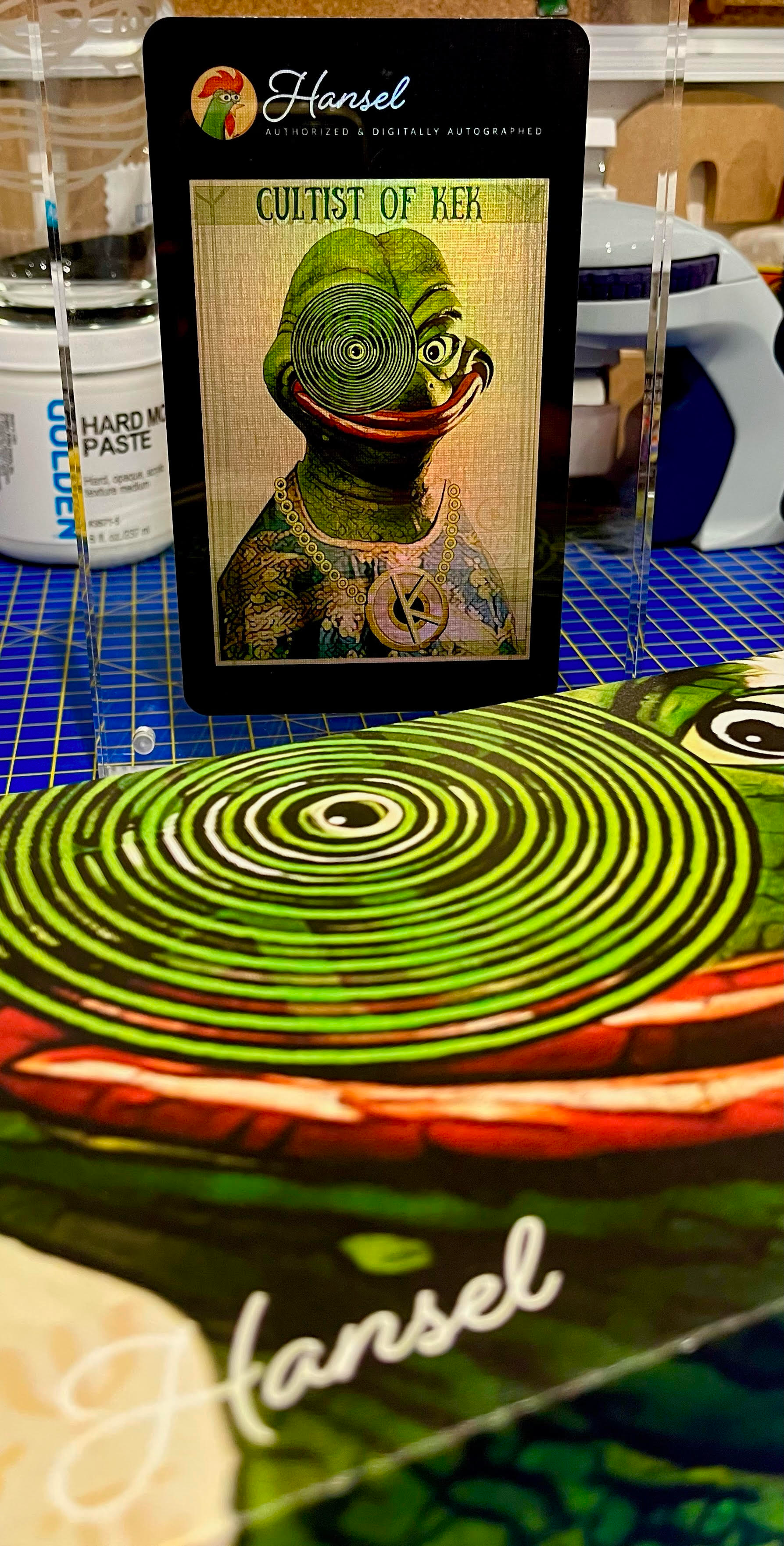 This lot also includes a 1/100 CULTOFKEK Rare Pepe digital token either loaded onto the Xcer card or sent to a Counterparty wallet of your choosing.