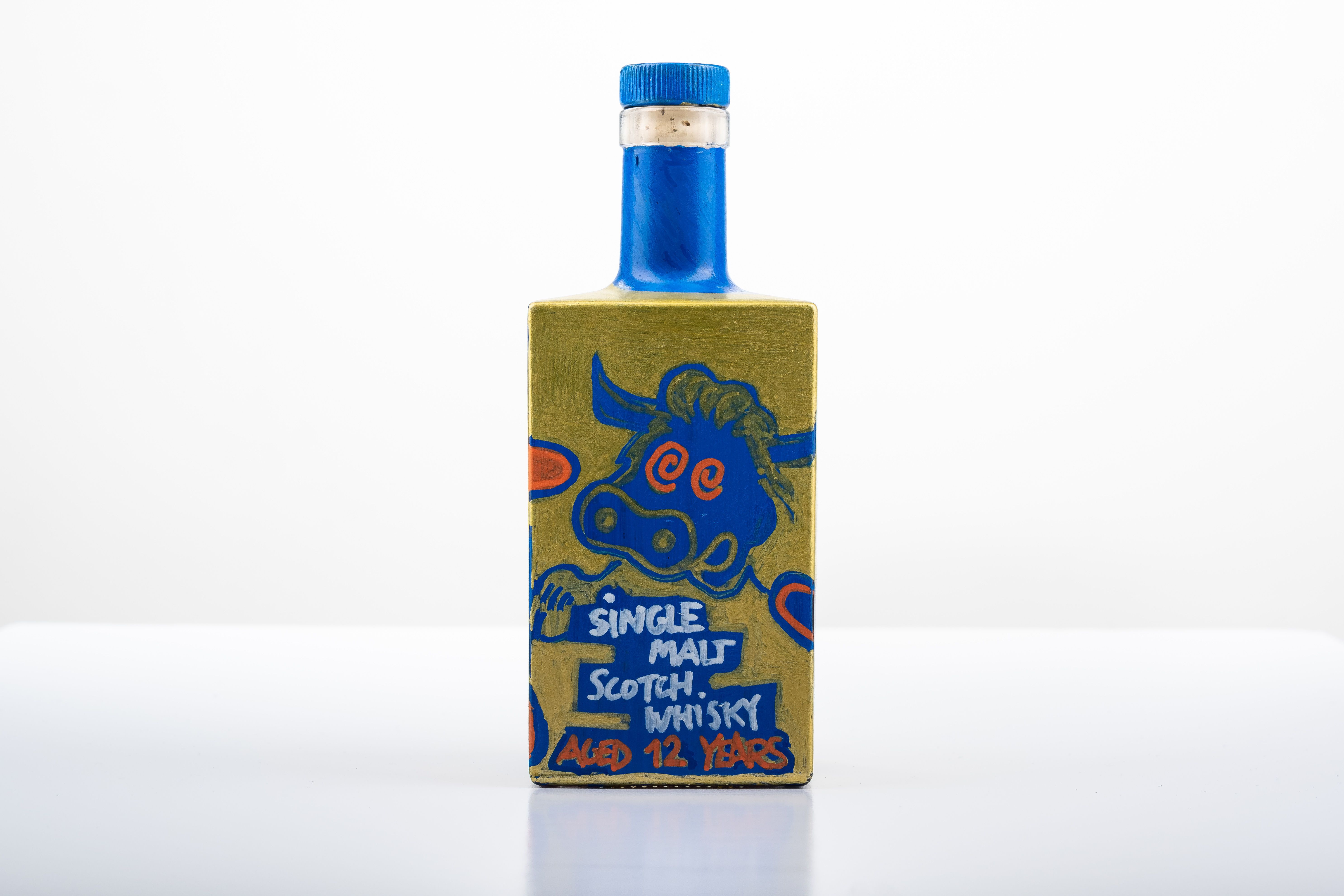 Limited edition Dim Zayan hand painted bottle of Genesis Block whisky.