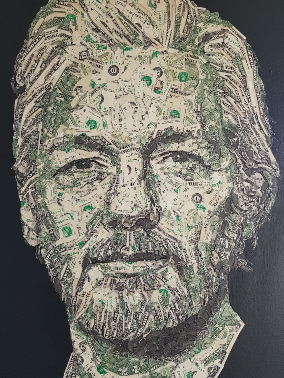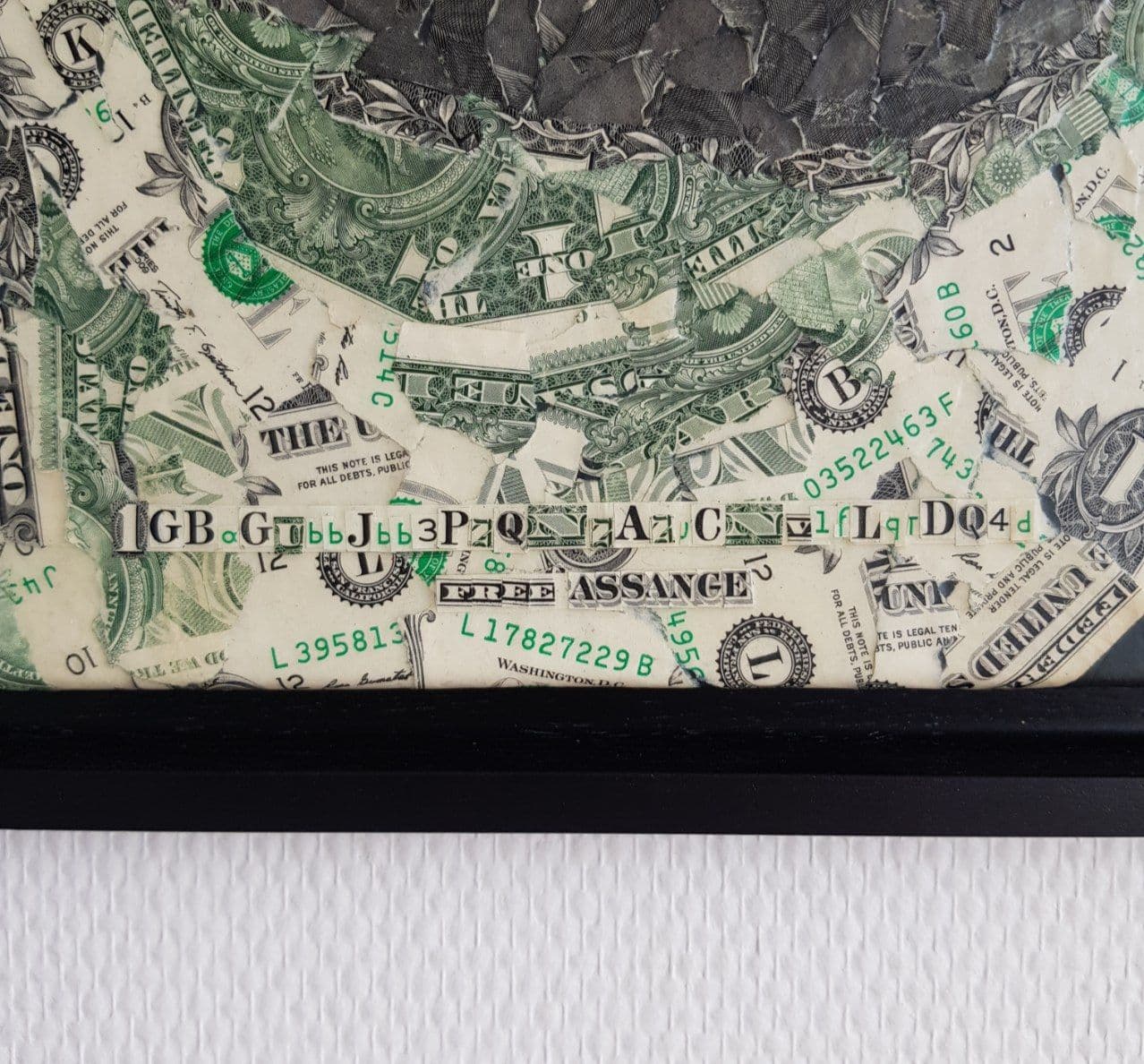 Dollars Assange is an original work by Pascal Boyart made of one hundred real $USD bills, ripped and glued on canvas.