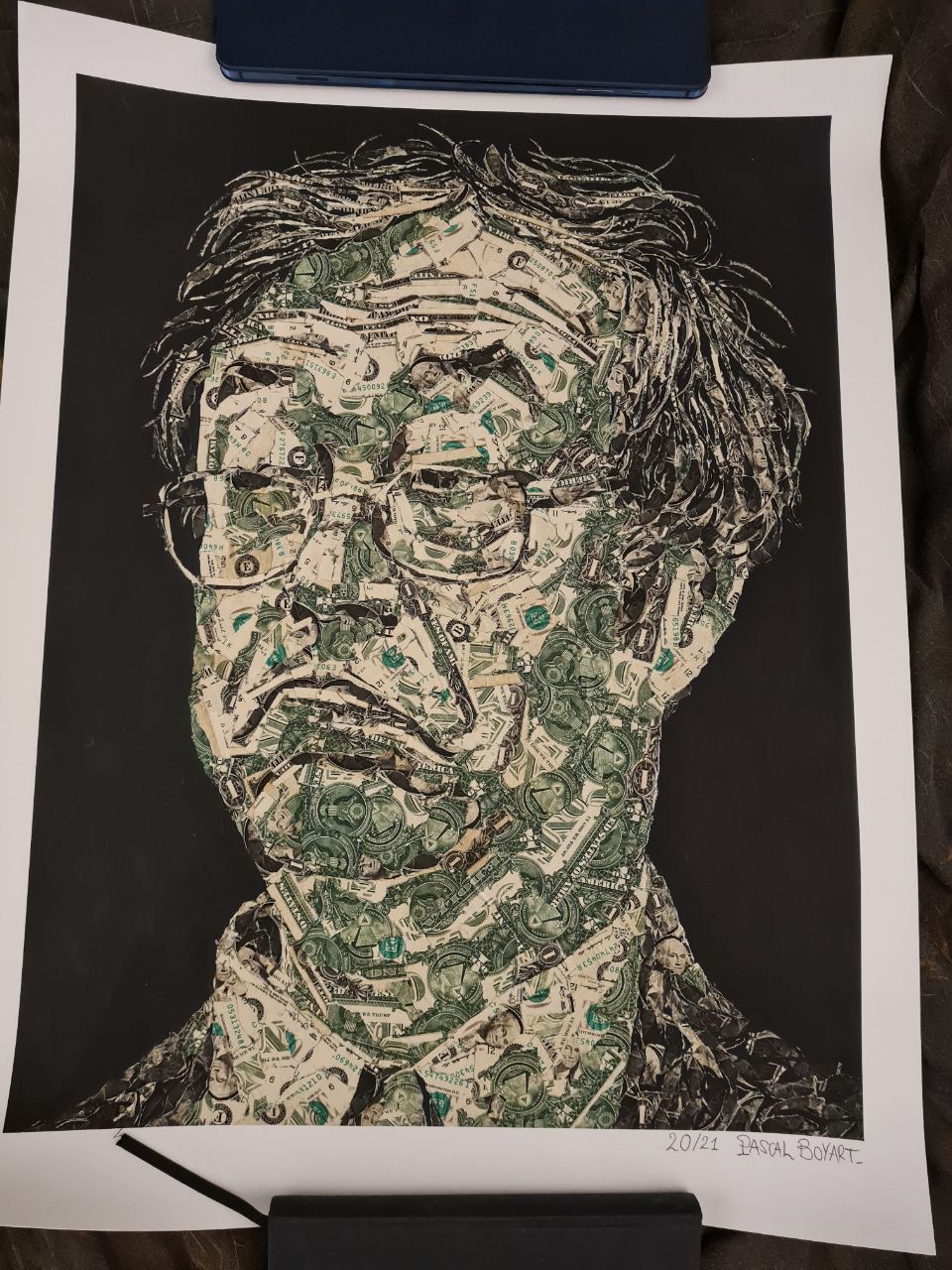 The original artwork has been realized by Pascal Boyart in 2018, it was made of real ripped Dollars bills glued on canvas.