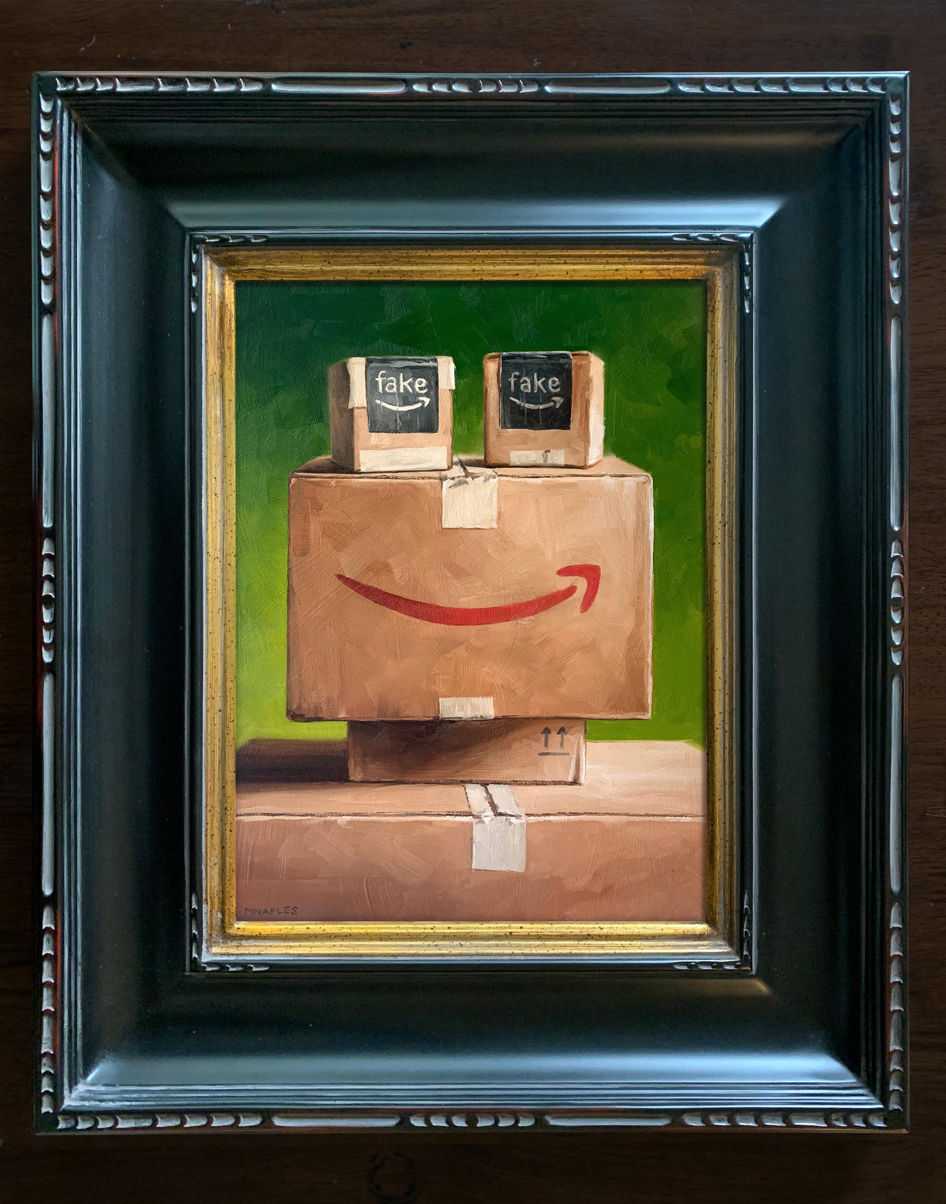 This piece is a merging of my still life work and the Pepe world. A creative stacking of specific boxes gives a distinct frog shape with a recognizable smile :) That red smile seems to be giving an all-knowing smirk. Big brother? Big sister? Big Pepe? Who knows, but one thing is for sure, this amazon is FAKE.