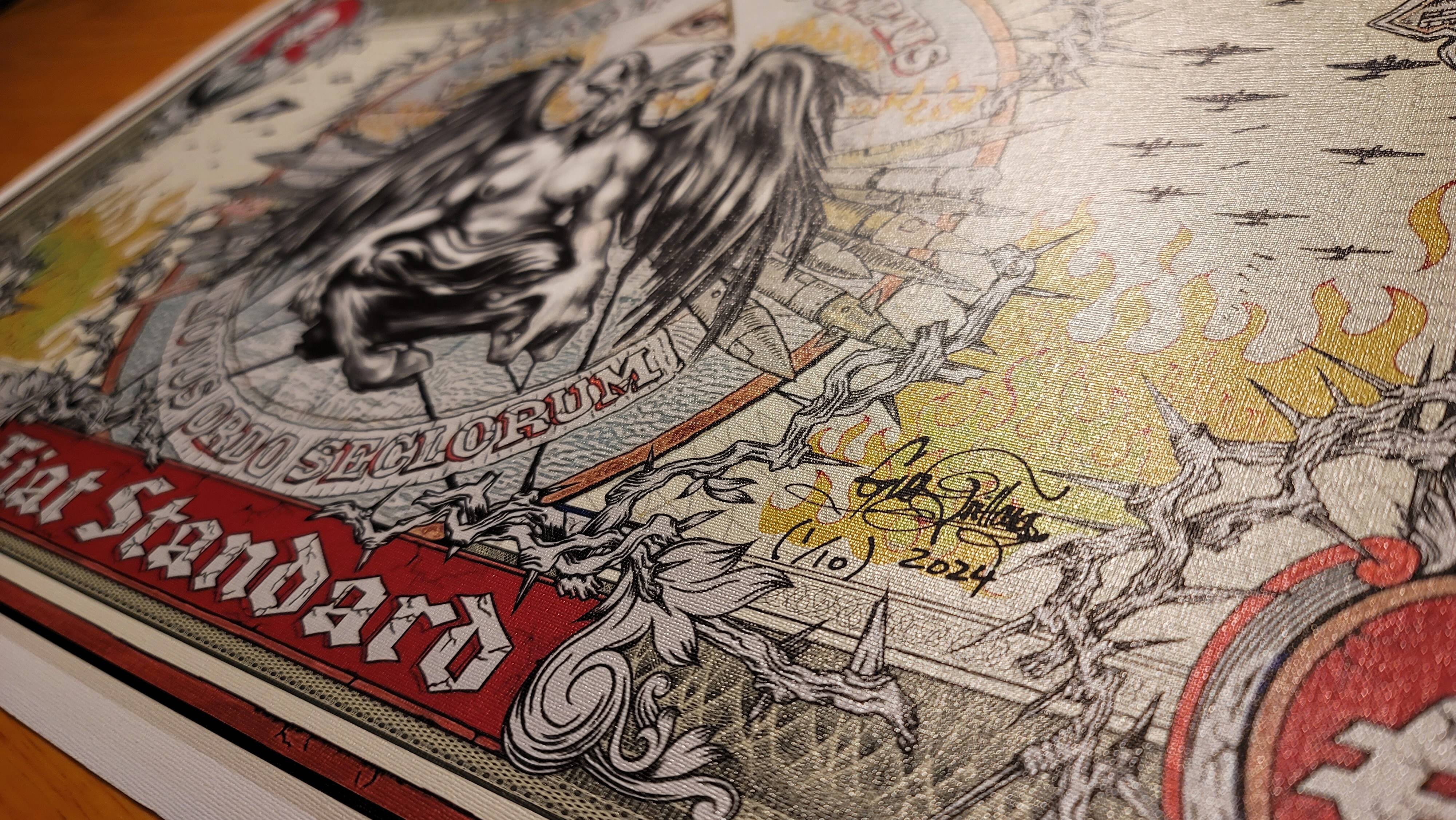 Giclee print on metallic canvas, a 1 of 10 reproduction of the original Fiat Standard Painting that is part of the Bitcoin Magazine Museum. 36x61 cm