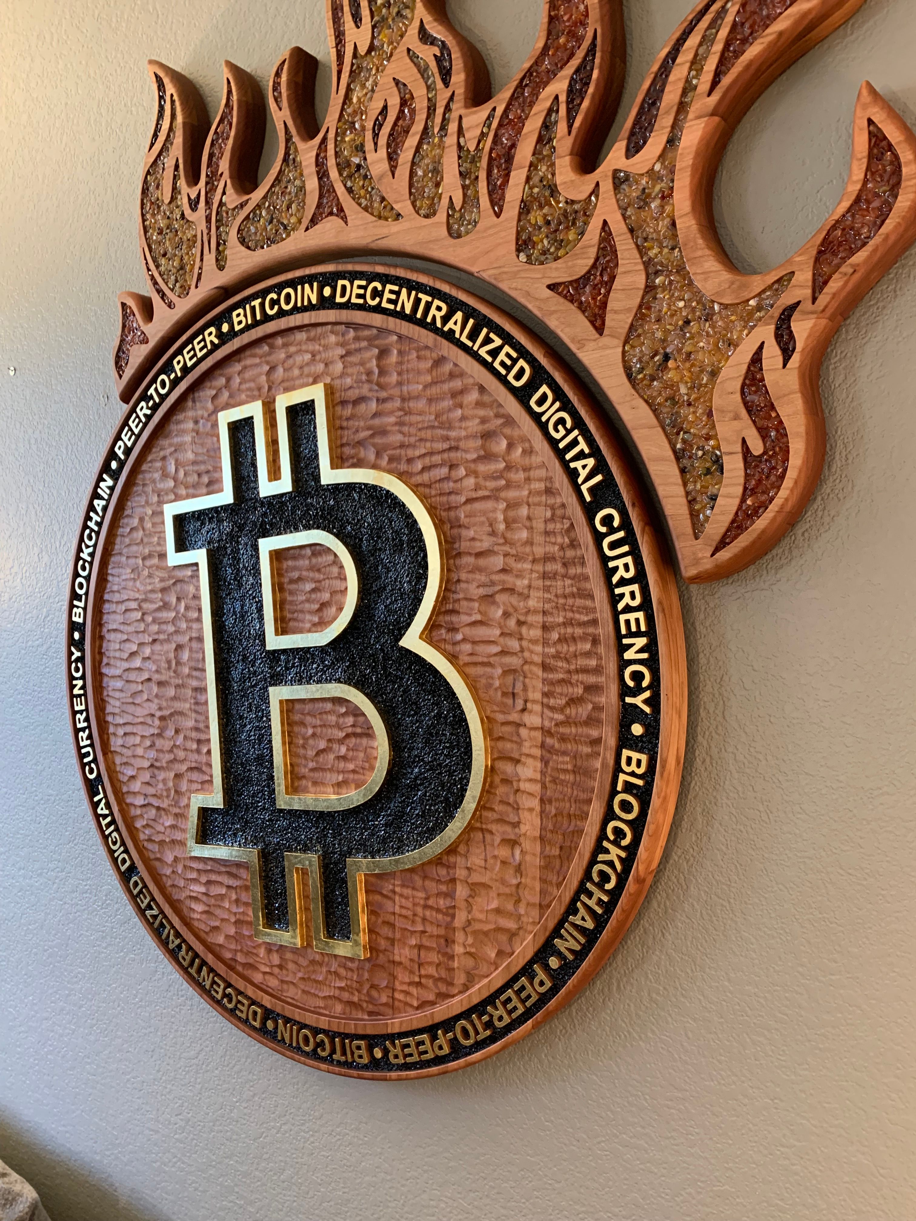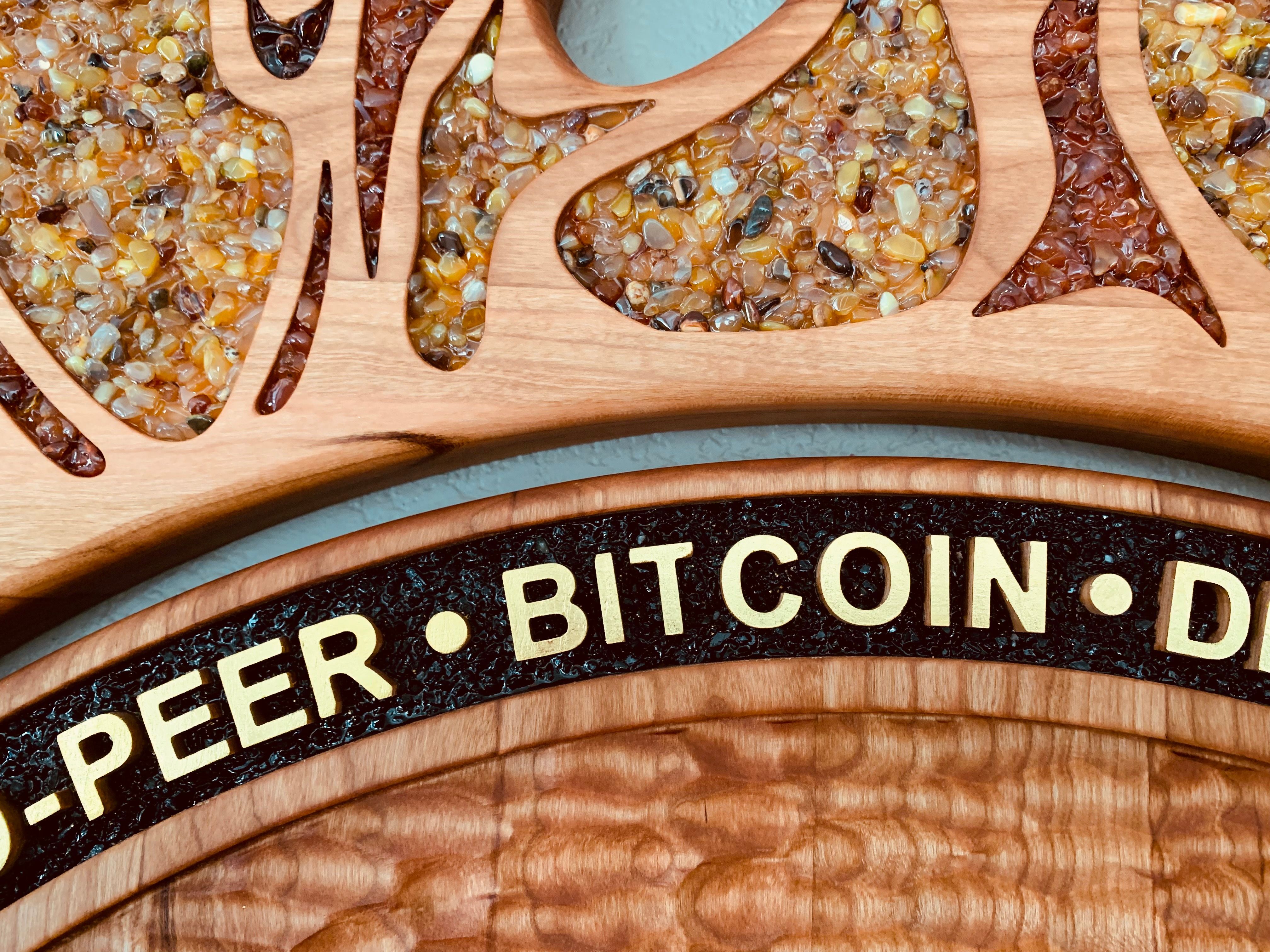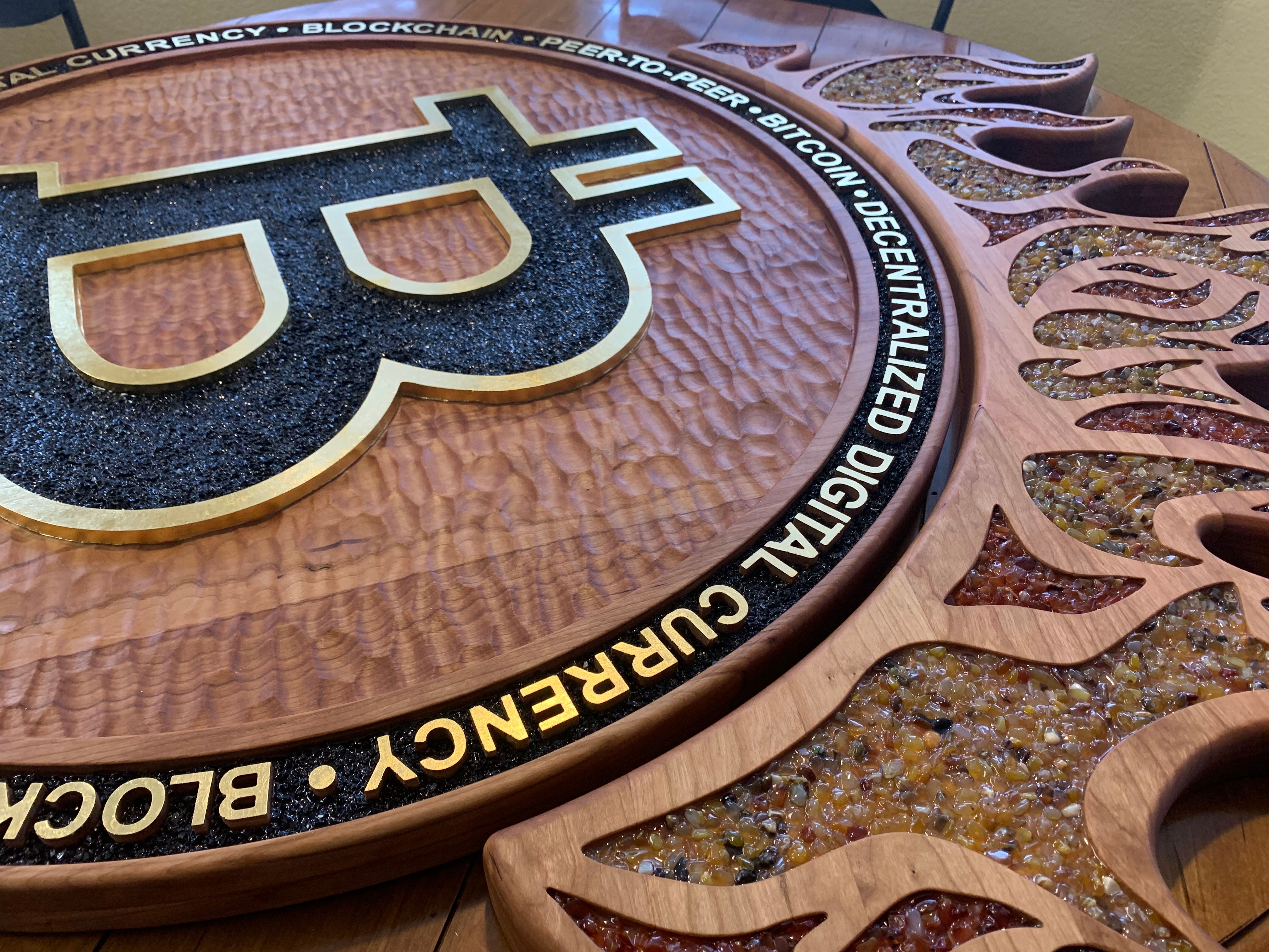 The black stone inlay in the Bitcoin and surrounding letters is Black Schorl Tourmaline from Brazil. The flames are inlaid using fine, semi-precious tumbled stone including Chalcedony, Garnet and Carnelian. All stone is inlaid using UV inhibit casting resin.